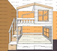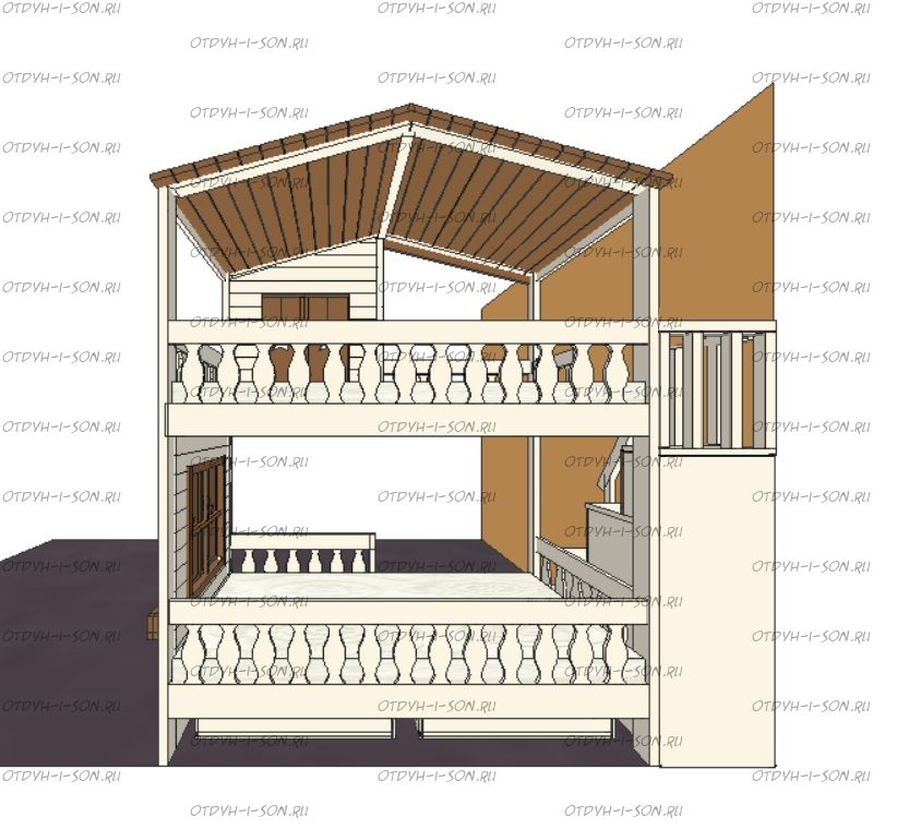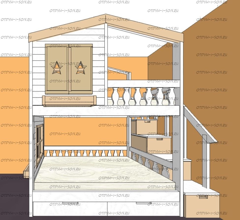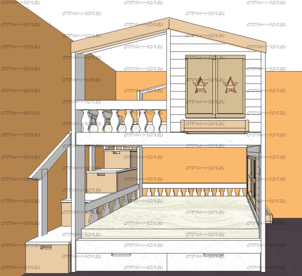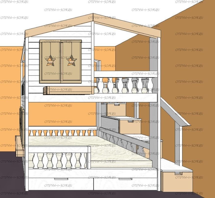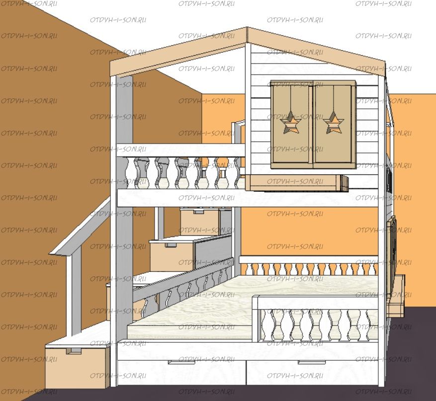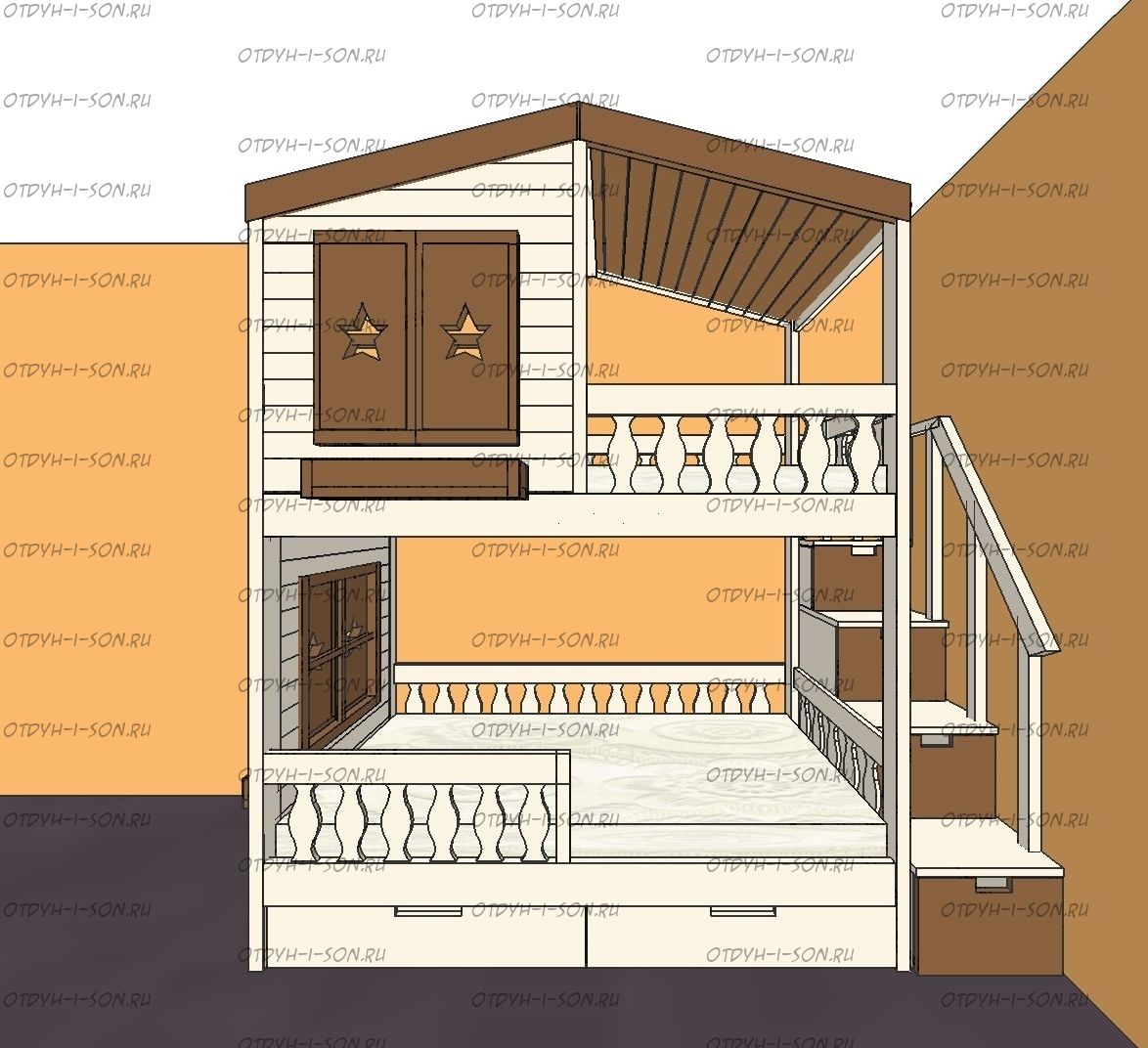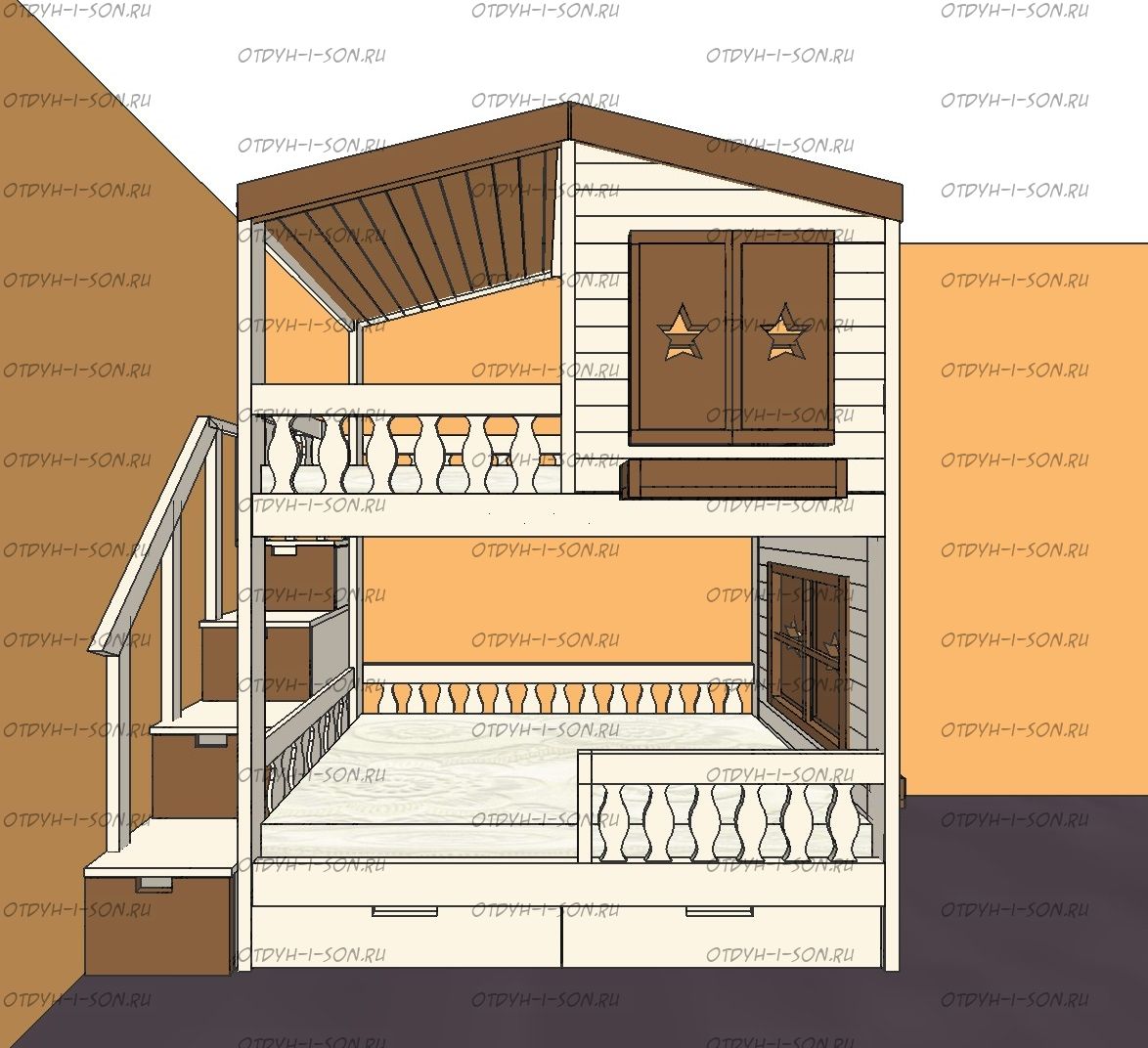 Кровать двухъярусная, Кровать-домик Roof может быть изготовлена с кроватью для новорожденного внизу или как трехъярусная кровать, а также в любых размерах и цветах. Характеристики: любые размеры, цвета любые материалы: массив сосны, березы или бука