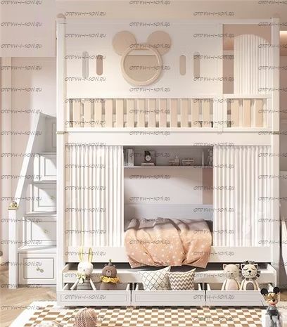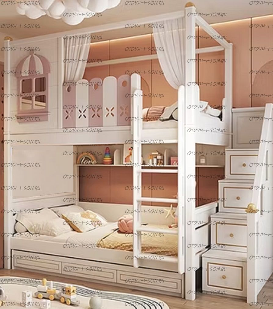 Кровать двухъярусная, Кровать-домик Sky №455 может быть изготовлена с кроватью для новорожденного внизу или как трехъярусная кровать, а также в любых размерах и цветах. Характеристики: