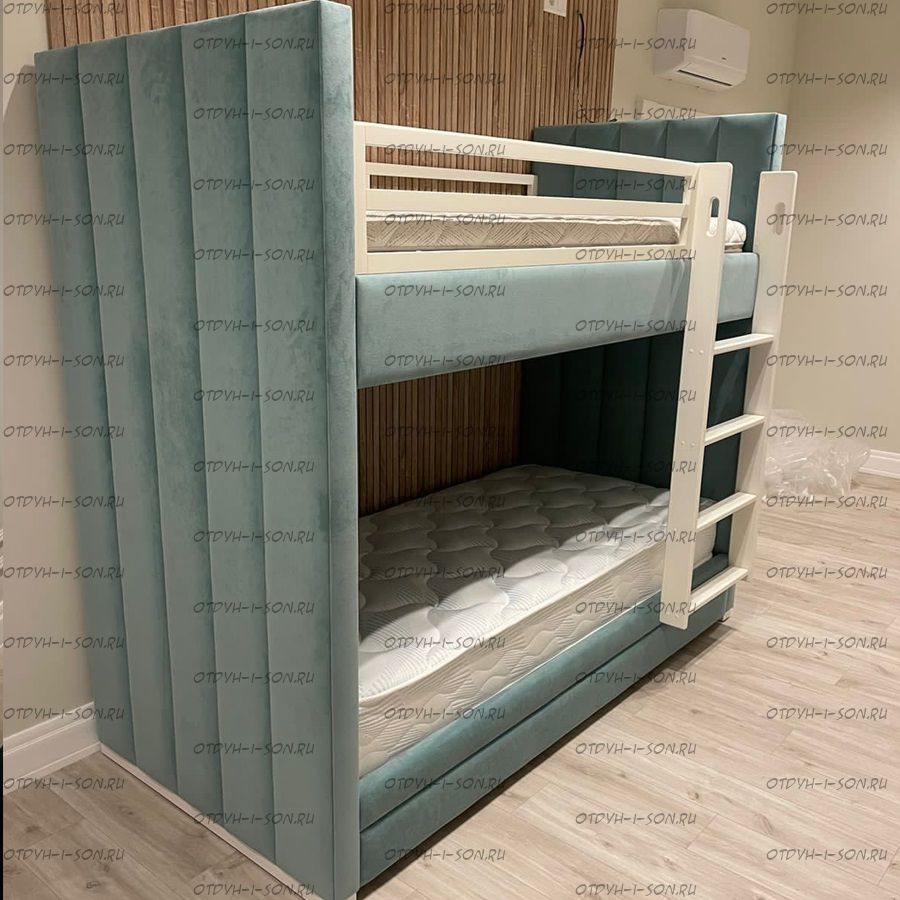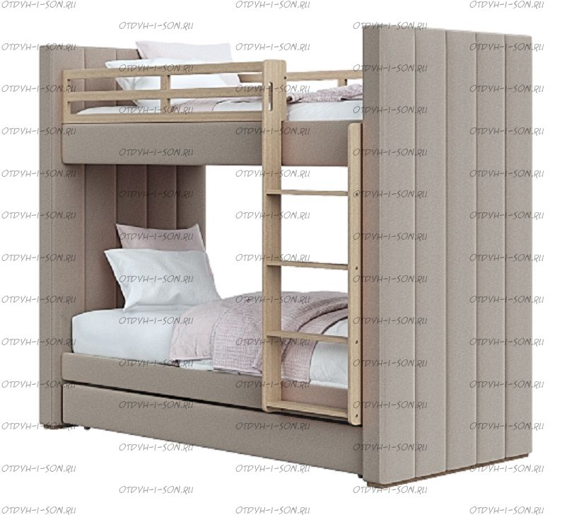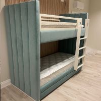 Кровать двухъярусная Кэролин Характеристики: Размер спального места: 80х190 и 80х190, 90х180 и 90х180 или 90х190 и 90х190 см. или любые другие размеры Внешние габариты: Материалы: бук, береза Обивка: ткань микрошенилл В комплект входит вместительный ящик для хранения постельный принадлежностей или игрушек. Заглубление матраса: Просвет под кроватью: Расстояние от пола до верха ламельного основания: Глубина бельевого ящика в варианте с выдвижным ящиком: Подъемный механизм: нет в базовой комплектации.