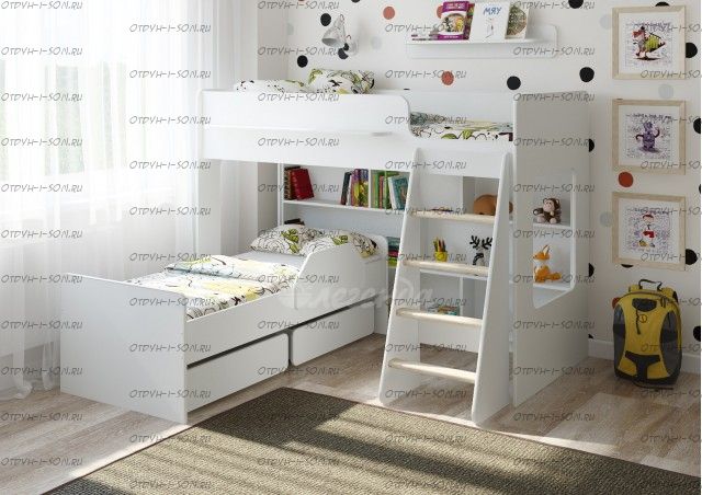 Под верхним спальным местом в игровой зоне располагается стеллаж. Стеллаж отлично подходит для хранения игрушек, удобен для поддержания порядка и сортировки предметов.
