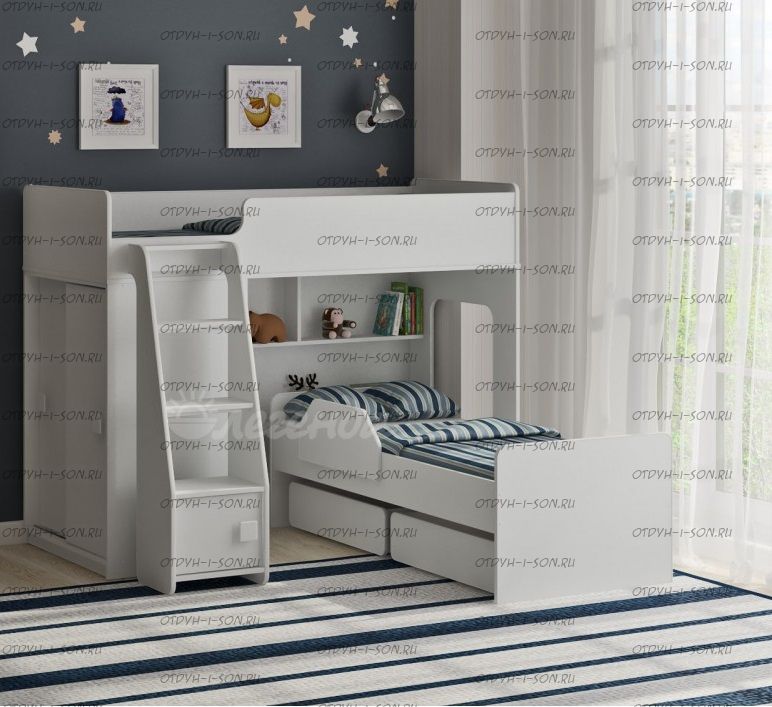 Кровать двухъярусная Легенда 42.5.2 Комплектация Кровать-чердак Легенда 42.5 Габариты (Д×Ш×В): 1790×808×1405 Детская кровать Легенда 27.1 белая Габариты (Д×Ш×В): 1644×754×544 Лестница прямая ЛП-42.2 (Легенда 42.1- 42.5) Габариты (Д×Ш×В): 360×386×1213 Характеристики: Размер верхнего спального места: 75Х175 см. Размер нижнего спального места: 70х160 см. Внешние габариты кровати вместе с лестницей (ДхШхВ): Корпус : ЛДСП, 16мм. Высота изголовья: по запросу Высота изножья: по запросу Высота днища: по запросу Нестандарт: нет Вес: Объем: Цвет корпуса: белый Цвет фасада: белый, лен голубой, розовый, лайм Предоплата: нет
