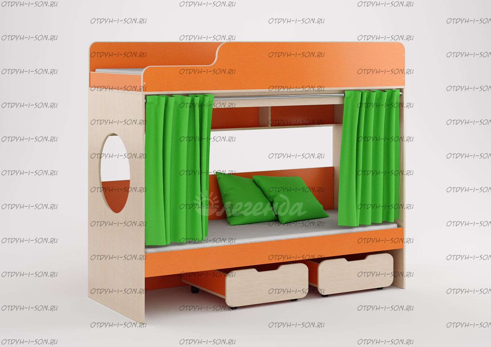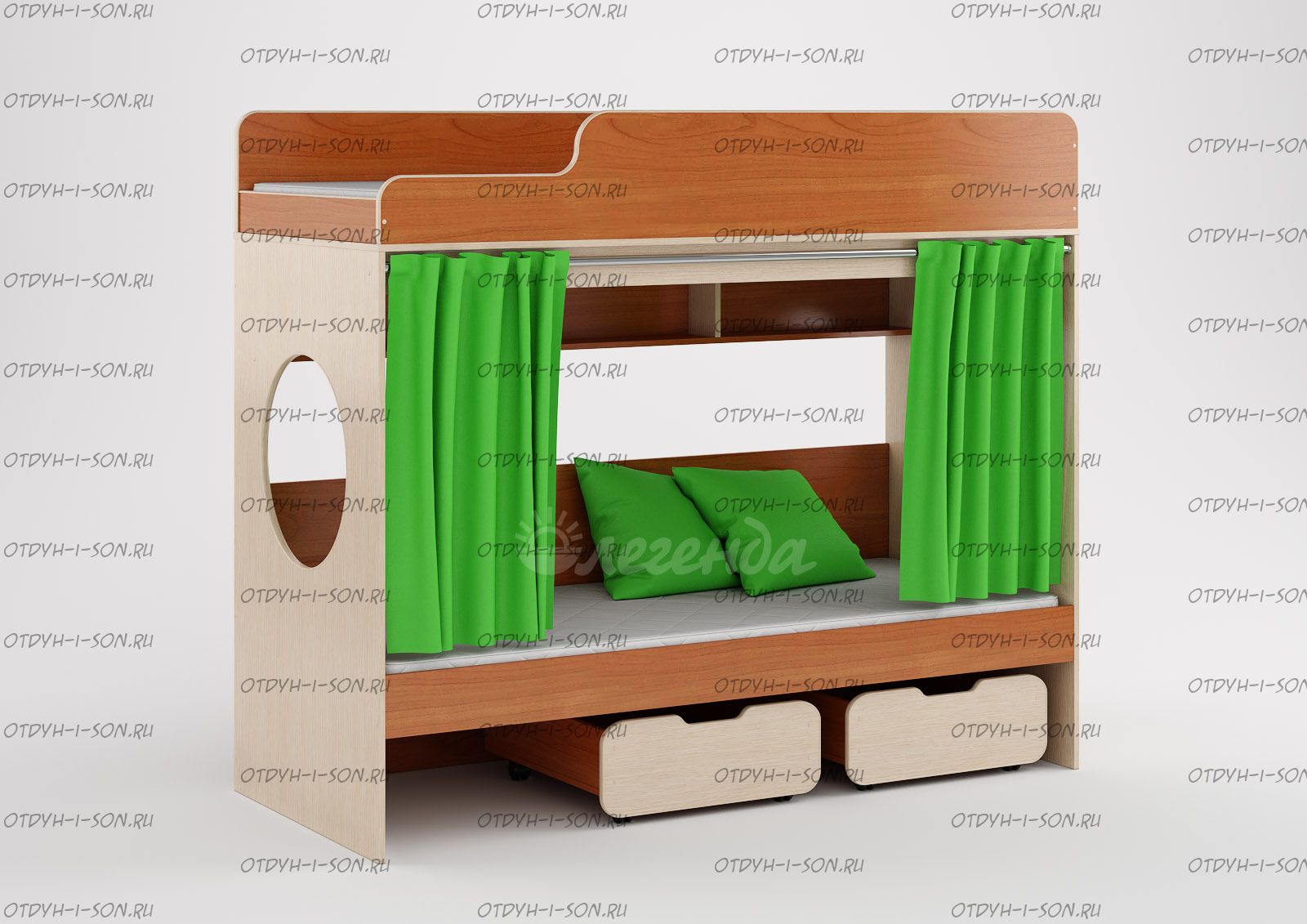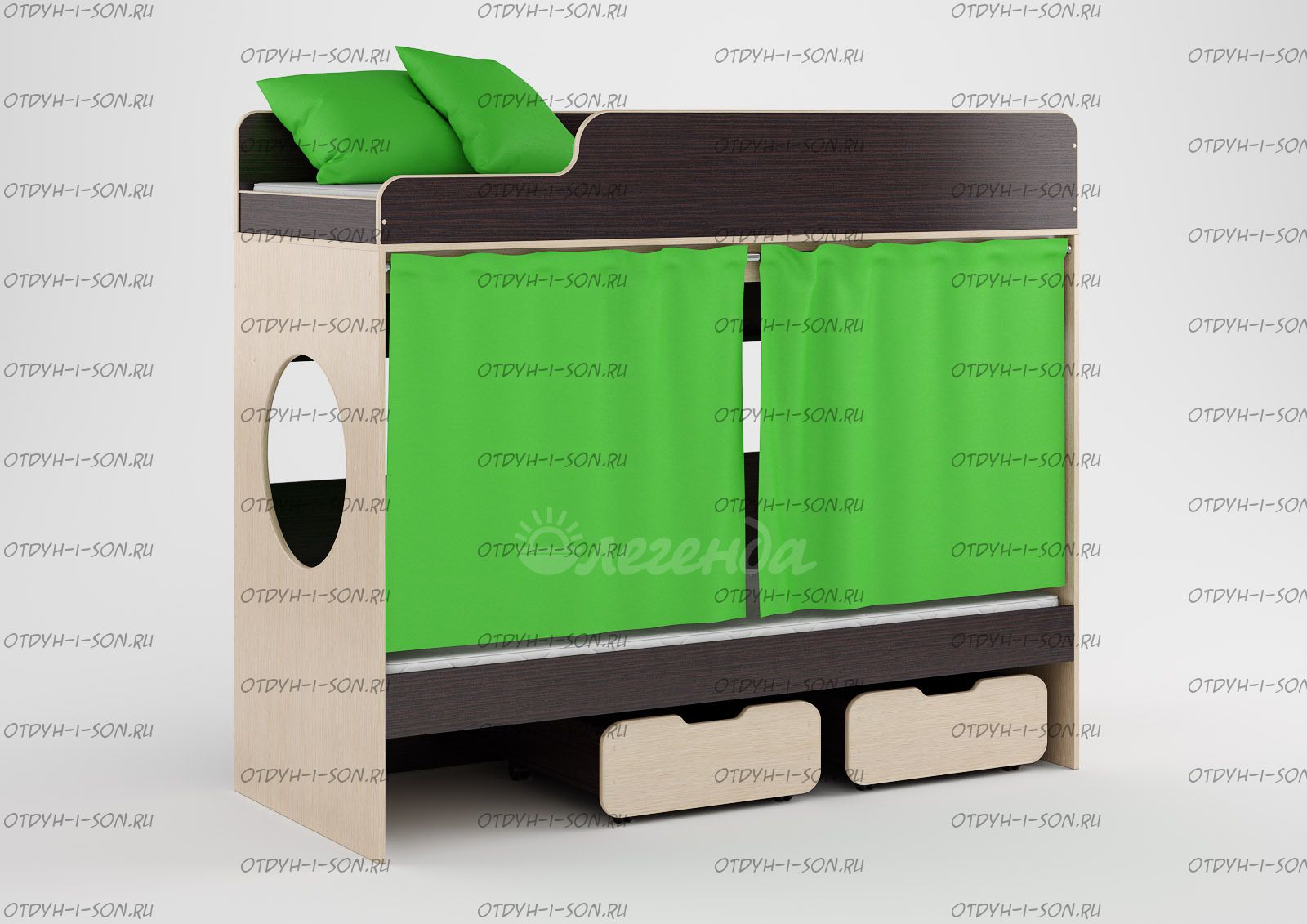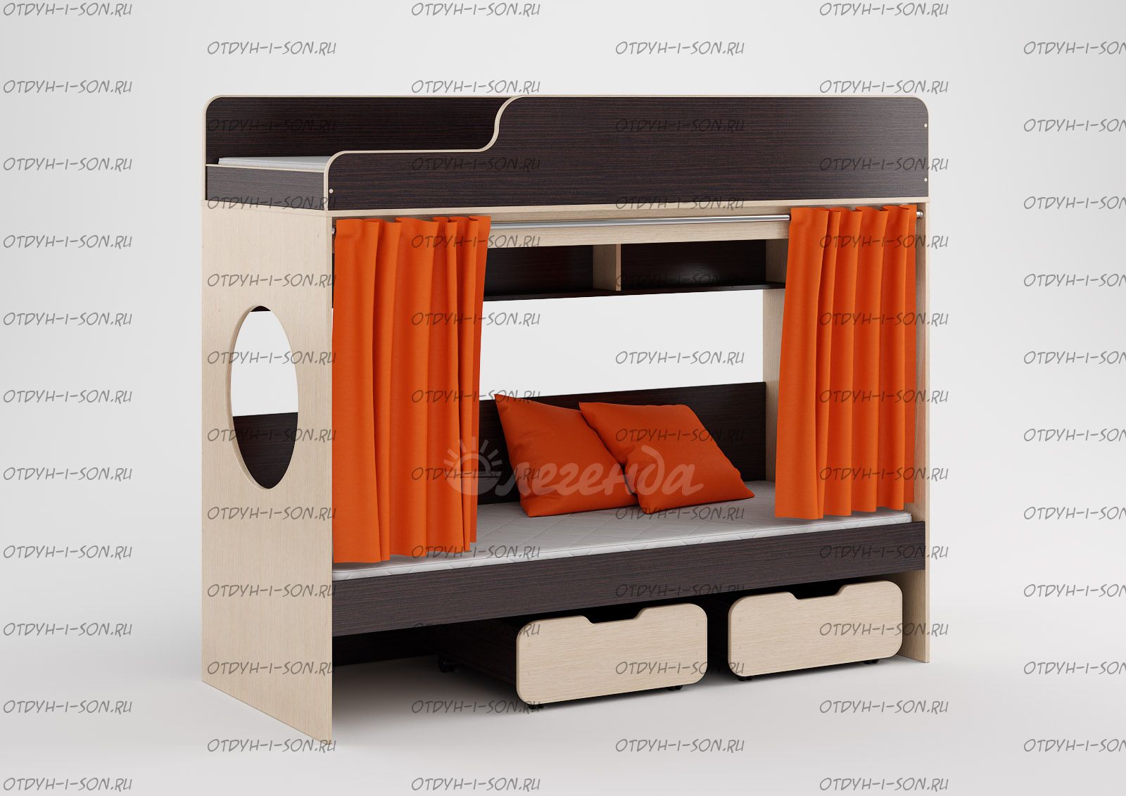 Кровать двухъярусная Легенда-7.0 Комплектация: Кровать двухъярусная Легенда-7, 1 шт. Встроенный стеллаж для книг, Подкатные ящики, 2шт. Шторки докупаются отдельно Характеристики: Спальное место: 80Х190см. Габариты: 1955Х850Х1675 мм. Диаметр круглого отверстия: 50см. Высота от пола до спального места: 25см. Высота бортика верхнего яруса: 30см. Высота бортика нижнего яруса: 10см. Ширина лестницы: 45см. Размеры ящиков: 600*656*220мм. Размеры стеллажа: 1918*150*300мм. Расстояние между спальными местами: 90см. Рекомендуемая высота матрасов: 10см. для верхнего яруса и 10-15см. для нижнего яруса Лестница: кровать универсальна, лестница может быть установлена как с фасадной, так и с боковой стороны Вес: 119 кг. Объем: 0,29 м3 Складская программа по кроватям и матрасам, Все цвета в наличии Цвет корпуса: ольха, венге светлый Цвет фасада: венге светлый, ольха, венге темный, голубой, оранжевый, розовый, лайм