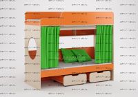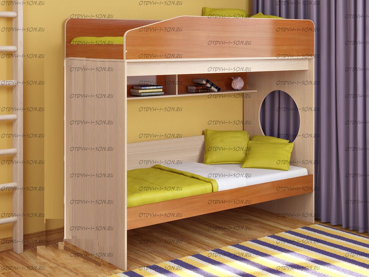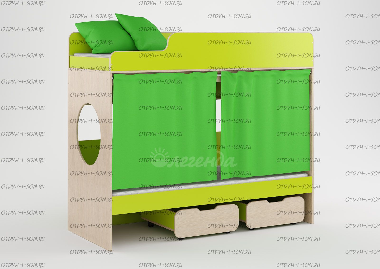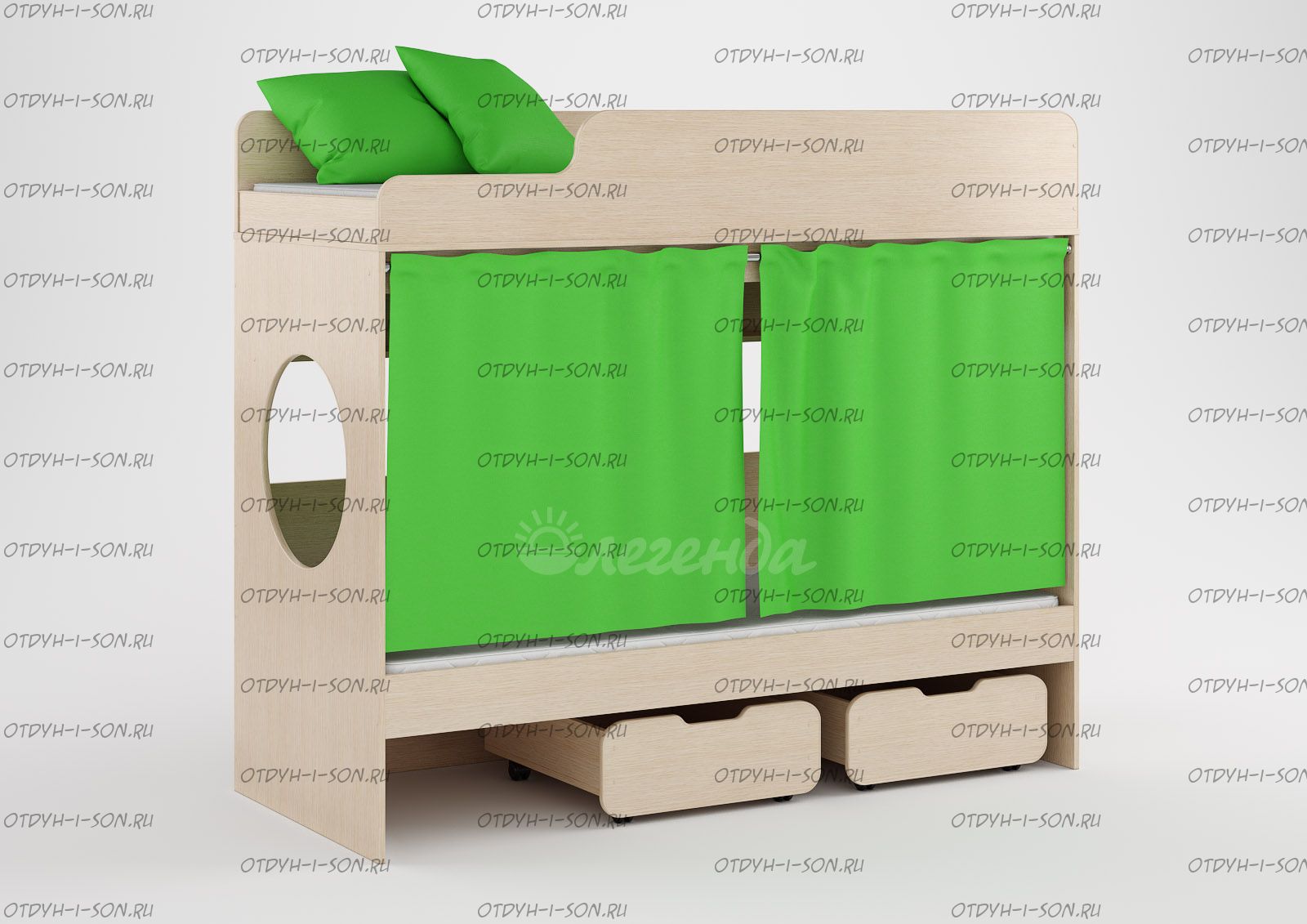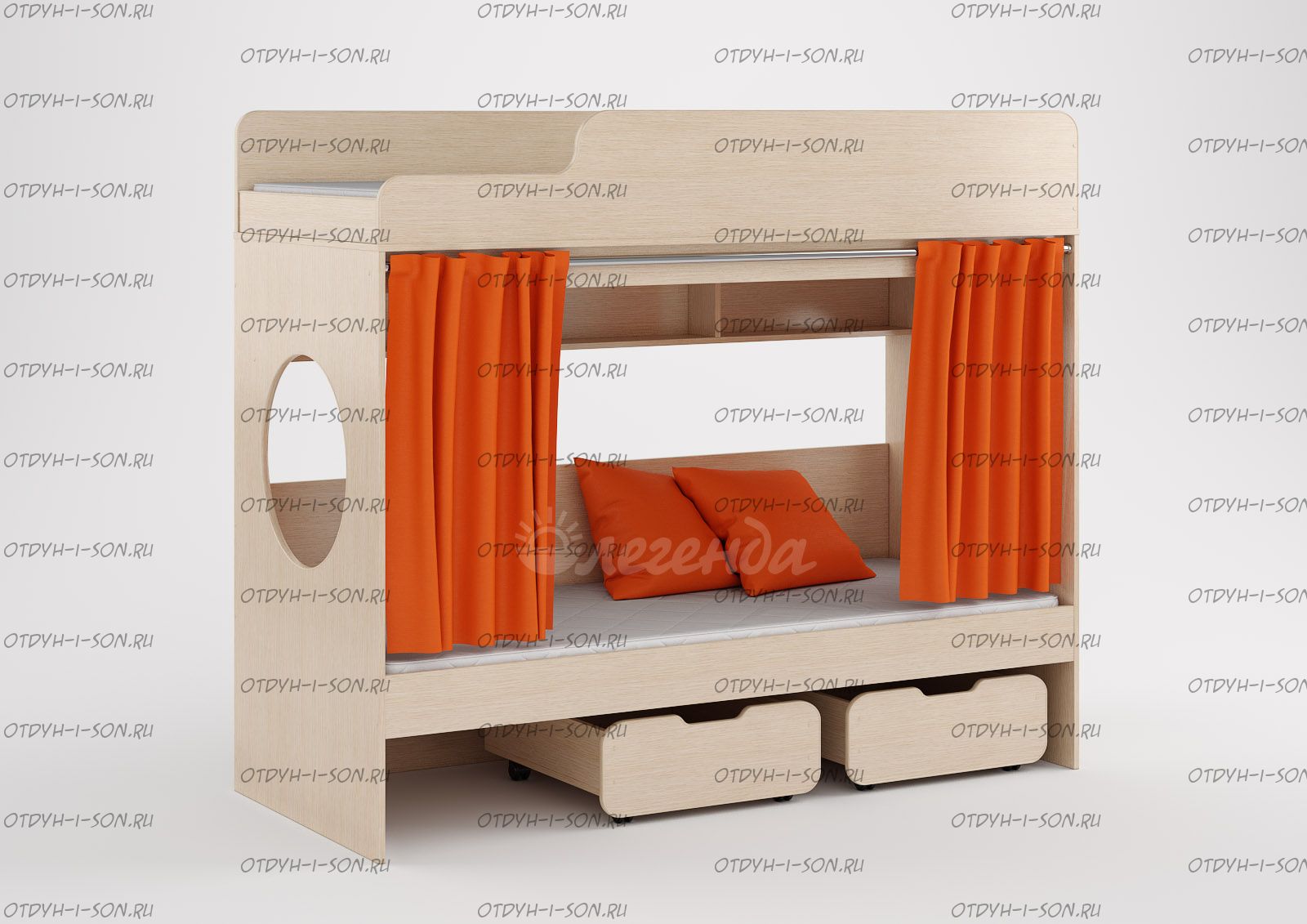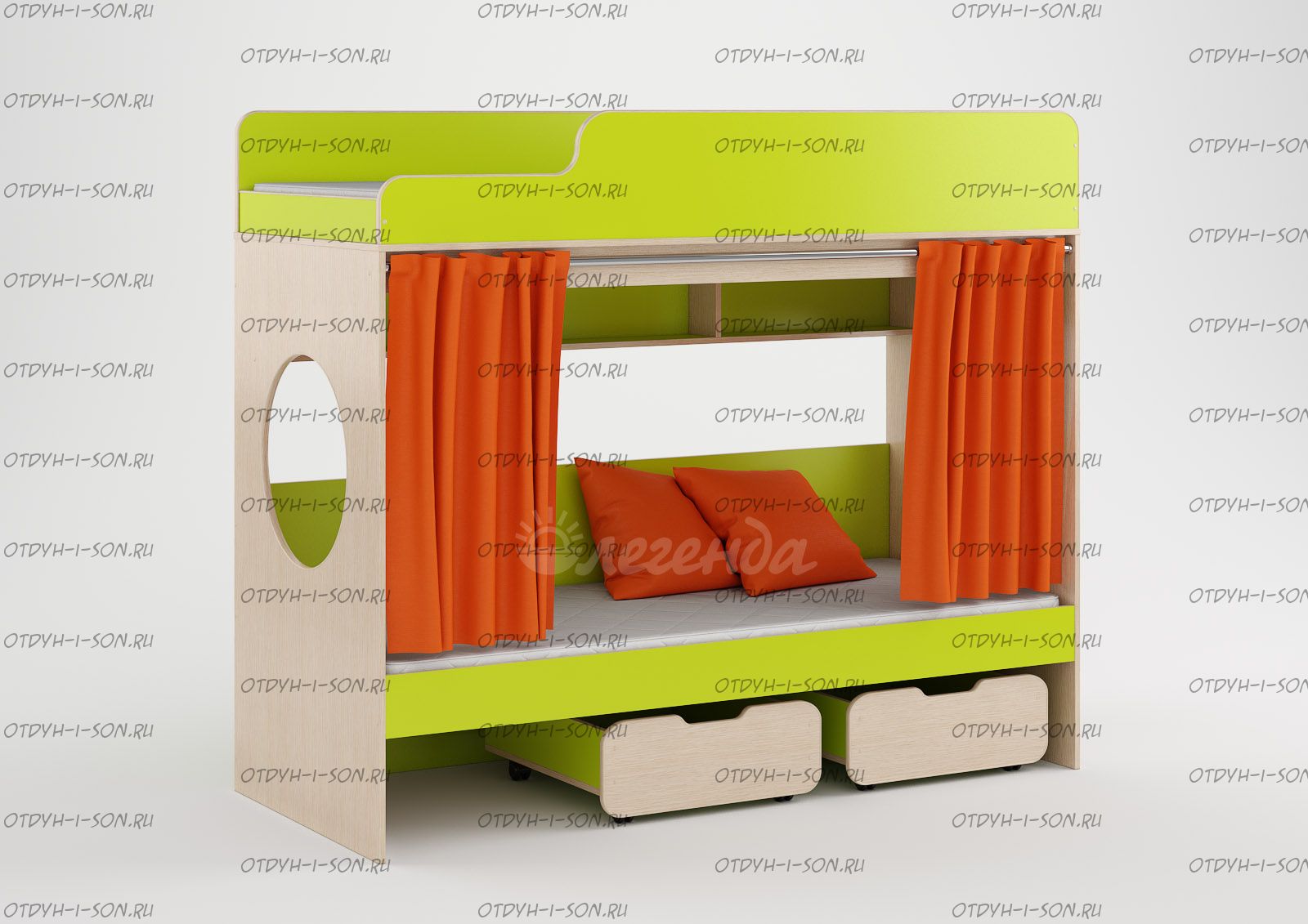 Кровать двухъярусная Легенда-7.0 Комплектация: Кровать двухъярусная Легенда-7, 1 шт. Встроенный стеллаж для книг, Подкатные ящики, 2шт. Шторки докупаются отдельно Характеристики: Спальное место: 80Х190см. Габариты: 1955Х850Х1675 мм. Диаметр круглого отверстия: 50см. Высота от пола до спального места: 25см. Высота бортика верхнего яруса: 30см. Высота бортика нижнего яруса: 10см. Ширина лестницы: 45см. Размеры ящиков: 600*656*220мм. Размеры стеллажа: 1918*150*300мм. Расстояние между спальными местами: 90см. Рекомендуемая высота матрасов: 10см. для верхнего яруса и 10-15см. для нижнего яруса Лестница: кровать универсальна, лестница может быть установлена как с фасадной, так и с боковой стороны Вес: 119 кг. Объем: 0,29 м3 Складская программа по кроватям и матрасам, Все цвета в наличии Цвет корпуса: ольха, венге светлый Цвет фасада: венге светлый, ольха, венге темный, голубой, оранжевый, розовый, лайм