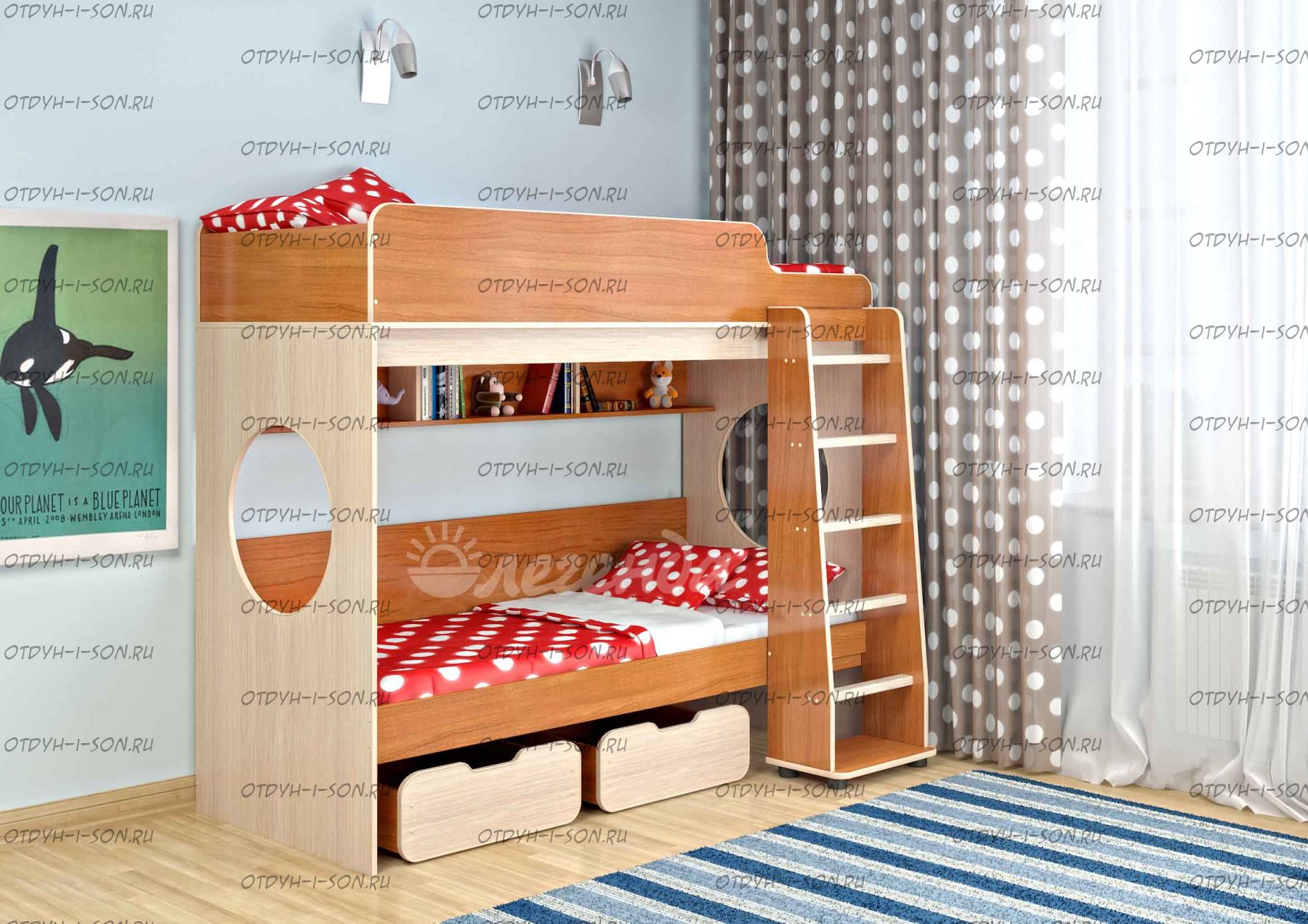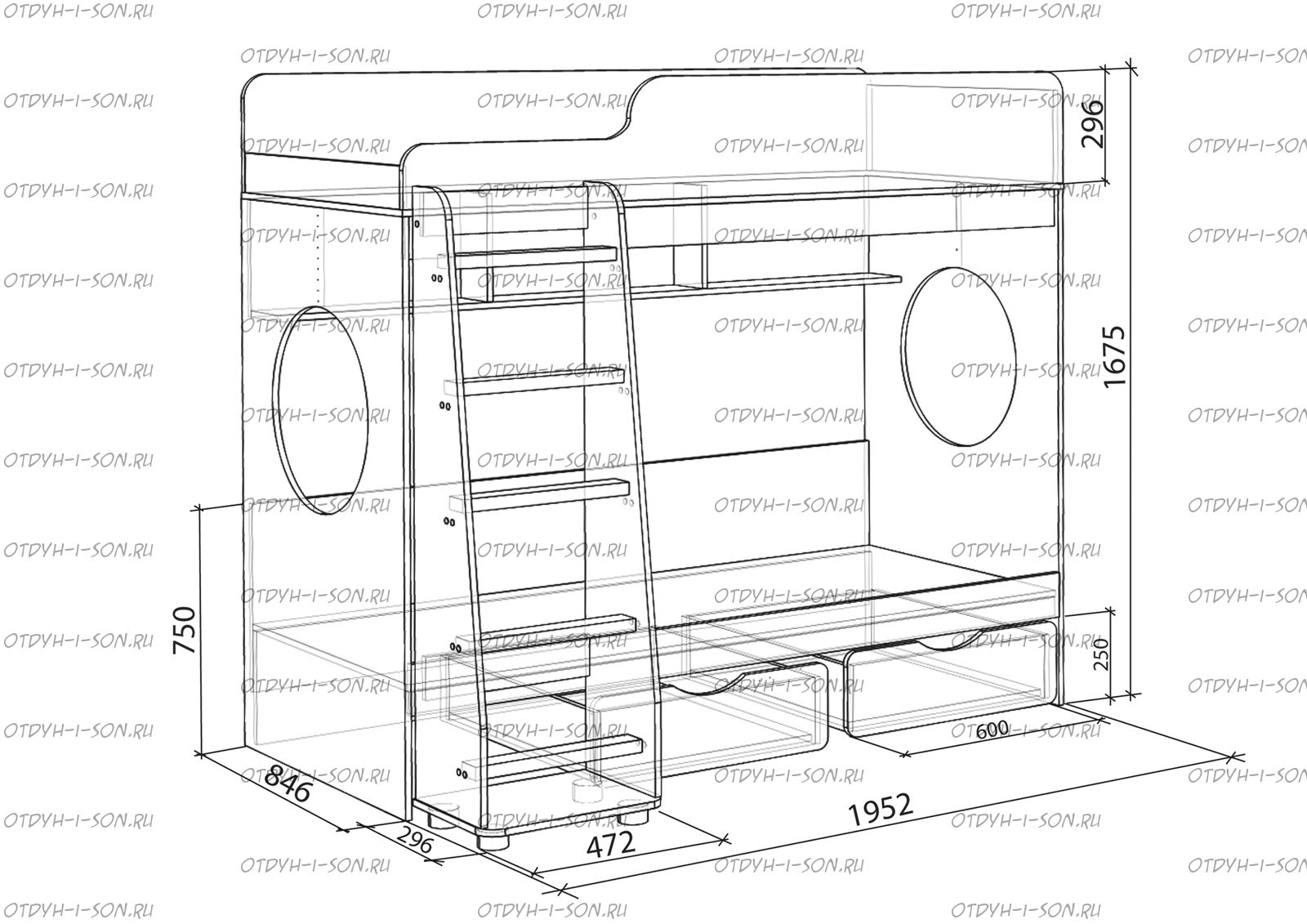 Кровать двухъярусная Легенда-7.1 Характеристики: Спальное место: 80Х190см. Габариты: 1955Х846Х1675 мм. Диаметр круглого отверстия: 50см. Высота от пола до спального места: 25см. Высота бортика верхнего яруса: 30см. Высота бортика нижнего яруса: 10см. Ширина лестницы: (Д*Ш*В) 476*300*1416 мм. Размеры ящиков: 600*656*220мм. Размеры стеллажа: 1918*150*300мм. Расстояние между спальными местами: 90см. Рекомендуемая высота матрасов: 10см. для верхнего яруса и 10-15см. для нижнего яруса Комплектация: двухъярусная кровать, встроенный стеллаж для книг, лестница с деревянными ступеньками. подкатные ящики (2шт.) Лестница: кровать универсальна, лестница может быть установлена как с фасадной, так и с боковой стороны Вес: 130,3 кг. Объем: 0,33 м3 Складская программа по кроватям и матрасам, Все цвета в наличии Цвет корпуса: ольха, венге светлый Цвет фасада: венге светлый, ольха, венге темный, голубой, оранжевый, розовый, лайм