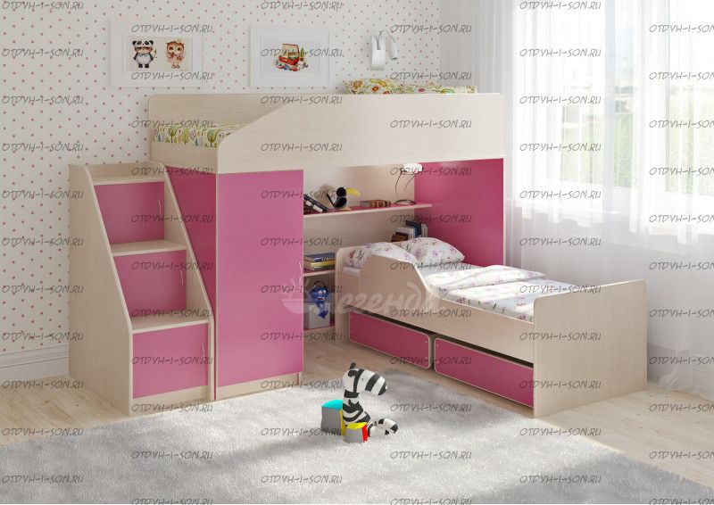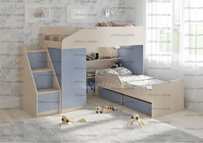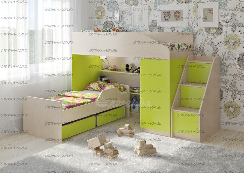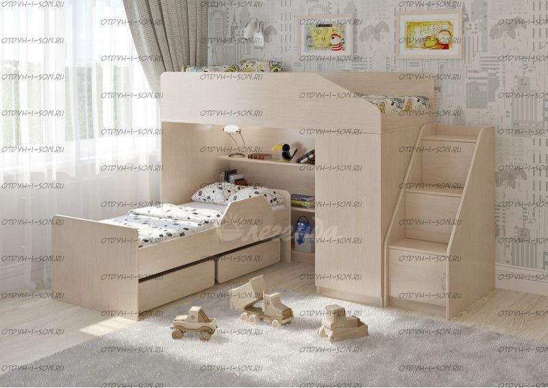 Кровать двухъярусная Легенда-11.10 Комплектация: Кровать-чердак Легенда-11 Кровать Легенда 27.1 Лестница ЛУ-11 Характеристики: Размер спального места 800Х1800мм + 700х1600 мм Габариты : 2260*1823*1450 Материал: ЛДСП Универсальность: Да. Комплект универсальный, собирается, как на правую, так и на левую сторону Вес: 163 кг. Объем: 0,40 м3 Кол-во коробок 13 шт Цвет корпуса: ольха, венге светлый Цвет фасада: венге светлый, ольха, венге темный, голубой, оранжевый, розовый, лайм Двухъярусная кровать Легенда 11.10 – отличный комплект мебели для двоих детей. Комплект занимает немного места - решение для площади малых габаритов, экономия пространства. Двухъярусная кровать двумя спальными местами: 1800х800 и 1600х700. Под верхним спальным местом располагается стеллаж, состоящий из трех полок. Стеллаж отлично подходит для хранения игрушек, удобен для поддержания порядка и сортировки предметов. Вместительный шкаф с четырьмя полками и штангой для хранения одежды, белья, игрушек или иных вещей. В комплект входит угловая лестница из трех ступенек-шкафчиков. Лестница одновременно выполняет функцию стеллажа. Световое окно - дополнительное освещение, элемент для игры и возможность родителям наблюдать за ребенком. Нижнее спальное место удобно заправлять, ребенку легко забираться и слезать, надёжно и практично. Под нижней кроватью два вместительных ящика, которые разработаны специально для данной модели. Идеально помещаются под кроватью, удобно выкатываются и закатываются. Незаменимые элементы организации хранения вещей. Нижняя кровать оборудована бортиком безопасности Л-01. Боковые бортики и мягкий противоударный кант – дополнительная безопасность для детей. Для Вашего удобства во всех изделиях «Легенда» все бортики спального места можно менять местами. По Вашему выбору комплект может быть собран как на левую, так и на правую сторону.