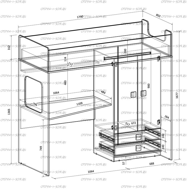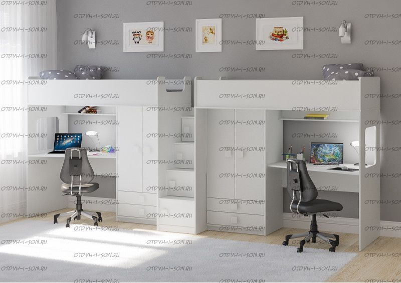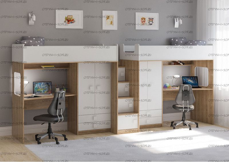 Кровать двухъярусная Легенда АА606-606 Характеристики: Размер спального места: 750х1750 или 750х1900 мм Внешние габариты (ШхДхВ): 802 х 4019 х 1677 мм По Вашему выбору комплект может быть собран как на левую, так и на правую сторону. Цвета: белый или сонома-светлый/белый Двухъярусная кровать Легенда AA606-606 – полный набор для двоих детей. Две кровати Легенда A606 со спальным местом 1750х750 или 1900х750. Под спальным местом для каждого ребенка располагается рабочее место с встроенным столом. Вместительный шкаф для хранения одежды, белья,игрушек или иных вещей с двумя выдвижными ящиками. У каждого ребенка будет свой шкаф! Угловая лестница средней величины из четырех ступенек является связующим звеном,и в то же время разделяет зоны отдыха детей. Лестница, дополненная фасадами, одновременно выполняет функцию стеллажа. Две кровати, два шкафа, две игровых зоны – одна лестница. Идеальный вариант для двоих детей!