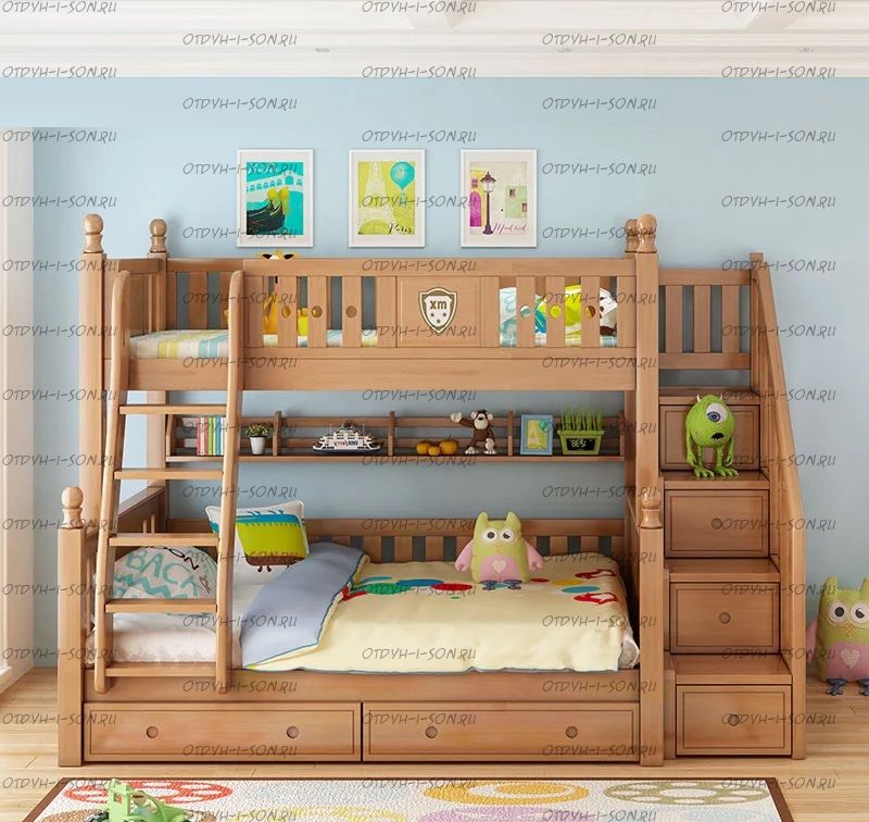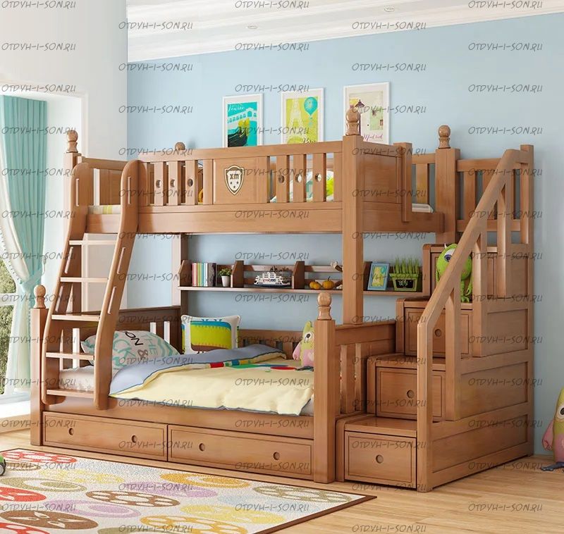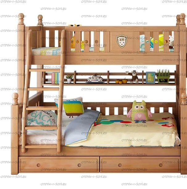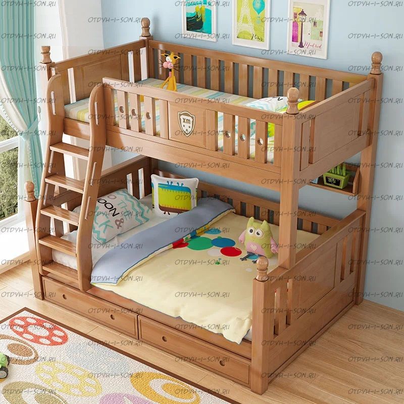 Кровать двухъярусная Лейла №6 Характеристики: Размер спального места: 80х160 + 80х160, 80х180 + 80х180, 80х190 + 80х190, 80х200 + 80х200, 90х160 + 90х160, 90х180 + 90х180, 90х190 + 90х190, 80х200 + 90х200 см. или любые другие на Ваш выбор. Общая высота: 2350 мм. Высота царги: 140 мм. Габаритные Размеры: +10 см к ширине, +50 см к длине. (спального места) Характеристика выкатных ящиков: Комплект состоит из 2х ящиков; Мебельная фанера/ Массив дерева; Ящики на роликах; Дно ящика 5мм ДВП; Ящик двигается по полу. К кровати не фиксируется, установка с любой стороны. Масса в упаковке: Объем в упаковке: Материал: массив сосны 2 подкроватных ящика с колесиками, ящики не закрепляются в кровати и могут выдвигаться с любой стороны кровати (ящики докупаются отдельно). В базовом варианте с тыльной стороны ящиков декоративной планки не предусмотрено Основание под матрас реечное Внимание: возможно увеличение высоты бортиков кровати! Цвет: орех, бук, венге, груша, дуб, каштан, клен, красное дерево, махагон, ольха, сосна, белый (эмаль), слоновая кость (эмаль)