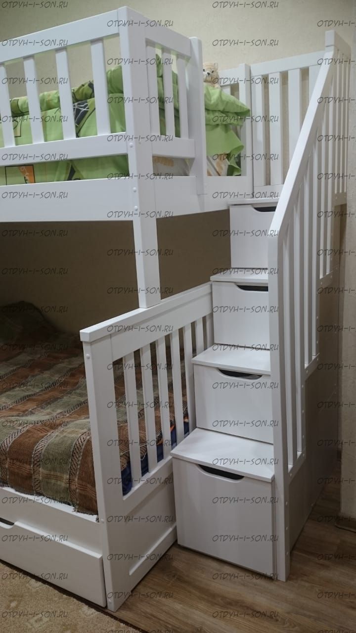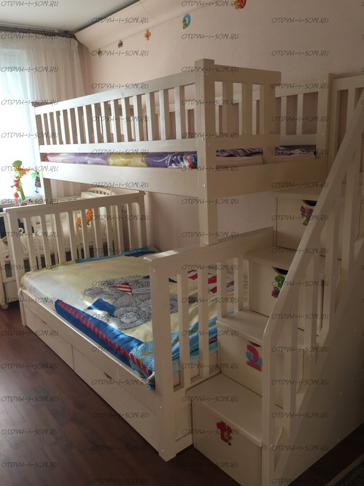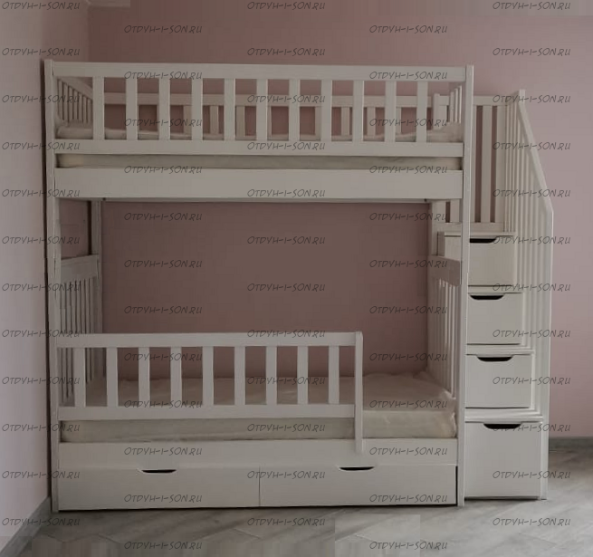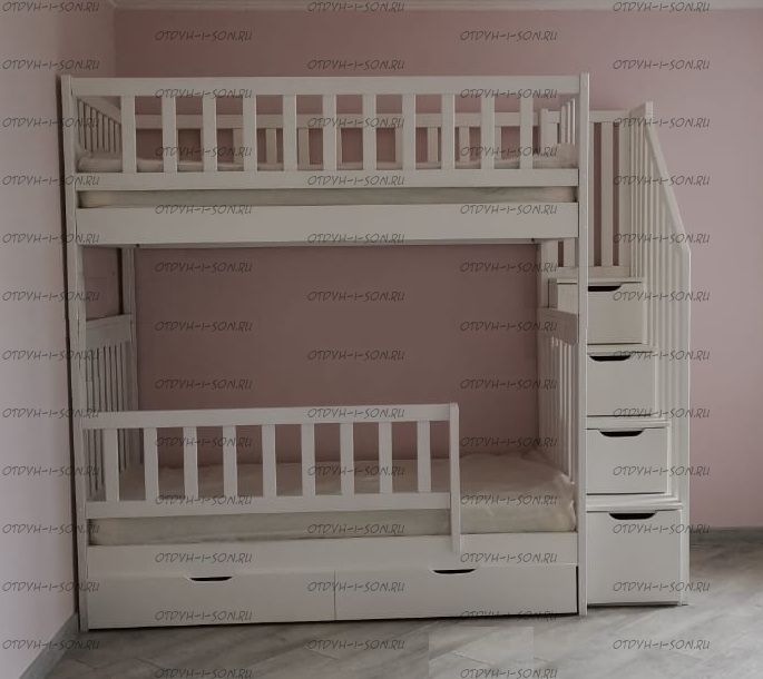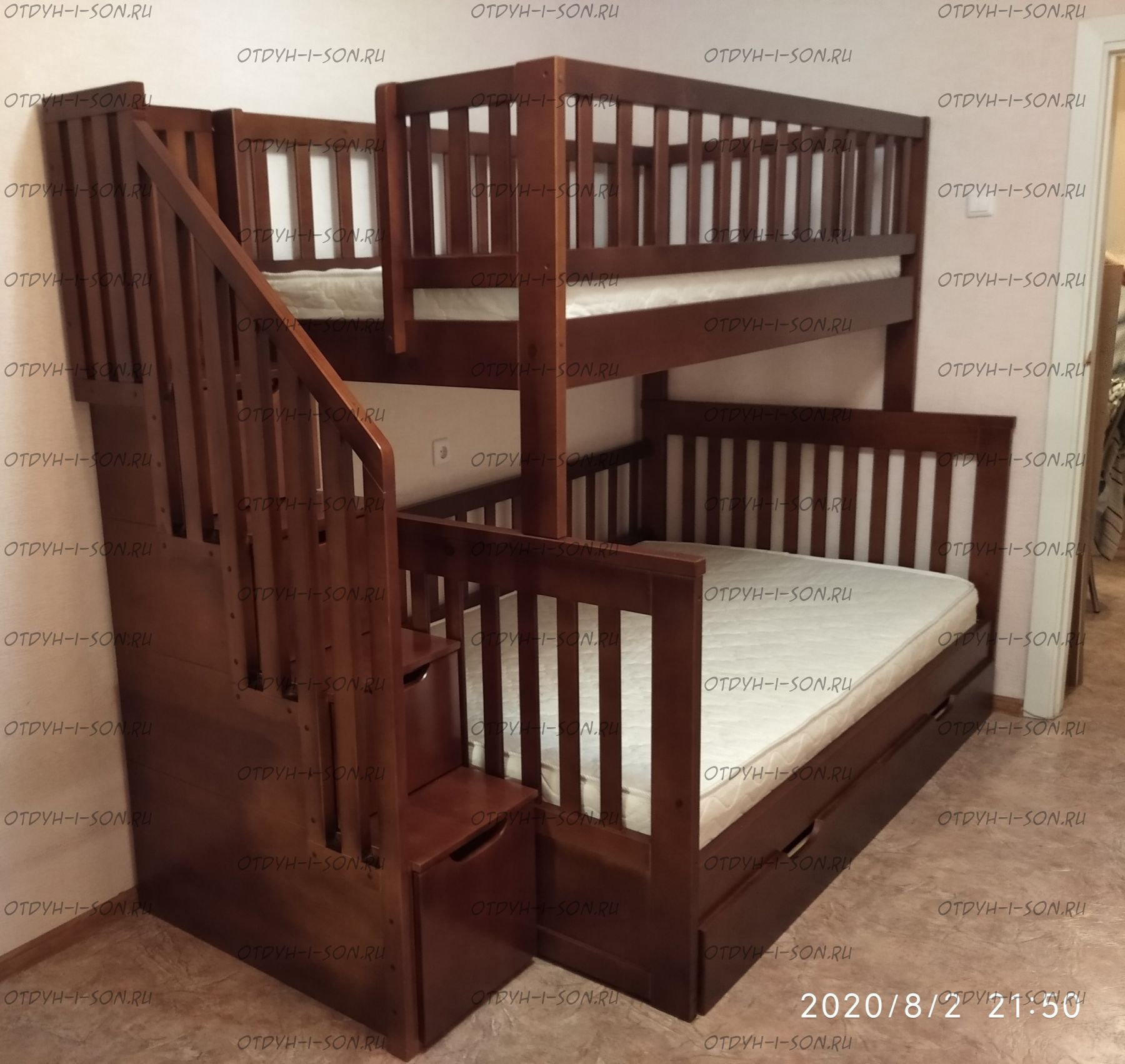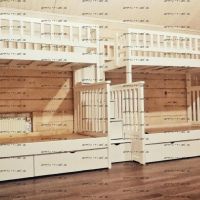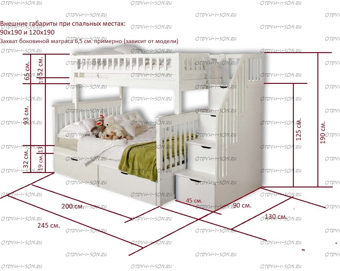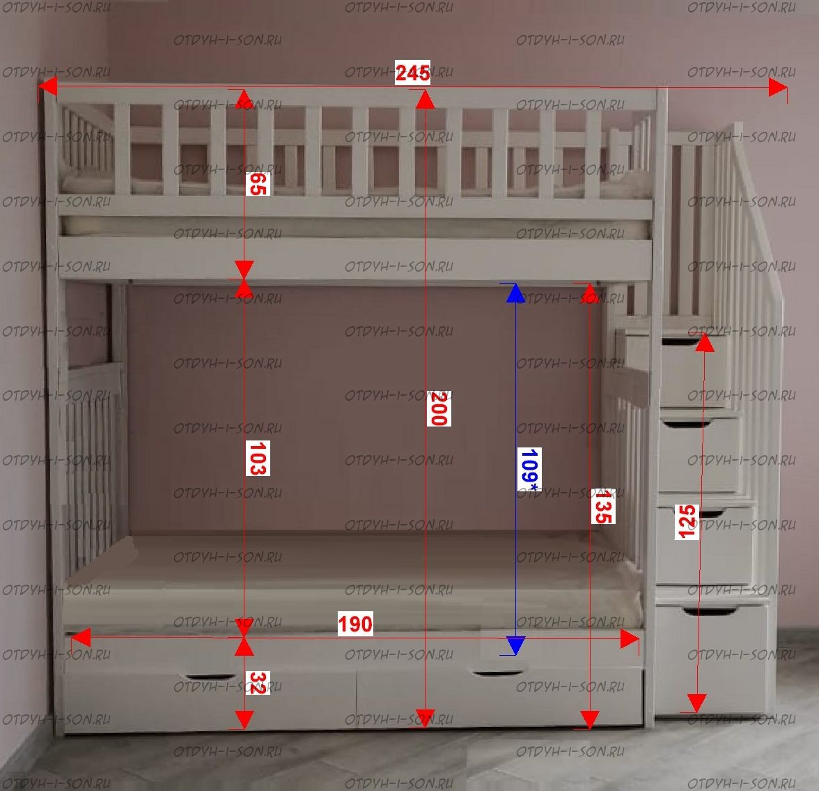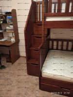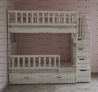 Кровать двухъярусная Лейла Стандарт с ящиками 001В2А Характеристики: Размер спального места верхнего яруса: 80х180 см, 80х190 см, 90х190 см., 90х200 см. (и любые другие на Ваш вкус) Размер спального места нижнего яруса: 80х190, 80х200, 90х190, 90х200, 120х190, 120х200, 130х200, 140х190 см. (и любые другие на Ваш вкус) Внешние размеры: +55 см. к длине спального места кровати и + 12 см. к ширине спального места кровати. Высота кровати от пола: 190 см. Расстояние между ярусами: 85 см. Внешние размеры лестницы (ШхГхВ): 45х90х190 см. Ящики размеры каждого: 65 х 65 см. Высота борта верхнего яруса: 47-48 см. Кровать может быть разъединена на 2 отдельных кровати высотой: Нижнее спальное место, общая высота: 98 см. Верхнее спальное место, общая высота: 92 см. Материал: массив сосны Внимание: у данной модели кровати в ящиках подкроватных выпилы вместо ручек, как на втором фото. Возможны нестандартные размеры При размере 90х190 + 140х190 вес и объем кровати: 170 кг., 1,24 м3 При размере 90х190 + 90х190 вес и объем кровати: 250 кг., 2.45 м3 Цвет (морилка): беленый дуб, средний орех, сосна (натуральный), венге, светлый орех, ольха, орех, бук, красное дерево, клен красный, груша Цвет (эмаль) (+20 % от стоимости): фисташковый, белый, черный, темно-зеленый, слоновая кость (белый в бежевый), сиреневый, синий, светло-зеленый, розовый, красный, желтый, дуб молочный (белый в розовый), голубой Комплектация: Кровать двухъярусная Лейла Лестница, которая выполняется с любой стороны кровати по Вашему запросу. Расположение лестницы кровати не универсально и указывается Матрас докупается отдельно Продукция фабрики не подлежит возврату в случае: механических повреждений по вине получателя; потери товарного вида по вине получателя; если изначально было заказано изделие нестандартного цвета или размера; Внимание: для любой модели кровати возможно увеличение высоты бортиков кровати! Возможно изготовление кровати нестандартных размеров по вашим замерам, доплата за нестандартный размер: - за кровать + 10% от стоимости изделия; Производство Владимирской мебельной фабрики, кровать доставляется напрямую от производителя, самовывоз ограничен.