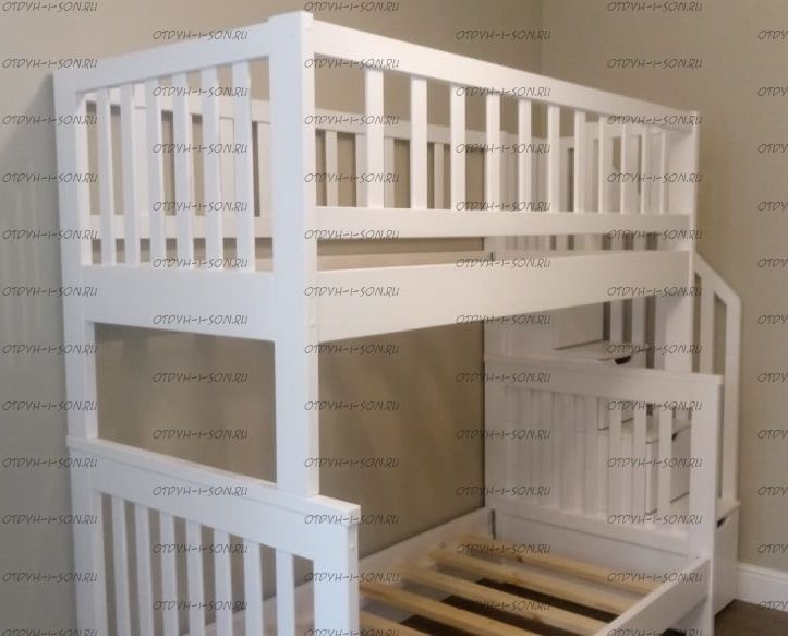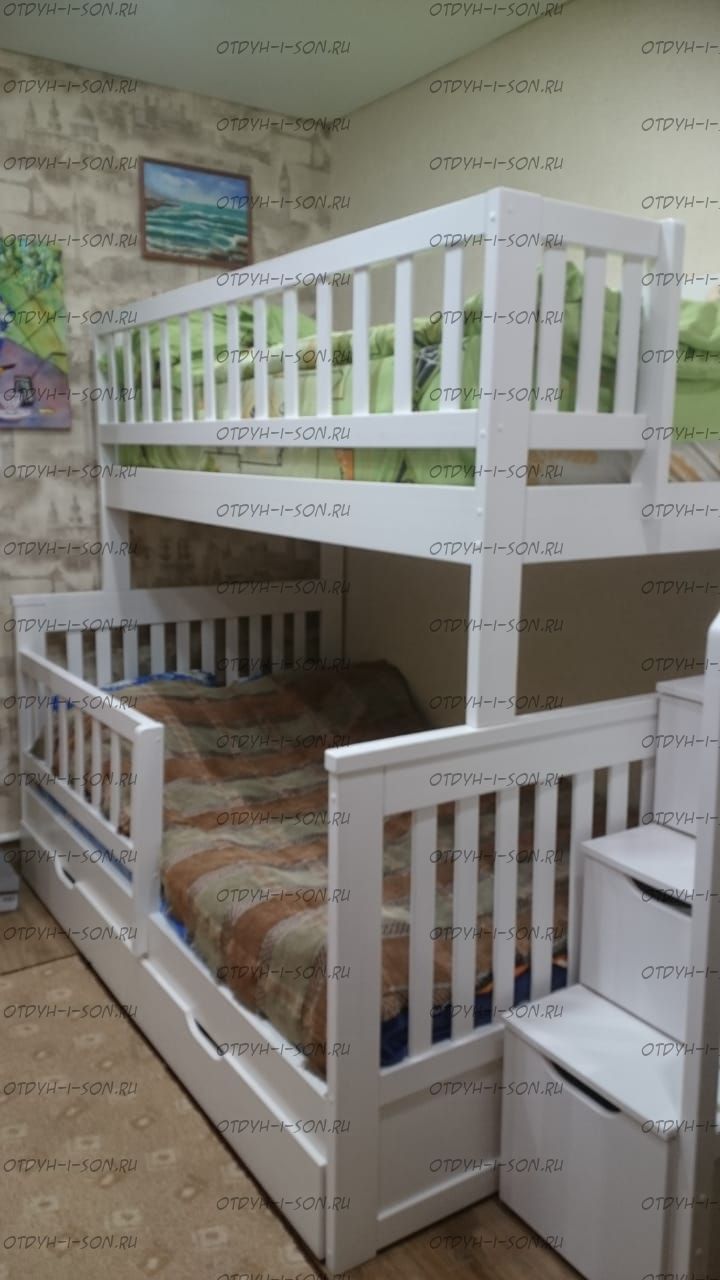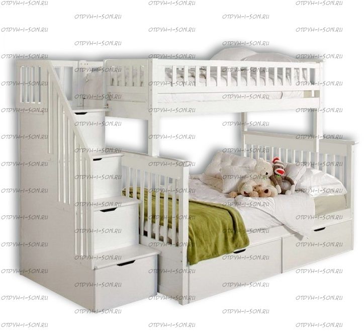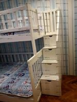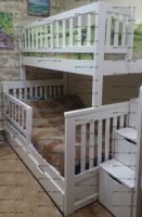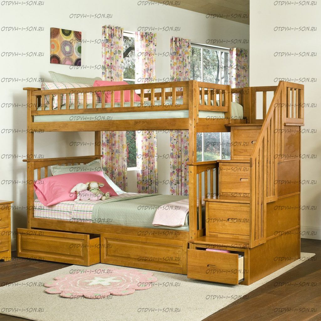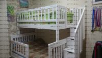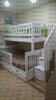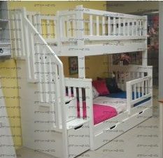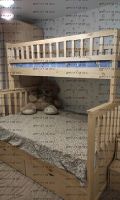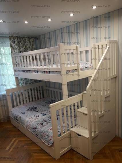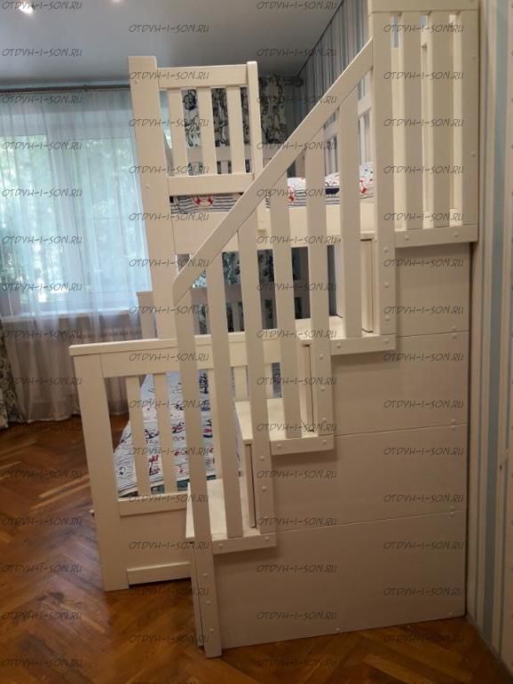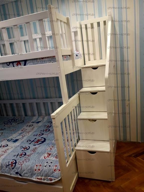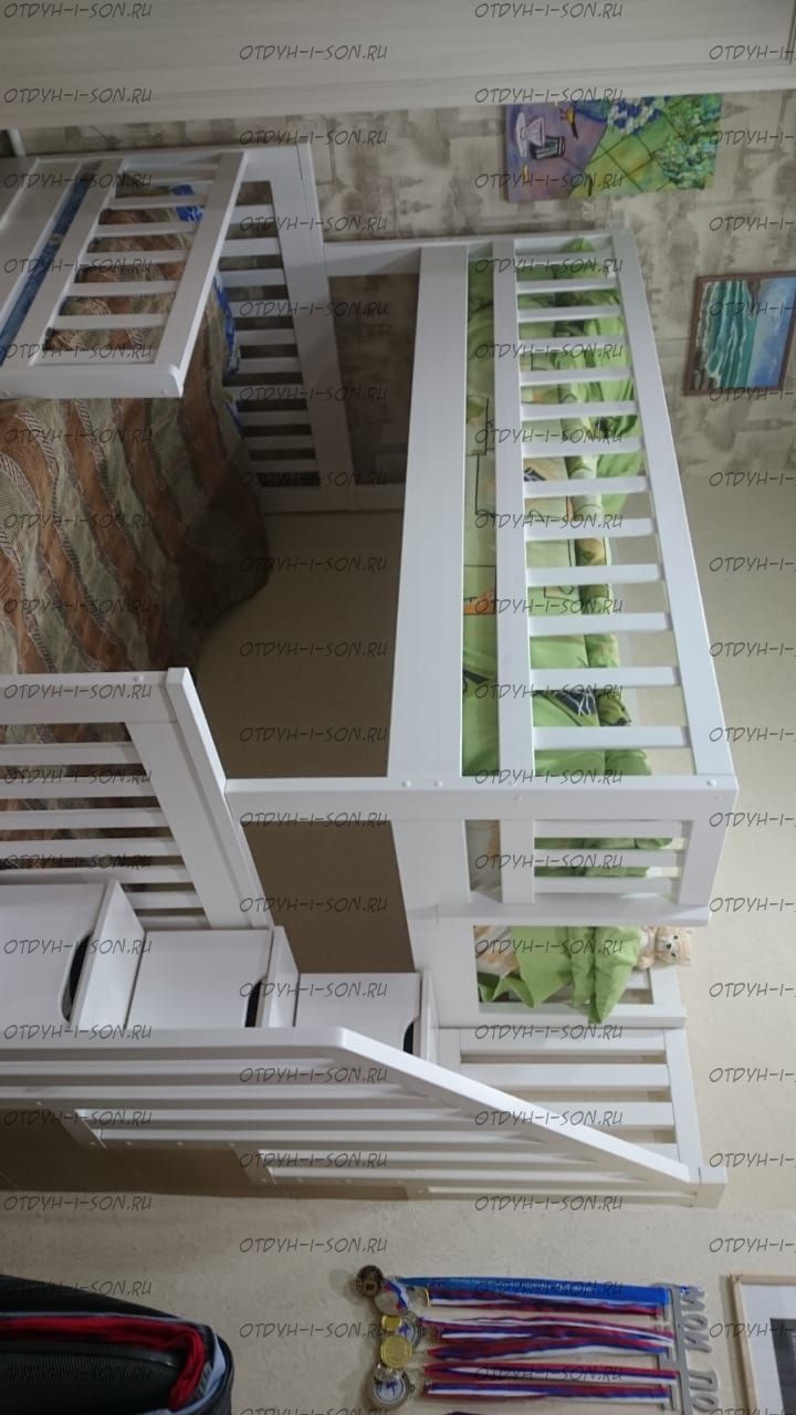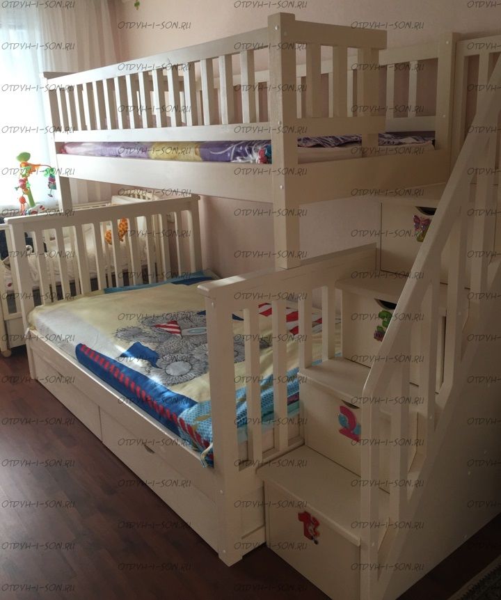 Кровать двухъярусная Лейла Стандарт с ящиками 001В2А Характеристики: Размер спального места верхнего яруса: 80х180 см, 80х190 см, 90х190 см., 90х200 см. (и любые другие на Ваш вкус) Размер спального места нижнего яруса: 80х190, 80х200, 90х190, 90х200, 120х190, 120х200, 130х200, 140х190 см. (и любые другие на Ваш вкус) Внешние размеры: +55 см. к длине спального места кровати и + 12 см. к ширине спального места кровати. Высота кровати от пола: 190 см. Расстояние между ярусами: 85 см. Внешние размеры лестницы (ШхГхВ): 45х90х190 см. Ящики размеры каждого: 65 х 65 см. Высота борта верхнего яруса: 47-48 см. Кровать может быть разъединена на 2 отдельных кровати высотой: Нижнее спальное место, общая высота: 98 см. Верхнее спальное место, общая высота: 92 см. Материал: массив сосны Внимание: у данной модели кровати в ящиках подкроватных выпилы вместо ручек, как на втором фото. Возможны нестандартные размеры При размере 90х190 + 140х190 вес и объем кровати: 170 кг., 1,24 м3 При размере 90х190 + 90х190 вес и объем кровати: 250 кг., 2.45 м3 Цвет (морилка): беленый дуб, средний орех, сосна (натуральный), венге, светлый орех, ольха, орех, бук, красное дерево, клен красный, груша Цвет (эмаль) (+20 % от стоимости): фисташковый, белый, черный, темно-зеленый, слоновая кость (белый в бежевый), сиреневый, синий, светло-зеленый, розовый, красный, желтый, дуб молочный (белый в розовый), голубой Комплектация: Кровать двухъярусная Лейла Лестница, которая выполняется с любой стороны кровати по Вашему запросу. Расположение лестницы кровати не универсально и указывается Матрас докупается отдельно Продукция фабрики не подлежит возврату в случае: механических повреждений по вине получателя; потери товарного вида по вине получателя; если изначально было заказано изделие нестандартного цвета или размера; Внимание: для любой модели кровати возможно увеличение высоты бортиков кровати! Возможно изготовление кровати нестандартных размеров по вашим замерам, доплата за нестандартный размер: - за кровать + 10% от стоимости изделия; Производство Владимирской мебельной фабрики, кровать доставляется напрямую от производителя, самовывоз ограничен.