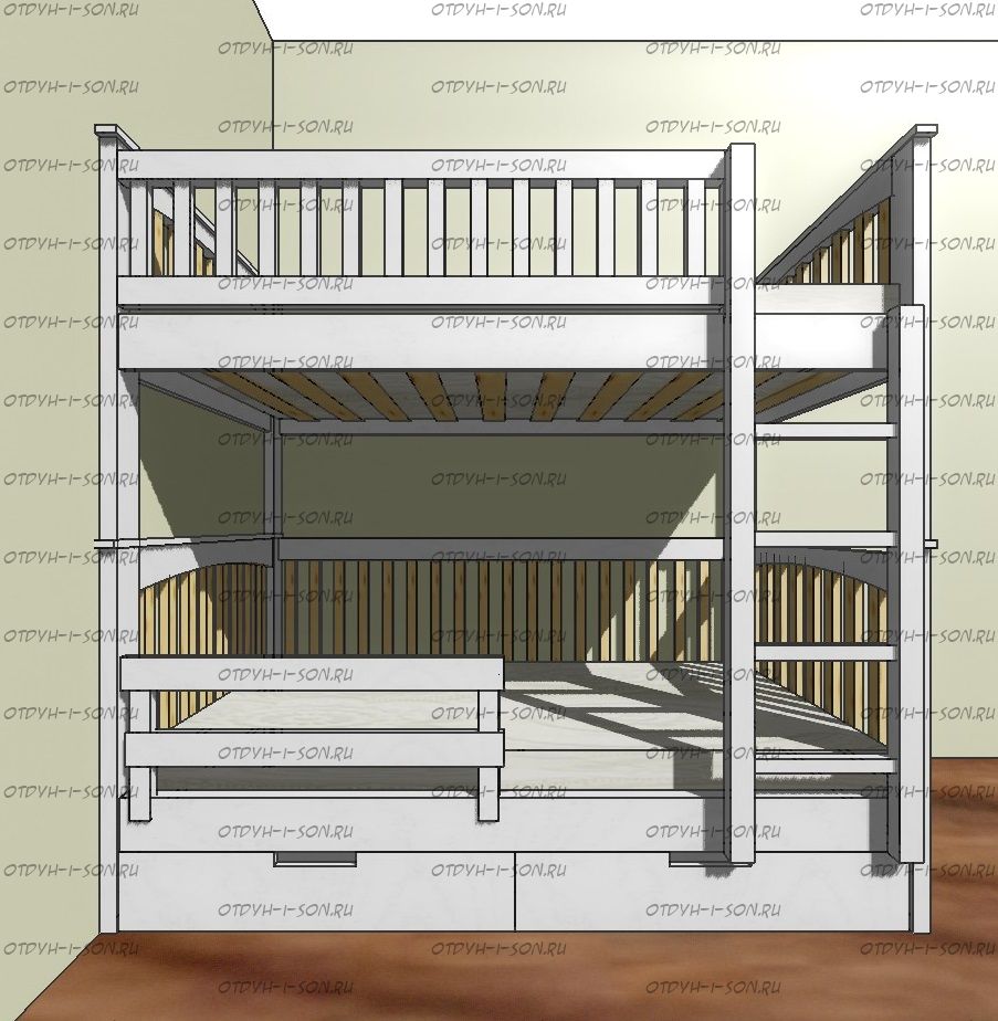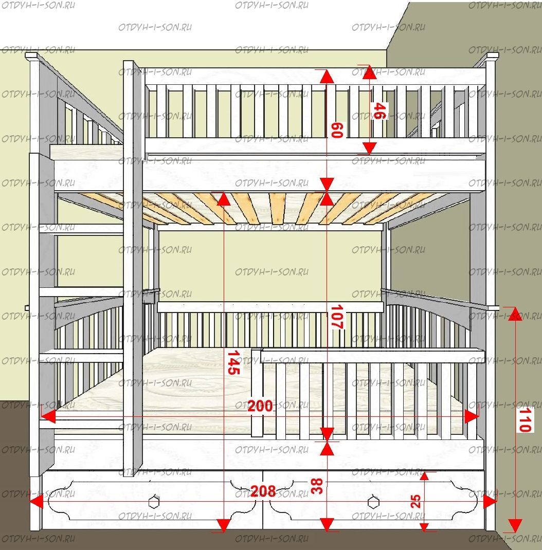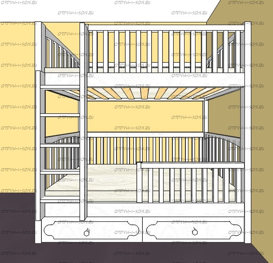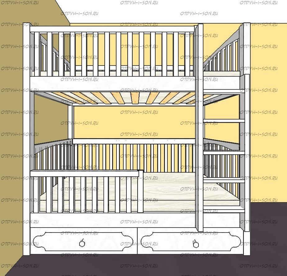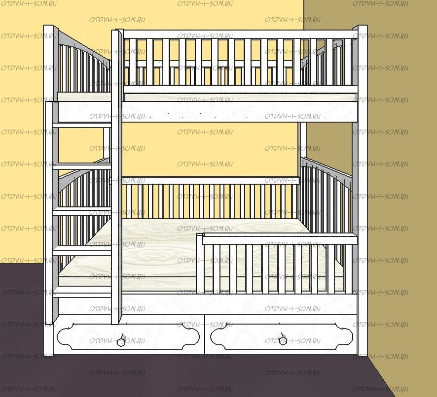 Кровать двухъярусная Лейла Классика №25 может быть изготовлена в любых размерах, а также по заказу может быть изготовлена с приставной лестницей-комодом.