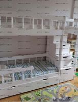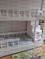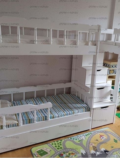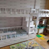 Кровать двухъярусная Лейла №8 с ящиками Характеристики: Размер спального места верхнего яруса: 80х180 см, 80х190 см, 90х190 см., 90х200 см. (и любые другие на Ваш вкус) Размер спального места нижнего яруса: 80х190, 80х200, 90х190, 90х200, 120х190, 120х200, 130х200, 140х190 см. (и любые другие на Ваш вкус) Внешние размеры: +55 см. к длине спального места кровати и + 12 см. к ширине спального места кровати. Высота кровати от пола: 190 см. Расстояние между ярусами: 85 см. Внешние размеры лестницы (ШхГхВ): 45х90х190 см. Ящики размеры каждого: 65 х 65 см. Высота борта верхнего яруса: 47-48 см. Кровать может быть разъединена на 2 отдельных кровати высотой: Нижнее спальное место, общая высота: 98 см. Верхнее спальное место, общая высота: 92 см. Материал: массив сосны Внимание: у данной модели кровати в ящиках подкроватных выпилы вместо ручек, как на втором фото. Возможны нестандартные размеры При размере 90х190 + 140х190 вес и объем кровати: 170 кг., 1,24 м3 При размере 90х190 + 90х190 вес и объем кровати: 250 кг., 2.45 м3 Цвет (морилка): беленый дуб, средний орех, сосна (натуральный), венге, светлый орех, ольха, орех, бук, красное дерево, клен красный, груша Цвет (эмаль) (+20 % от стоимости): фисташковый, белый, черный, темно-зеленый, слоновая кость (белый в бежевый), сиреневый, синий, светло-зеленый, розовый, красный, желтый, дуб молочный (белый в розовый), голубой Комплектация: Кровать двухъярусная Лейла Лестница, которая выполняется с любой стороны кровати по Вашему запросу. Расположение лестницы кровати не универсально и указывается Матрас докупается отдельно Продукция фабрики не подлежит возврату в случае: механических повреждений по вине получателя; потери товарного вида по вине получателя; если изначально было заказано изделие нестандартного цвета или размера; Внимание: для любой модели кровати возможно увеличение высоты бортиков кровати! Возможно изготовление кровати нестандартных размеров по вашим замерам, доплата за нестандартный размер: - за кровать + 10% от стоимости изделия; Производство Владимирской мебельной фабрики, кровать доставляется напрямую от производителя, самовывоз ограничен.