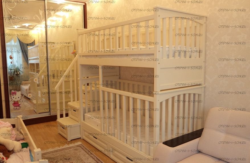 Кровать двухъярусная Лейла с кроватью для новорожденного №29IR. Лестница, которая выполняется с любой стороны кровати по Вашему запросу. Расположение лестницы кровати не универсально и указывается. Матрасы докупаются отдельно.