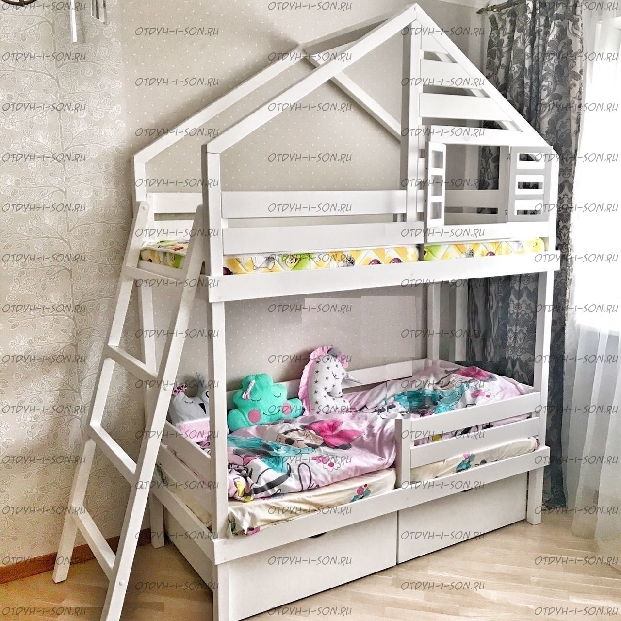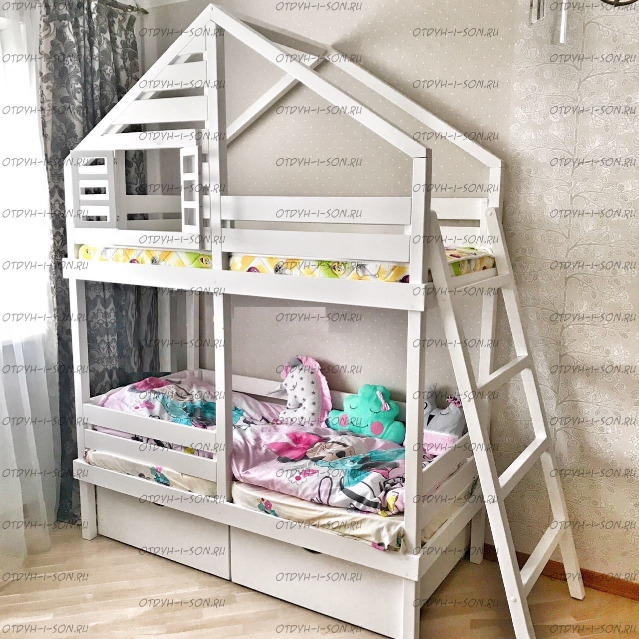 Кровать двухъярусная Домик Roof №1 Характеристики: Размер спального места: спальные места одинаковые по размеру Длина спального места: 160 см., 170 см., 180 см., 190 см., 200 см. или любой другой на Ваш выбор Ширина спального места: 70 см., 80 см., 90 см. или любой другой на Ваш выбор Высота кровати: 210 см. Каркас: массив сосны, Брус 40х40 мм. Основание: поперечные брусья массив, ДВП 4-5 мм. Ящики каркас: березовая фанера 12 мм, дно ДВП 4-5 мм, выкатная система (4 колесика) - к кровати не фиксируется Ящики фасад: березовая мебельная фанера 12-16 мм, массив сосны Покрытие: Sayerlack (Италия), Renner (Италия) Внимание: возможно увеличение высоты бортиков кровати! Цвет: орех, бук, венге, груша, дуб, каштан, клен, красное дерево, махагон, ольха, сосна, белый (эмаль), слоновая кость (эмаль)