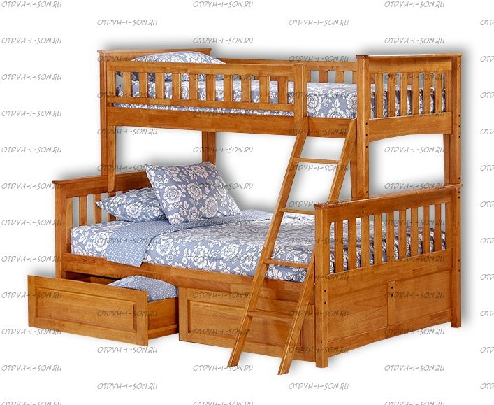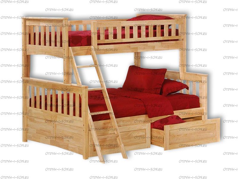 Кровать двухъярусная Модерн Плюс №В Характеристики: Размер спального места: 80х190 + 120х190, 80х200 + 120х200, 90х190 + 120х190, 90х200 + 120х200 см. Изголовье: 190/95см Изножье: 190/95см Высота от пола до царги: 19/125см Ящики:1 комплект (2 шт.) 65 х 65 Расстояние между ярусами:85см Ширина лестницы:45см Спинка:массив сосны, березовая мебельная фанера 12мм Каркас:массив сосны Основание:поперечные брусья массив, ДВП 4-5мм Ящики каркас:березовая фанера 12мм, дно ДВП 4-5мм, выкатная система (4 колесика) - к кровати не фиксируется Ящики фасад:березовая мебельная фанера 12-16мм, массив сосны Покрытие:Sayarlack (Италия), Renner (Италия) Характеристика выкатных ящиков: Комплект состоит из 2х ящиков; Мебельная фанера/ Массив дерева; Ящики на роликах; Дно ящика 5мм ДВП; Ящик двигается по полу. К кровати не фиксируется, установка с любой стороны. Масса в упаковке: Объем в упаковке: Крепления кроватей фабрики ВМК Шале: мебельные стяжки, евроболты, заглушки Материал: массив сосны 2 подкроватных ящика с колесиками, ящики не закрепляются в кровати и могут выдвигаться с любой стороны кровати (ящики докупаются отдельно). В базовом варианте с тыльной стороны ящиков декоративной планки не предусмотрено Основание под матрас реечное Внимание: для любой модели кровати ВМК Шале возможно увеличение высоты бортиков кровати! Цвет: орех, бук, венге, груша, дуб, каштан, клен, красное дерево, махагон, ольха, сосна, белый (эмаль), слоновая кость (эмаль) Комплектация модели: Спинки 4 штуки, Царга 4 штуки, Борт 2 штуки, Лестница 1 штука, Подматрасники 2 комплекта, ДВП 2 штуки, ящики 2 штуки.