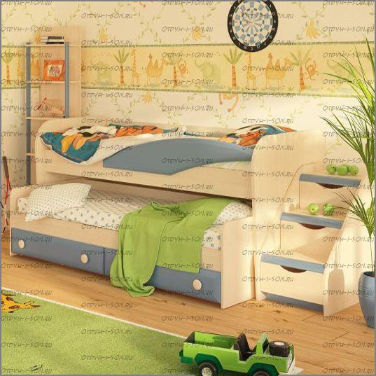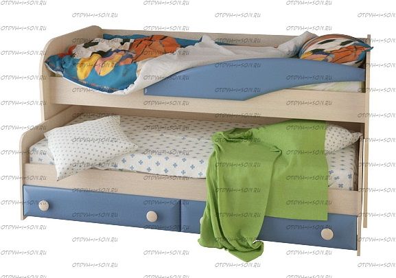 Кровать двухъярусная Немо выдвижная Характеристики: Внешние габариты: 1976x960x1000 Цвета: дуб млечный Цвет фасада: дуб/синий, дуб/эвкалипт, дуб/оранжевый Комплектация: Матрас докупается отдельно (рекомендуемый размер 195/190х80 см) Два выдвижных бельевых ящика
