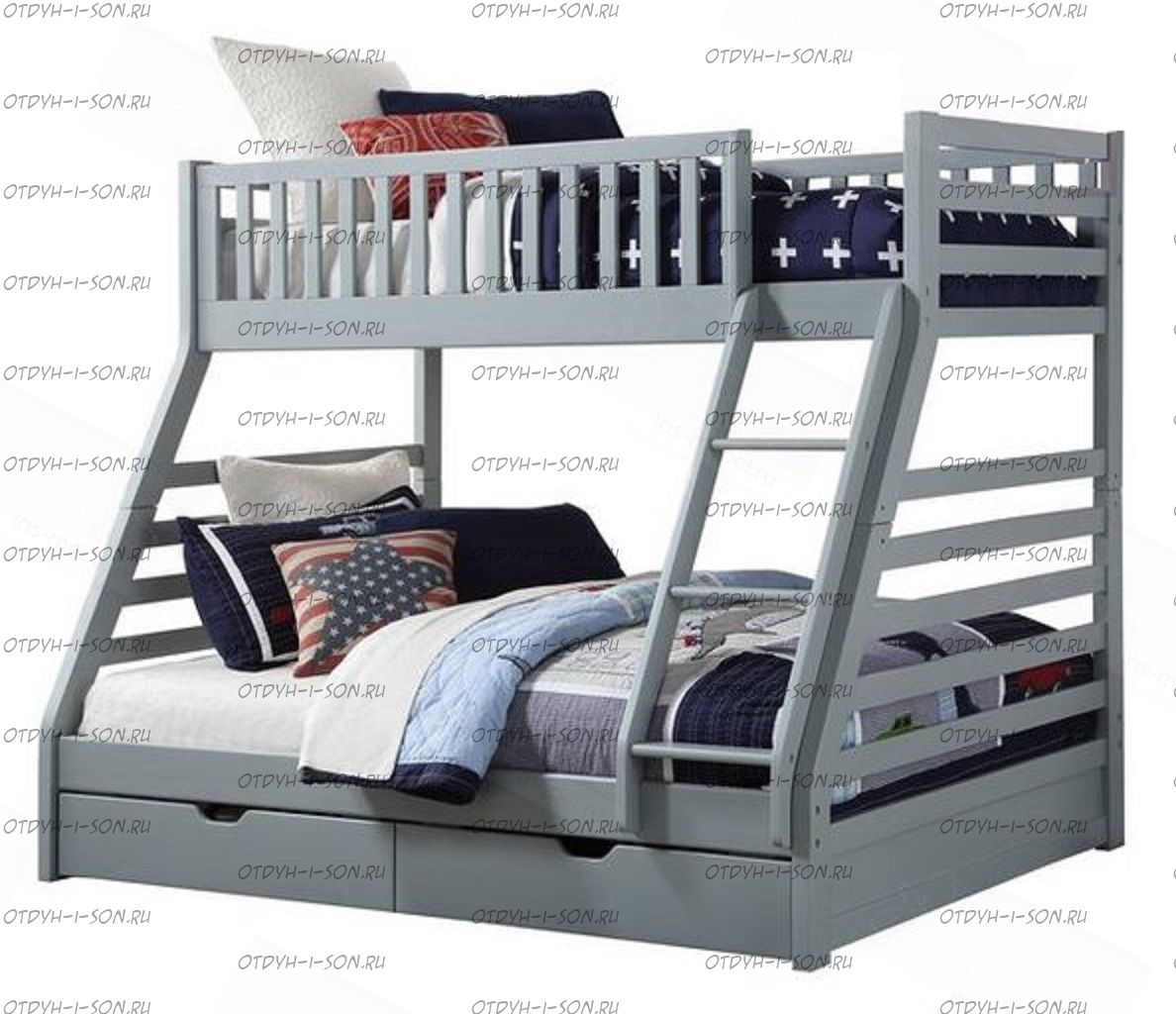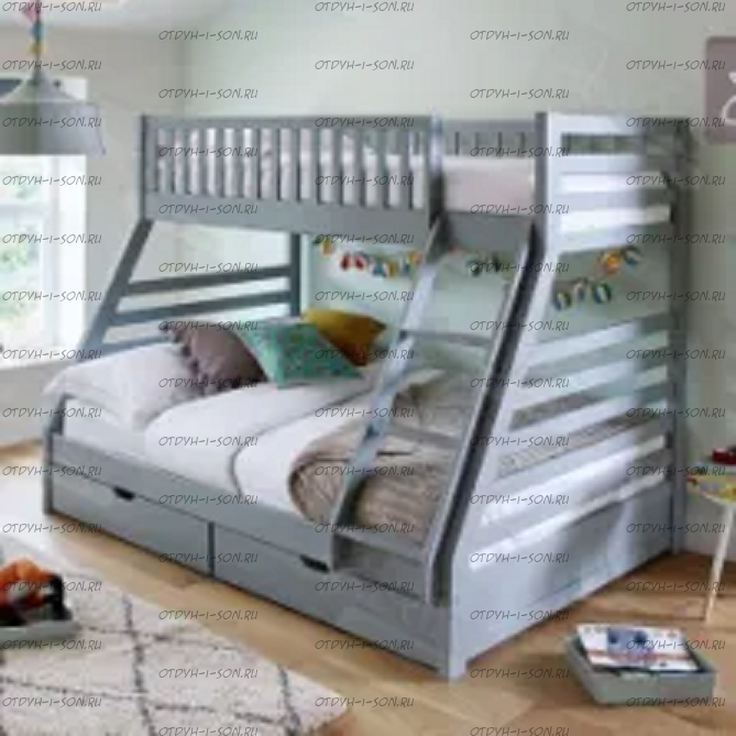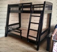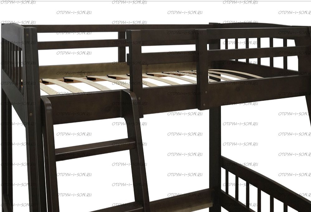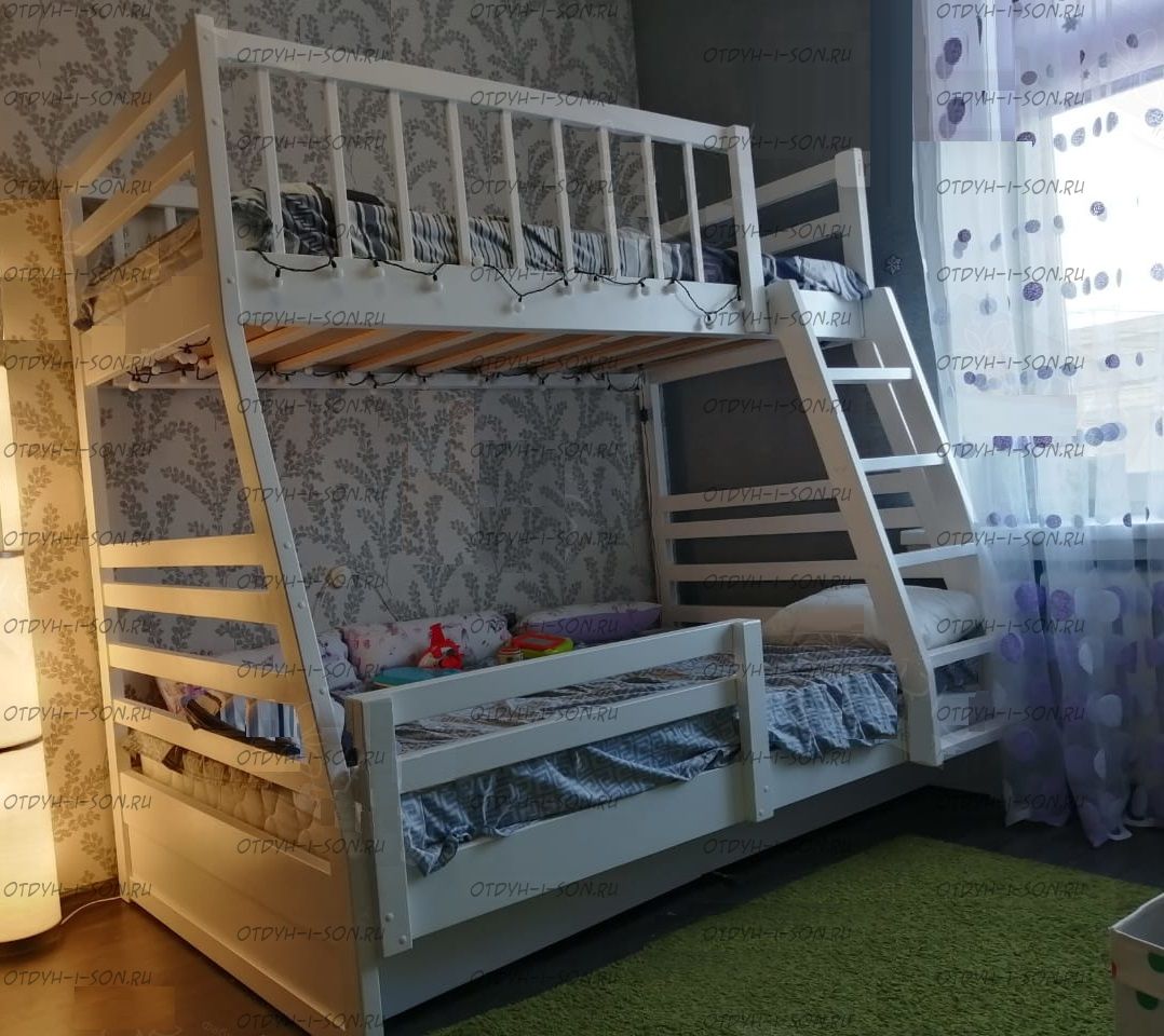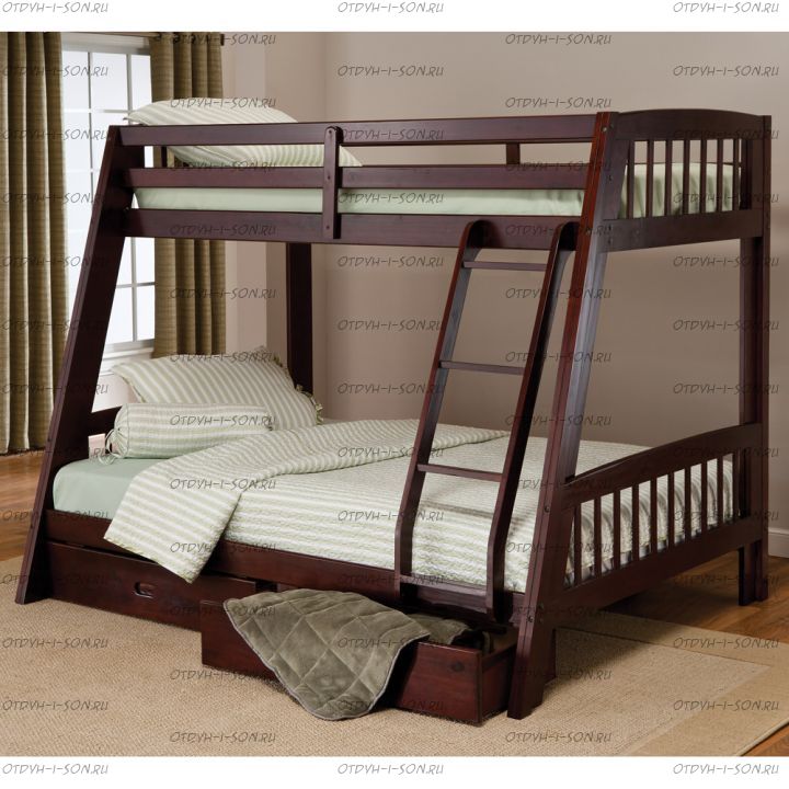 Кровать двухъярусная Эльбрус Характеристики: Размер спального места: 80Х190 и 120Х190, 80Х200 и 120Х200, 90Х190 и 120Х190, 90Х200 и 120Х200 Изготавливается из массива дерева. Габаритные размеры кровати: +10 см. к ширине, +14 см. к длине. (спального места) Высота бортика 40 см. (уточняйте у оператора) Высота от пола до царги: 21 см. (уточняйте у оператора) Высота царги: 14 см. (уточняйте у оператора) Глубина утапливания матраса: 5-6 см. (уточняйте у оператора) Тип основания: Ламельное основание, встроенное в царги (боковины) кровати, изготавливается из гнутых ламелей: входит в стоимость. От размера 120, добавляется 5-ая ножка В кроватях шириной 120 см. и более используется центральная опора (средник) из массива. Подкроватные ящики: за дополнительную плату 2 или 4 ящика (в зависимости от ширины кровати) Материалы: сосна и мебельная фанера. Также возможно изготовление мебели из массива дуба, бука, ясеня. Возможно изготовление кроватей любых габаритных размеров. Крепление узлов кровати: специальные кроватные стяжки, саморезы, мебельный крепеж, пластиковые заглушки в цвет изделия. Боковые царги кровати закрепляются к спинкам при помощи надежных кроватных стяжек, которые не видны снаружи. Вес в упаковке: 120 кг +/- 10 кг Объём в упаковке: 1,5 м3 +/- 0,5 м3; Кол-во мест: 3 шт (Уточняйте, параметры зависят от размеров спального места) Цвет: орех, бук, венге, груша, дуб, каштан, клен, красное дерево, махагон, ольха, сосна, белый (эмаль), слоновая кость (эмаль)