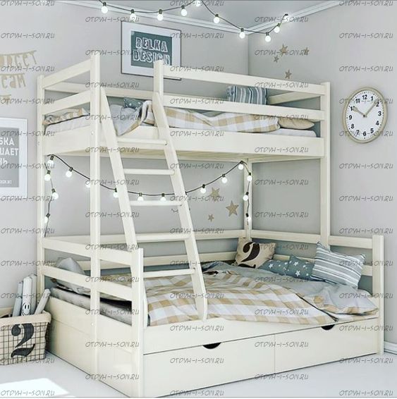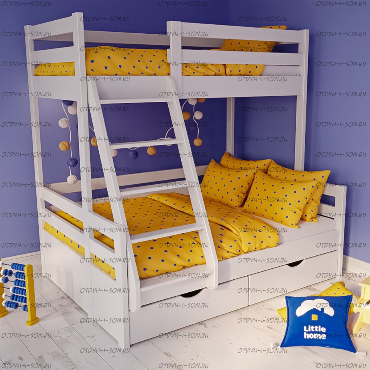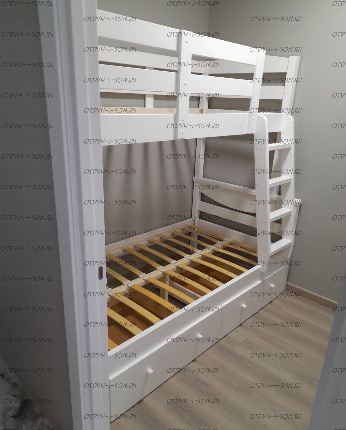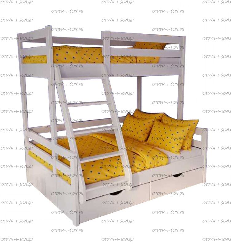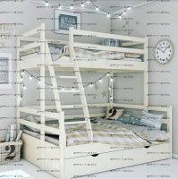 Кровать двухъярусная Алина, ящики подкроватные докупаются отдельно. Характеристики: Размер спального места: 80Х190 + 110Х190, 80Х200 + 110Х200, 90Х190 + 120Х190, 90Х200 + 120Х200 см. Изготавливается из массива дерева. Размер, цвет и декор могут быть индивидуальны.