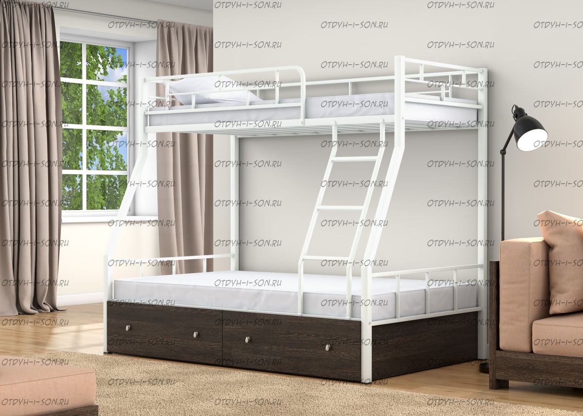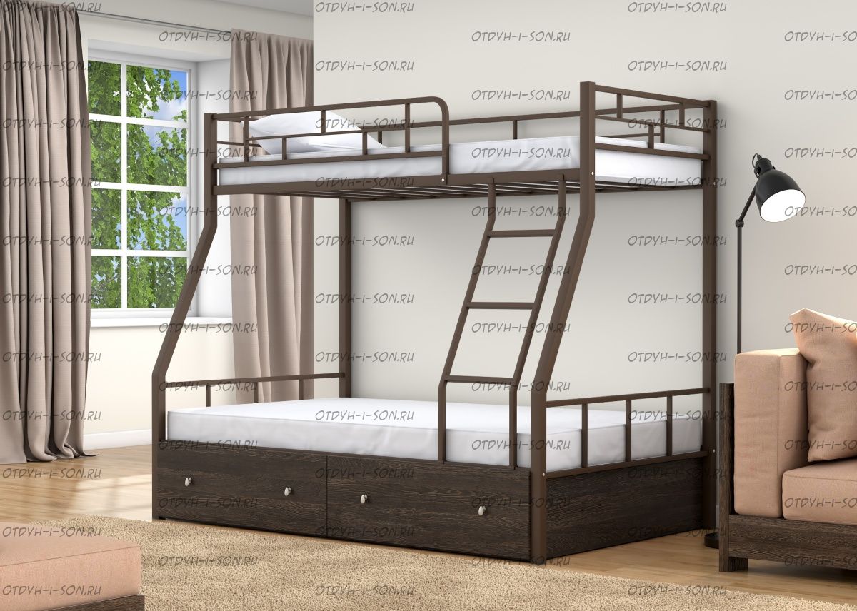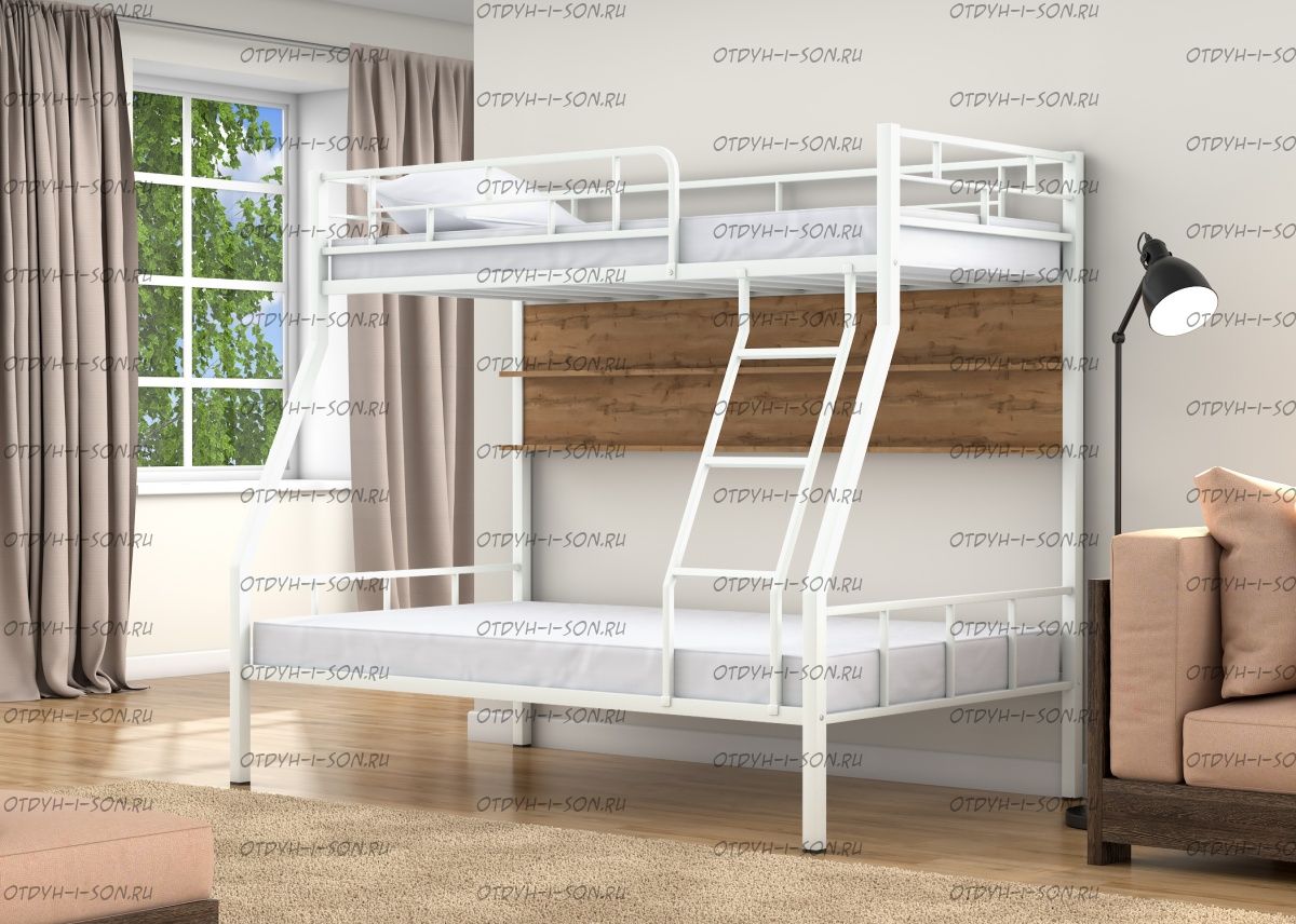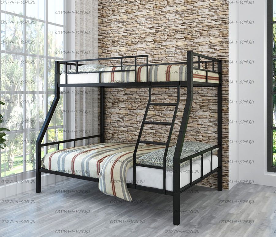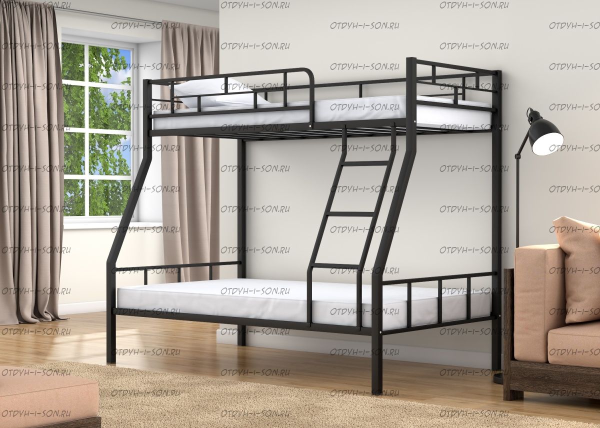 Кровать двухъярусная Раута Лофт Характеристики: Размер верхнего спального места: 90Х190 см. Размер нижнего спального места: 120х190 см. Внешние габариты (ДхШхВ): 1990Х1230х1710 мм. Высота от пола до спального места (мм.): 1370 Материалы каркаса: металл Диаметр трубы каркаса: Вес: 70 кг Максимальная нагрузка на спальное место: 180 кг. Кровать поставляется в разобранном виде Количество упаковок: Размер упаковки №1 1950/1200/100 (основание 2шт, защитный борт длинный 1шт, защитный борт короткий 1шт, лестница) Размер Упаковка №2 1400/1200/100 (боковины 2 шт, фурнитура) Цвета: коричневый, серый черный, слоновая кость