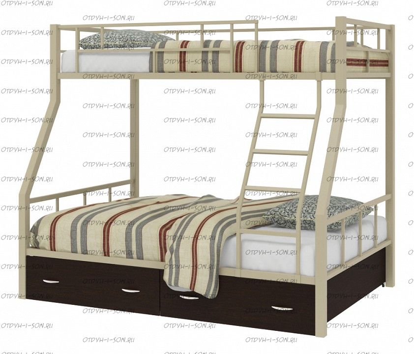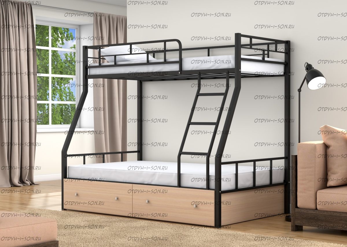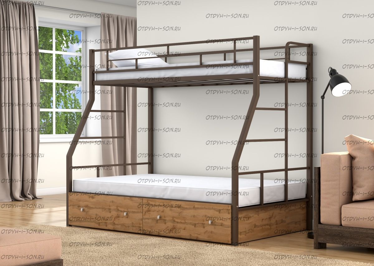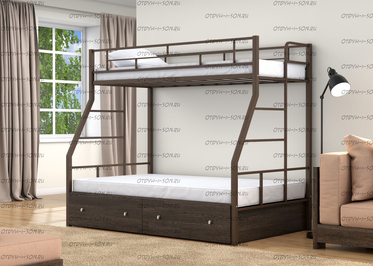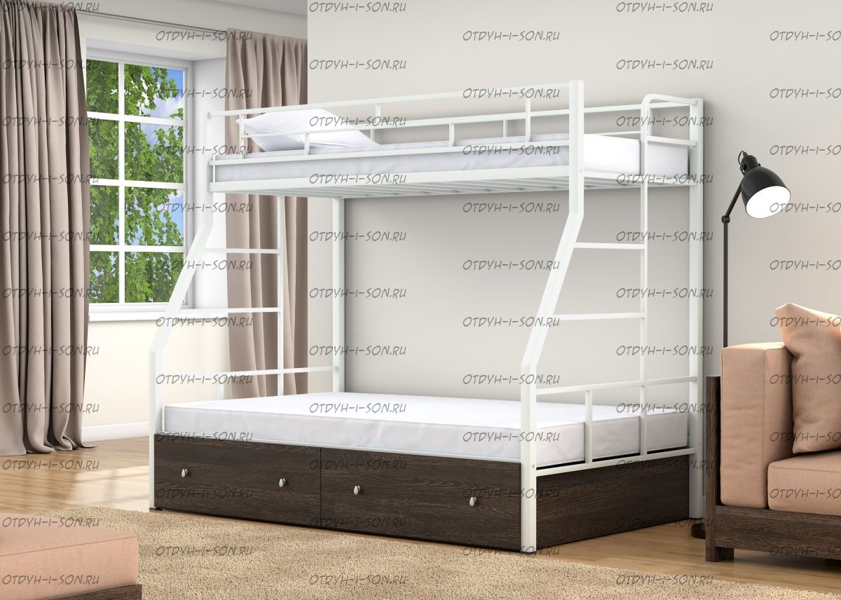 Кровать двухъярусная Раута Лофт Характеристики: Размер верхнего спального места: 90Х190 см. Размер нижнего спального места: 120х190 см. Внешние габариты (ДхШхВ): 1990Х1230х1710 мм. Высота от пола до спального места (мм.): 1370 Материалы каркаса: металл Диаметр трубы каркаса: Вес: 70 кг Максимальная нагрузка на спальное место: 180 кг. Кровать поставляется в разобранном виде Количество упаковок: Размер упаковки №1 1950/1200/100 (основание 2шт, защитный борт длинный 1шт, защитный борт короткий 1шт, лестница) Размер Упаковка №2 1400/1200/100 (боковины 2 шт, фурнитура) Цвета: коричневый, серый черный, слоновая кость