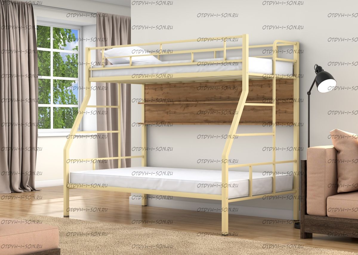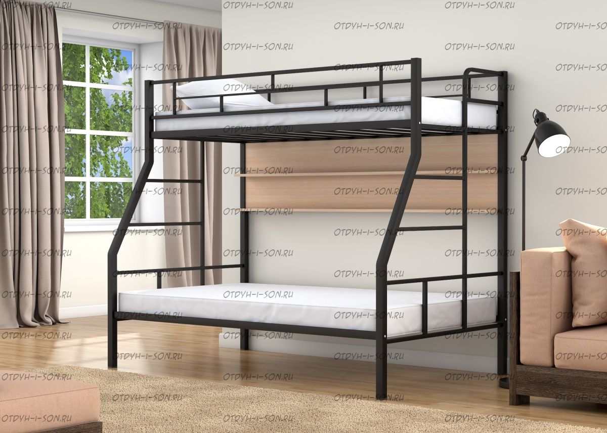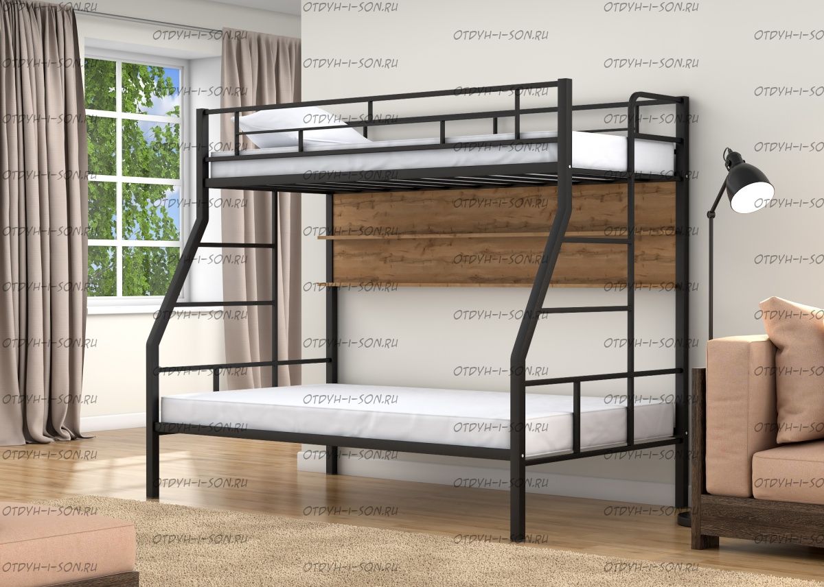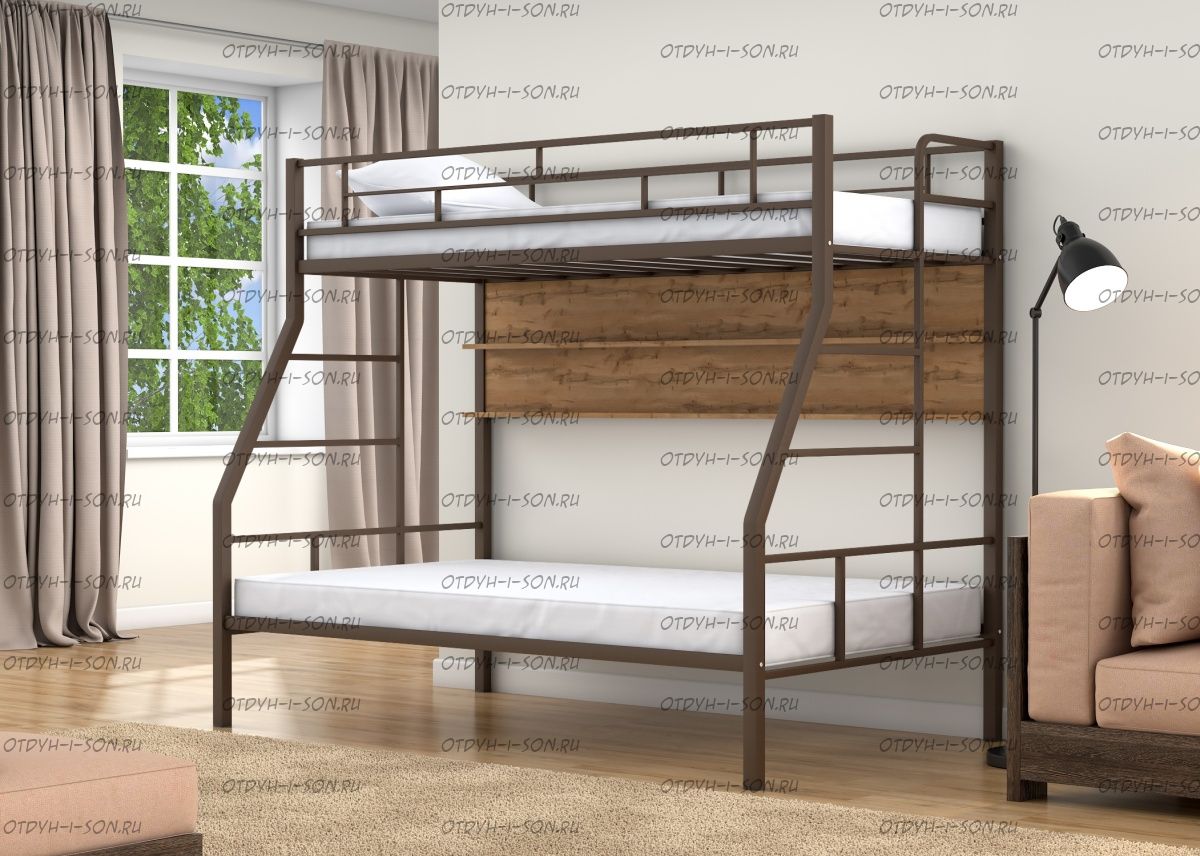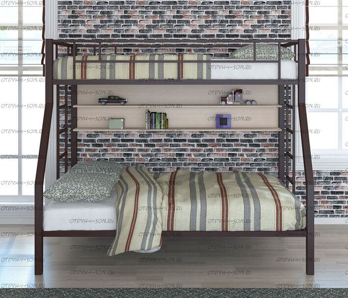 Кровать двухъярусная Раута Твист +П Лофт (с полкой) Характеристики: Размер верхнего спального места: 90Х190 см. Размер нижнего спального места: 120х190 см. Внешние габариты (ДхШхВ): 1990Х1230х1710 мм. Высота от пола до спального места (мм.): 1370 Материалы каркаса: металл Диаметр трубы каркаса: Вес: 70 кг Максимальная нагрузка на спальное место: 180 кг. Кровать поставляется в разобранном виде Цвета: коричневый, серый черный, слоновая кость