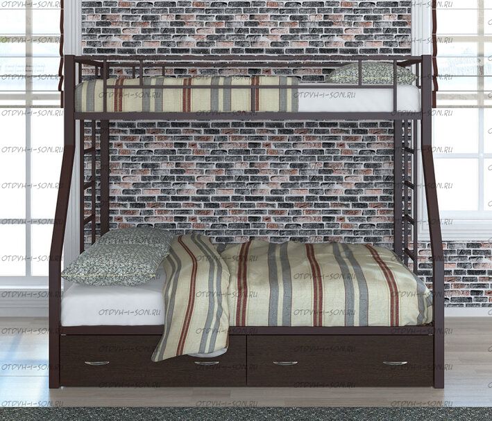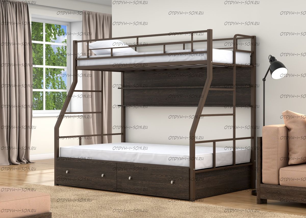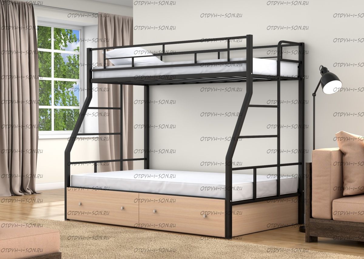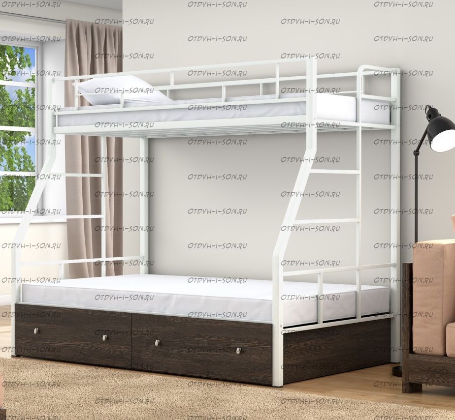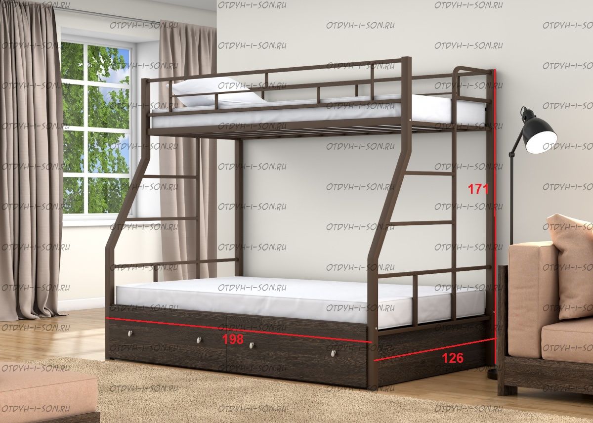 Кровать двухъярусная Раута Твист +Я Лофт (с ящиками) Характеристики: Размер верхнего спального места: 90Х190 см. Размер нижнего спального места: 120х190 см. Внешние габариты (ДхШхВ): 1990Х1230х1710 мм. Высота от пола до спального места (мм.): 1370 Материалы каркаса: металл Диаметр трубы каркаса: Вес: 70 кг Максимальная нагрузка на спальное место: 180 кг. Кровать поставляется в разобранном виде Цвета: коричневый, серый черный, слоновая кость