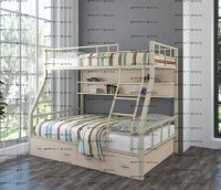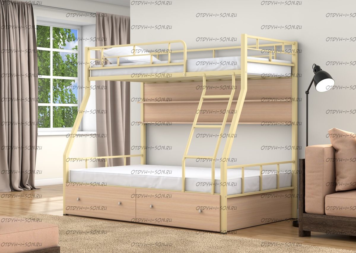 Кровать двухъярусная Раута +ЯП Лофт Характеристики: Размер нижнего спального места (см.): 120х190 Размер верхнего спального места (см.): 90х190 Габариты (ДхШхВ) см.: 199 х 126 х 171 см. Тип: универсал - лестница крепится как слева, так и справа Вес (кг.): 65 Цвет каркаса: бежевый, коричневый, черный