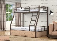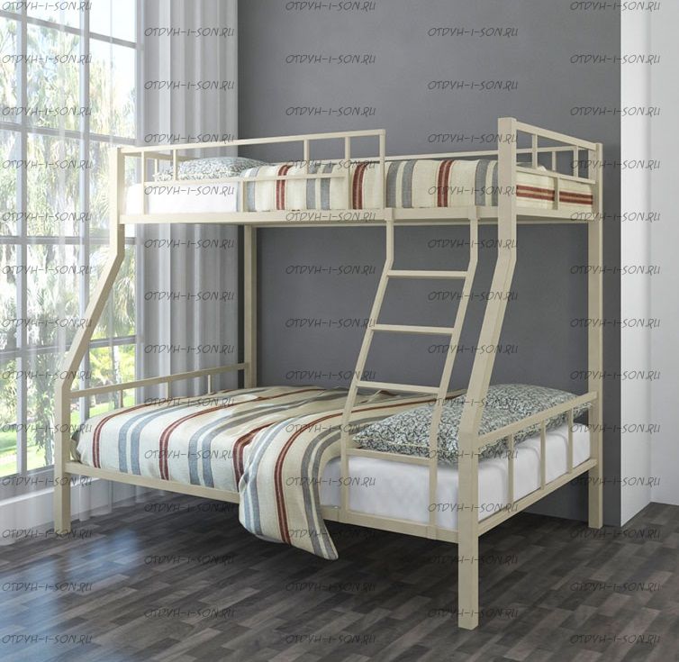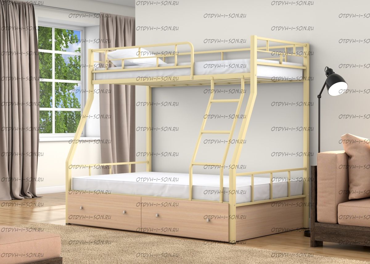 Кровать двухъярусная Раута-2 Лофт с ящиками Характеристики: Размер верхнего спального места: 90Х190 см. Размер нижнего спального места: 120х190 см. Внешние габариты (ДхШхВ): 1990Х1230х1710 мм. Высота от пола до спального места (мм.): 1370 Материалы каркаса: металл Диаметр трубы каркаса: Вес: 70 кг Максимальная нагрузка на спальное место: 180 кг. Кровать поставляется в разобранном виде Количество упаковок: Размер упаковки №1 1950/1200/100 (основание 2шт, защитный борт длинный 1шт, защитный борт короткий 1шт, лестница) Размер Упаковка №2 1400/1200/100 (боковины 2 шт, фурнитура) Цвета: коричневый, серый черный, слоновая кость