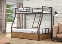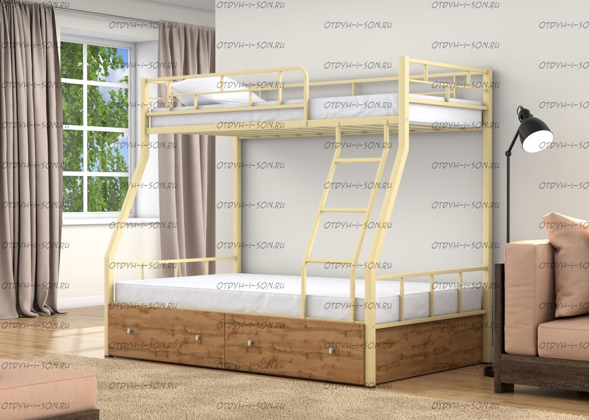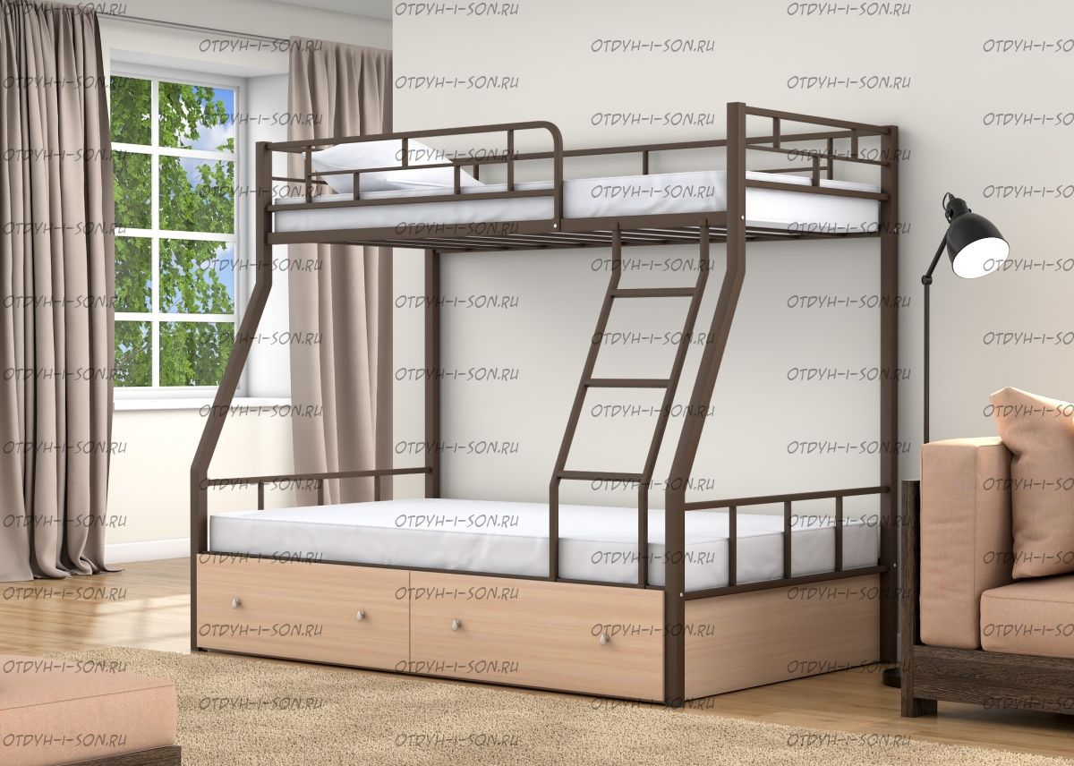Кровать двухъярусная Раута-2 Лофт с ящиками Характеристики: Размер верхнего спального места: 90Х190 см. Размер нижнего спального места: 120х190 см. Внешние габариты (ДхШхВ): 1990Х1230х1710 мм. Высота от пола до спального места (мм.): 1370 Материалы каркаса: металл Диаметр трубы каркаса: Вес: 70 кг Максимальная нагрузка на спальное место: 180 кг. Кровать поставляется в разобранном виде Количество упаковок: Размер упаковки №1 1950/1200/100 (основание 2шт, защитный борт длинный 1шт, защитный борт короткий 1шт, лестница) Размер Упаковка №2 1400/1200/100 (боковины 2 шт, фурнитура) Цвета: коричневый, серый черный, слоновая кость
