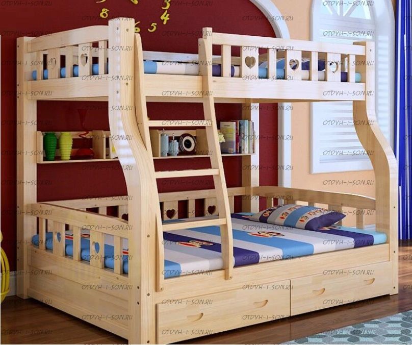 Кровать двухъярусная Рената с ящиками Характеристики: Размер спального места верхнего яруса: 80х180 см, 80х190 см, 90х190 см., 90х200 см. (и любые другие на Ваш вкус) Размер спального места нижнего яруса: 80х190, 80х200, 90х190, 90х200, 120х190, 120х200, 130х200, 140х190 см. (и любые другие на Ваш вкус) Внешние размеры: +55 см. к длине спального места кровати и + 12 см. к ширине спального места кровати. Высота кровати от пола: 190 см. Расстояние между ярусами: 85 см. Внешние размеры лестницы (ШхГхВ): 45х90х190 см. Ящики размеры каждого: 65 х 65 см. Высота борта верхнего яруса: 47-48 см. Кровать может быть разъединена на 2 отдельных кровати высотой: Нижнее спальное место, общая высота: 98 см. Верхнее спальное место, общая высота: 92 см. Материал: массив сосны Внимание: у данной модели кровати в ящиках подкроватных выпилы вместо ручек, как на втором фото. Возможны нестандартные размеры При размере 90х190 + 140х190 вес и объем кровати: 170 кг., 1,24 м3 При размере 90х190 + 90х190 вес и объем кровати: 250 кг., 2.45 м3 Цвет (морилка): беленый дуб, средний орех, сосна (натуральный), венге, светлый орех, ольха, орех, бук, красное дерево, клен красный, груша Цвет (эмаль) (+20 % от стоимости): фисташковый, белый, черный, темно-зеленый, слоновая кость (белый в бежевый), сиреневый, синий, светло-зеленый, розовый, красный, желтый, дуб молочный (белый в розовый), голубой Комплектация: Кровать двухъярусная Лейла Лестница, которая выполняется с любой стороны кровати по Вашему запросу. Расположение лестницы кровати не универсально и указывается Матрас докупается отдельно Продукция фабрики не подлежит возврату в случае: механических повреждений по вине получателя; потери товарного вида по вине получателя; если изначально было заказано изделие нестандартного цвета или размера; Внимание: для любой модели кровати возможно увеличение высоты бортиков кровати! Возможно изготовление кровати нестандартных размеров по вашим замерам, доплата за нестандартный размер: - за кровать + 10% от стоимости изделия; Производство Владимирской мебельной фабрики, кровать доставляется напрямую от производителя, самовывоз ограничен.