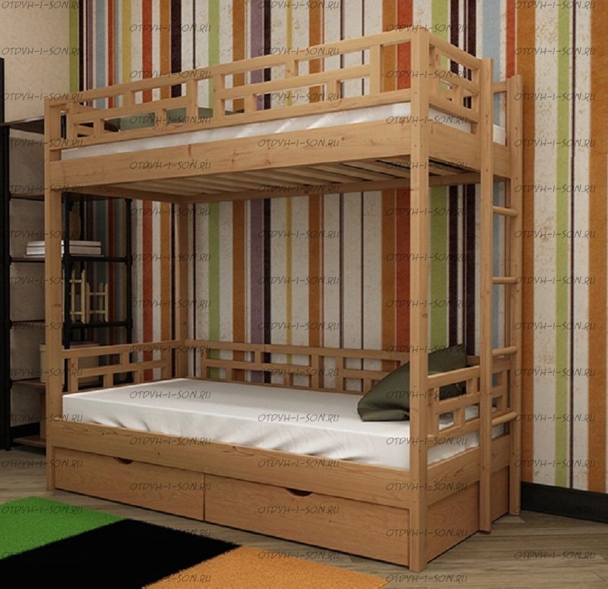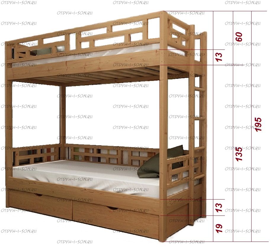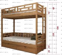 Кровать двухъярусная Руфина №40 Характеристики: •Размер спальных мест: любые •Внешние габариты (ШхГхВ): см. •Материалы: массив сосны •Цвет покрытия: любая цветовая гамма (таблица палитры Ral);