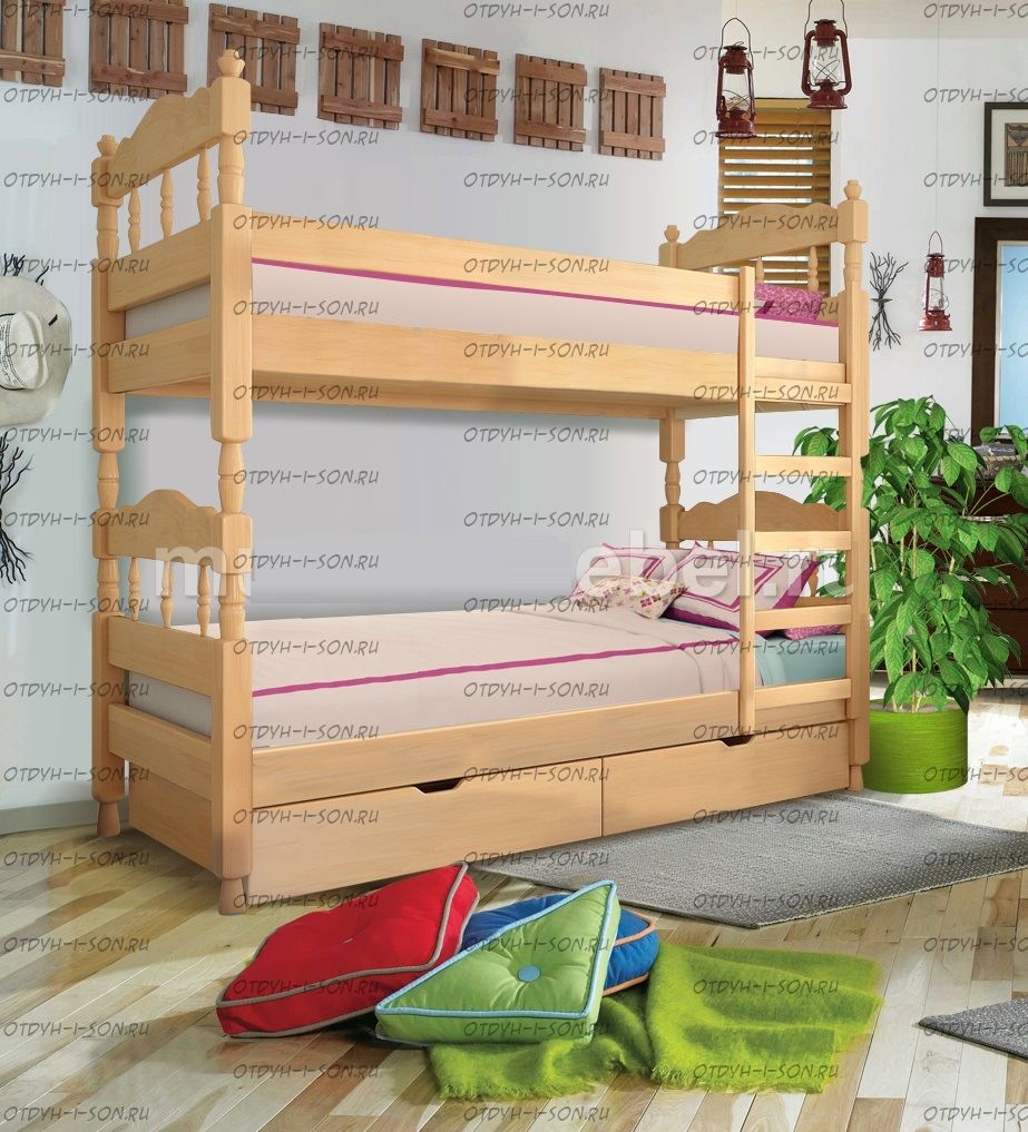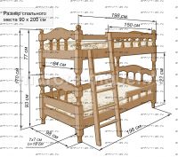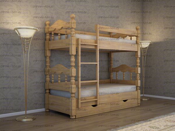 Кровать двухъярусная Точеная Солнышко (точеные элементы будут ближе к второму фото) Комплектация: Обязательно при заказе указывайте тип лестницы: прямая или наклонная лестница. Характеристики: Размер спального места: 80х190/200, 90х190/200 см. Внешние габариты: + 15 см Высота борта: 22 см Общая высота: 170 см Комбинированная кровать: Массив сосны и вставки из экологически чистой мебельной фанеры Данная кровать разбирается на две отдельные кровати. Спинка в изголовье имеет резные элементы с художественной резьбой Габариты кроватей: Высота днища кроватей: Основание кровати: да, в комплекте Ящики изготавливаются на колесиках и не прикрепляются к кровати, поэтому могут устанавливаться "лицом" к любой из боковыйх сторон кровати. Высота спинки в изголовье кровати: Крепления кровати: В базовом варианте с тыльной стороны ящиков декоративной планки не предусмотрено. Вес: 45-60кг. Любые размеры, в том числе и нестандартные Цвет: венге 1, венге 2, венге 3, венге 4, венге тон 2, коричневый тон 2, коричневый 1, коричневый 2, коричневый 3, коричневый 4, красно-коричневый тон 2, красно-коричневый 1, красно-коричневый 2, красно-коричневый 3, красно-коричневый 4, лак Изготовление из массива березы плюс 30% Изготовление в белом цвете или слоновая кость плюс 20%