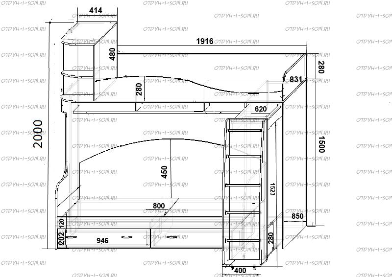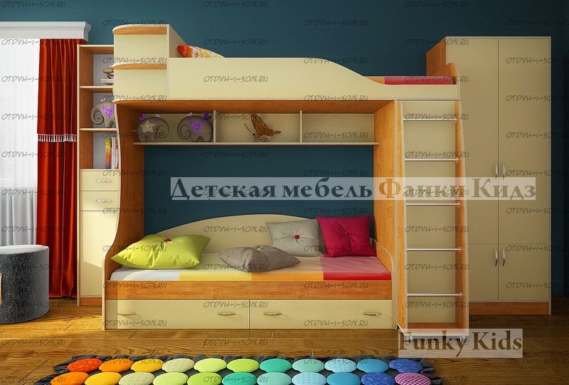 Только двухъярусная кровать (согласно схеме), стеллажи и шкафы докупаются отдельно.