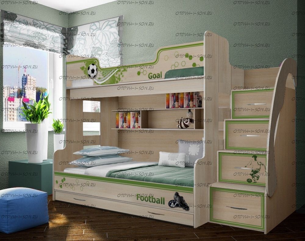 Кровать двухъярусная Футбол Фанки Кидз ФУТ-21, трехместная. На странице представлена двухъярусная кровать серии Капитан. Отличается она от других моделей наличием сразу три спальных места и может приобретаться для троих детей: 190х90 см - верхний ярус с бортиком-ограничителем; 190х110 см - нижнее расширенное место для сна и отдыха; 180х90 см - выкатной элемент, который так же используется в качестве ящика для хранения.