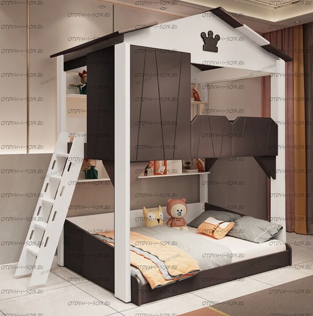 Кровать двухъярусная домик Roof Шале №38 Комплектация: Кровать двухъярусная Домик Ящики подкроватные Лестница Характеристики: •Размеры верхнего спального места: 80х160 см.,90х180 см.,90х200 см.и любые другие •Размеры нижнего спального места: 80х160 см.,90х180 см.,90х200 см.и любые другие •Габаритные размеры: любые •Материалы: массив сосны •Цвет покрытия: любая цветовая гамма (таблица палитры Ral);
