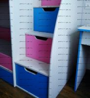 Кровать двухъярусная Юниор-9 со ступенями изготовлена из высококачественного ЛДСП. Кровать подойдет для маленьких детей, так как данная модель оснащена лесенкой в виде ступенек, по которым удобно подниматься на верхний ярус и спускаться вниз и для подростков. В ступенях выдвижные ящики (на роликовых направляющих). Внизу один выкатной ящик на колесиках, внутри поделен на 2 секции.