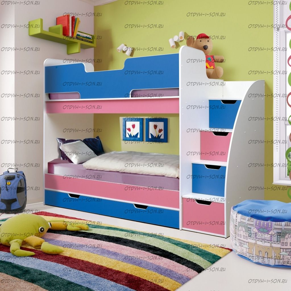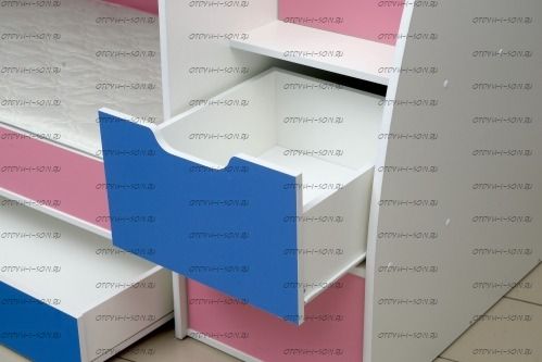 Кровать двухъярусная Юниор 9 белый+ярко-розовый+синий Технические характеристики Производитель: Россия Материал изготовления: ЛДСП Общие габариты (см): 243*175*85