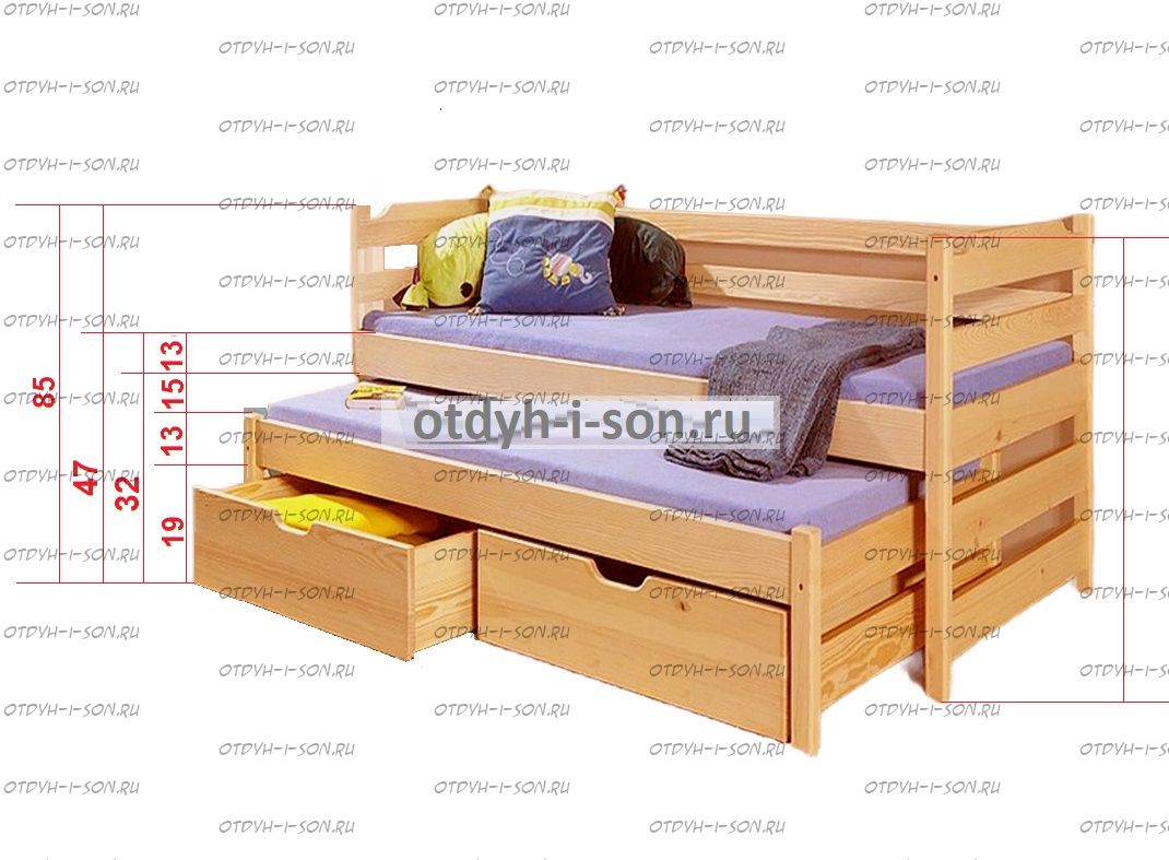 Кровать двухъярусная выкатная Меган №6W, любые размеры Характеристики: Размер спального места на выбор: 70х140, 70х160, 80Х190, 80Х200, 90Х190, 90Х200, 100х190, 100х200, 120х190, 120х200 см. и любые другие Габаритные размеры кровати: +8 см. к ширине, +8 см. к длине. (спального места) Высота изголовья 93 см; (уточняйте у оператора) Высота изножья: 93 см. (уточняйте у оператора). Высота от пола до нижней царги: 19 см. Высота от пола до верхней царги: 44 см. Высота каждой царги: 13 см. Глубина утапливания матраса: 6,5 см. Подкроватные ящики: за дополнительную плату Материалы: сосна и мебельная фанера. Также возможно изготовление мебели из массива дуба, бука, ясеня. Возможно изготовление кроватей любых габаритных размеров. Крепление узлов кровати: специальные кроватные стяжки, саморезы, мебельный крепеж, пластиковые заглушки в цвет изделия. Боковые царги кровати закрепляются к спинкам при помощи надежных кроватных стяжек, которые не видны снаружи. Вес в упаковке: 40 кг +/- 10 кг Объём в упаковке: 0,8 м3 +/- 0,1 м3; Кол-во мест: 3 шт (Уточняйте, параметры зависят от размеров спального места) Цвет: орех, бук, венге, груша, дуб, каштан, клен, красное дерево, махагон, ольха, сосна, белый (эмаль), слоновая кость (эмаль)