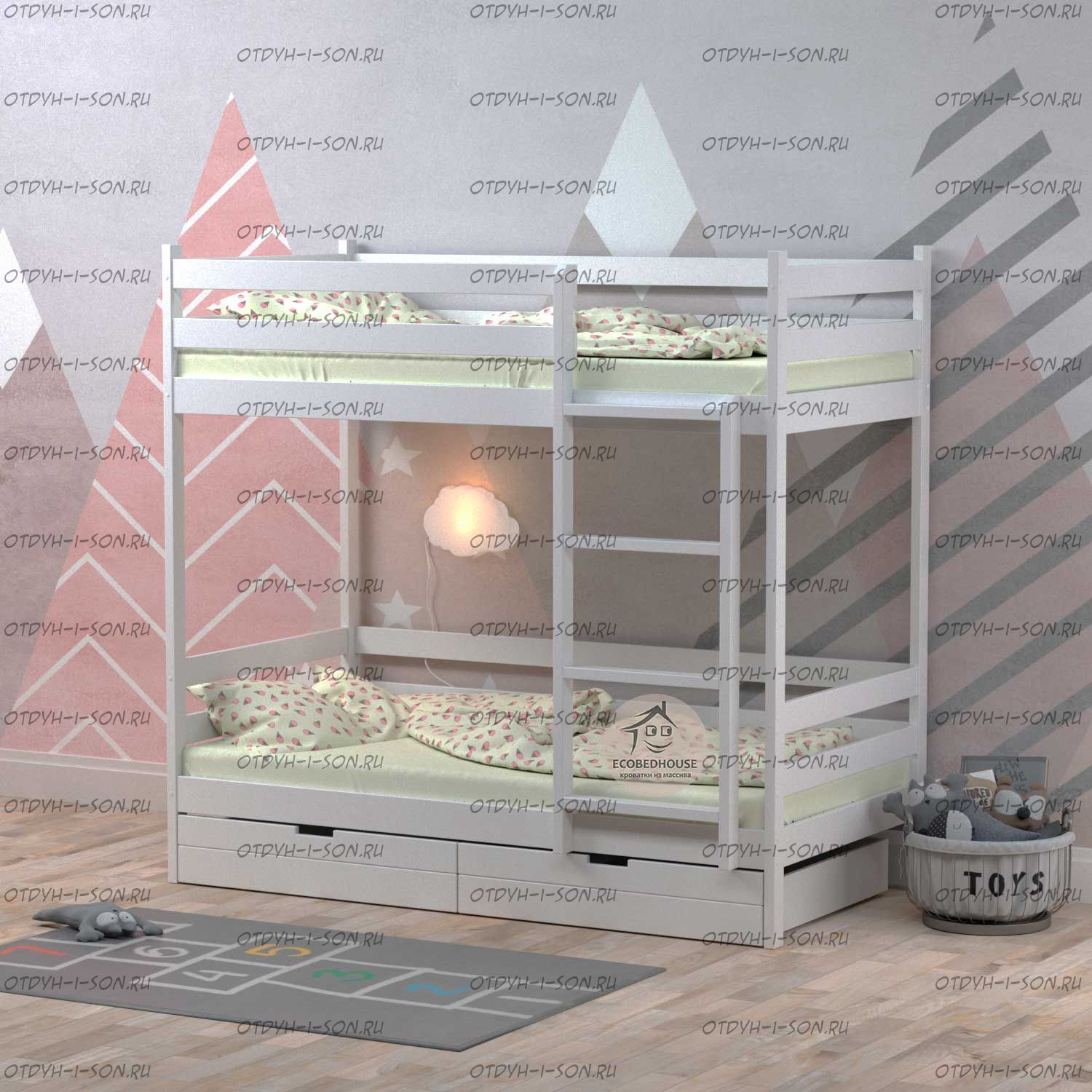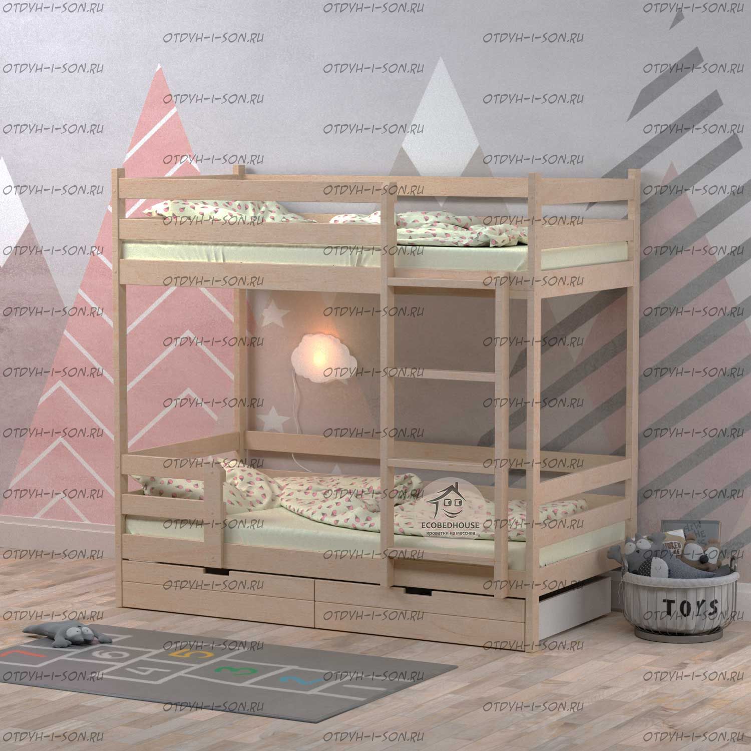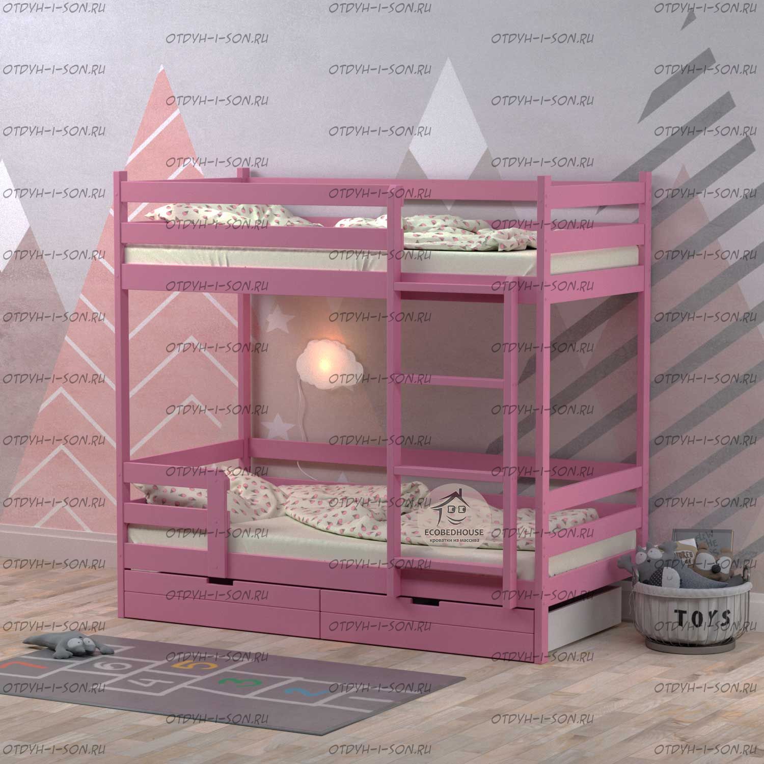 Кровать двухъярусная Меган 1 Fairy Tail массив березы. Характеристики: Размер спального места на выбор: 70х140, 70х160, 80Х190, 80Х200, 90Х190, 90Х200, 100х190, 100х200, 120х190, 120х200 см. и любые другие Габаритные размеры кровати: +7 см. к ширине, +8 см. к длине. (спального места) высота борта - 360 мм высота между ярусами - 1000 мм высота от пола до спального места - 270мм брусок каркаса - 50х40 мм вес кровати - 55 кг, с ящиками 80 кг максимальная нагрузка на ложе - 200 кг для детей от 4 до 18 лет Глубина утапливания матраса: 5-6 см. (уточняйте у оператора) Подкроватные ящики: за дополнительную плату Материалы: массив березы. Возможно изготовление кроватей любых габаритных размеров. Крепление узлов кровати: специальные кроватные стяжки, саморезы, мебельный крепеж, пластиковые заглушки в цвет изделия. Боковые царги кровати закрепляются к спинкам при помощи надежных кроватных стяжек, которые не видны снаружи. Вес в упаковке: 100 кг +/- 10 кг Объём в упаковке: 1 м3 +/- 0,1 м3; Кол-во мест: 3 шт (Уточняйте, параметры зависят от размеров спального места) Цвет: натуральный массив, белый, серый, розовый, лак 1. Дерево выдерживает большие нагрузки, особенно ударные; 2. Высокая плотность и упругость - служба десятилетиями без сколов, трещин и потери прочности; 3. Не расшатывается со временем; 4. Безопасность для аллергиков - не пахнет; 5. Кроватка из натурального дерева ионизирует и освежает воздух в комнате. Детская кроватка окрашена безопасной водо-дисперсионной краской, специально разработана для детской мебели Выдерживает до 200 кг, собирается с помощью стяжек винт в бочонок. Легко соберете кроватку по подробной инструкции Гарантия 12 месяцев 6. В комплекте уже идут заглушки на винты и наклейки на неиспользуемые отверстия. ✅Дополнительно: -вместительные ящики на колёсиках или третье спальное место. Глубина ящика 75 см.