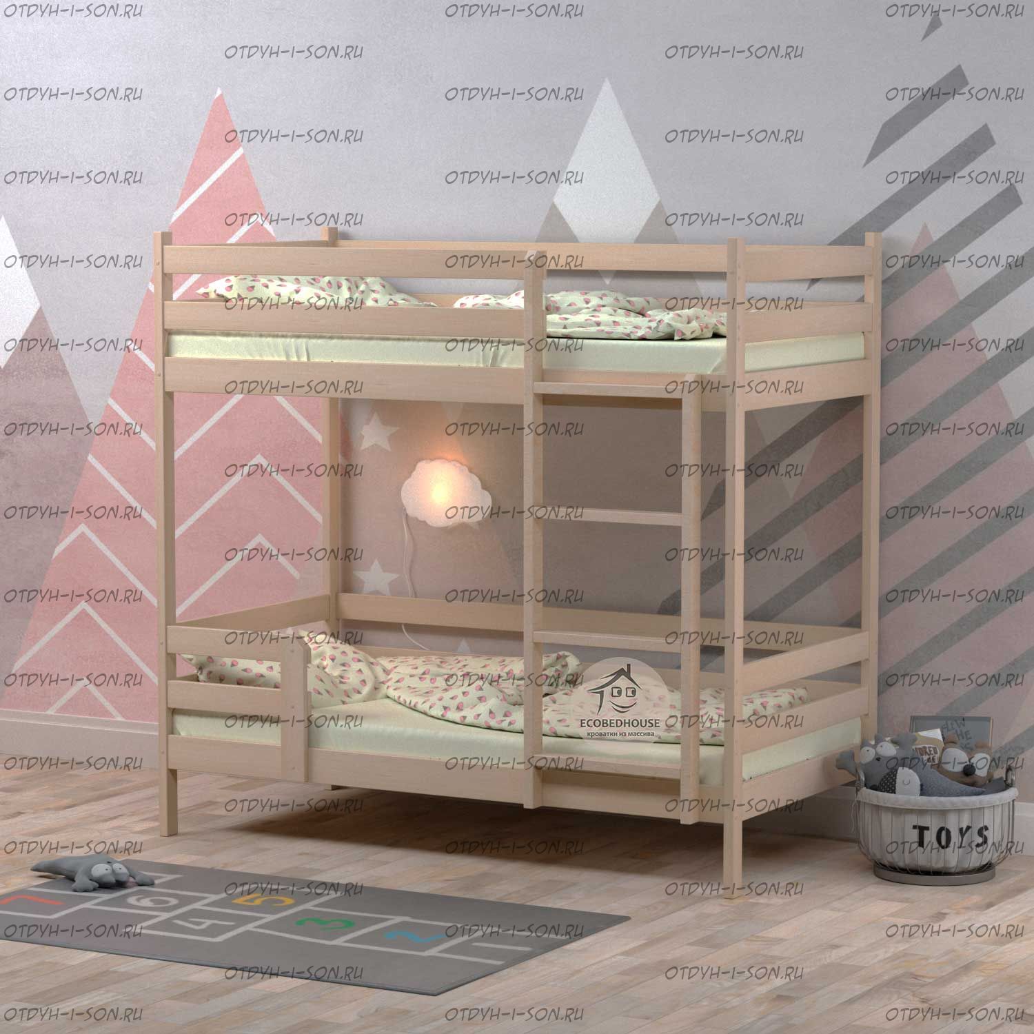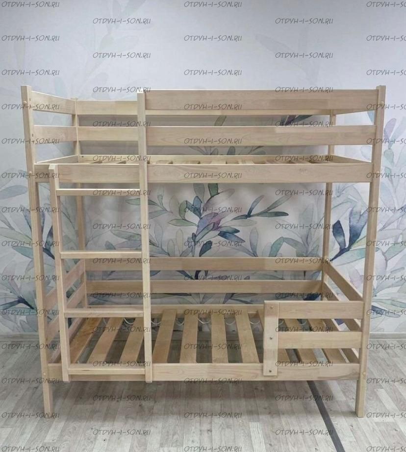 Двойная кровать из массива берёзы с лестницей с торца для двоих детей от 2-х лет серии ECO.