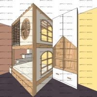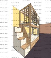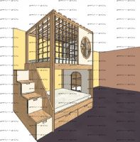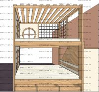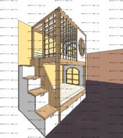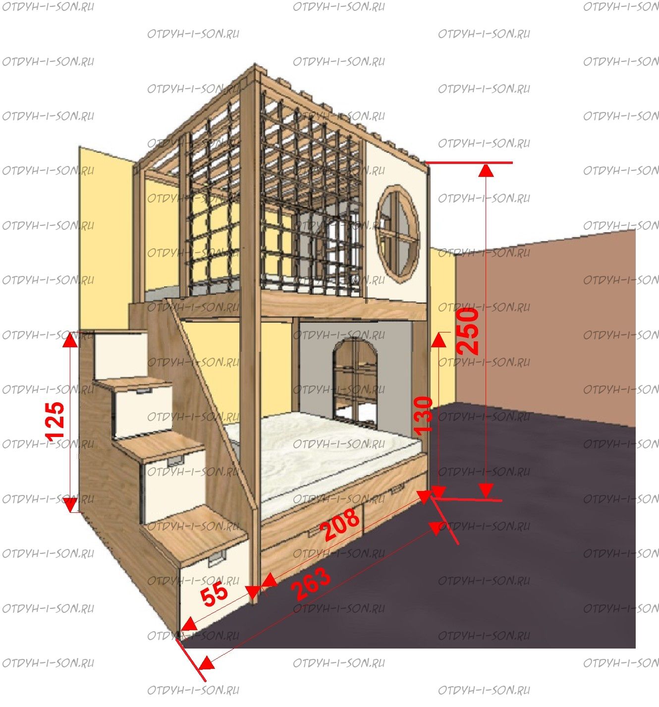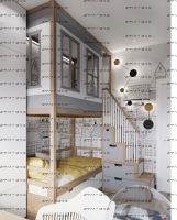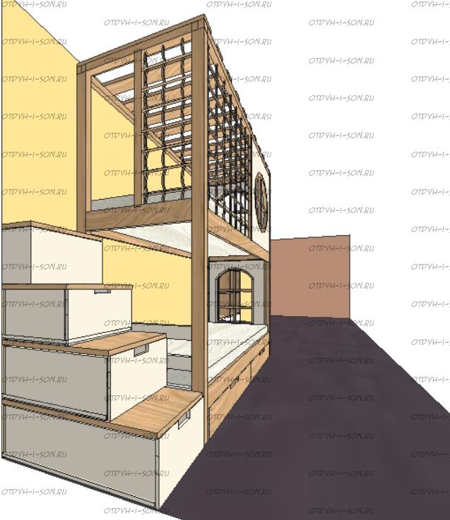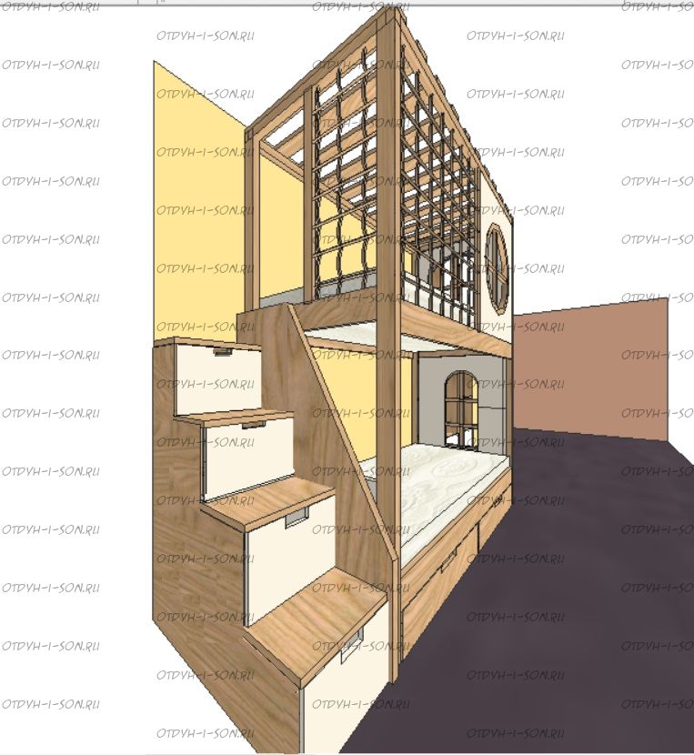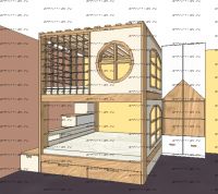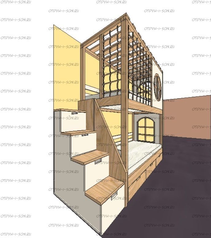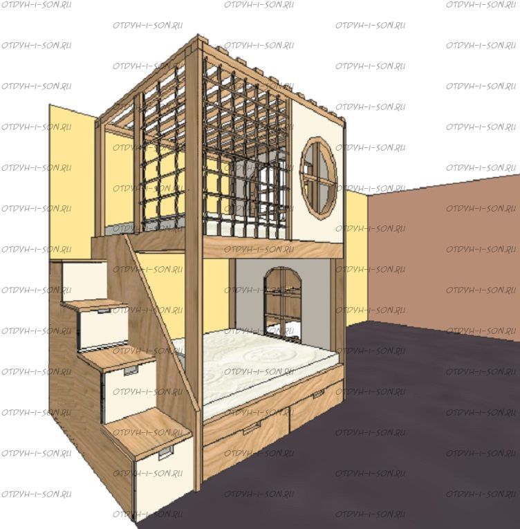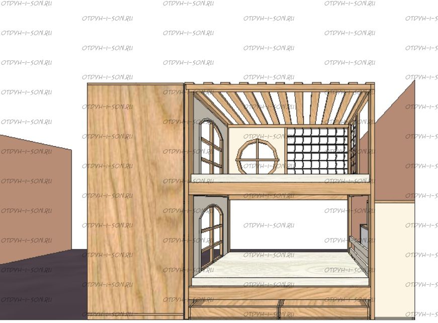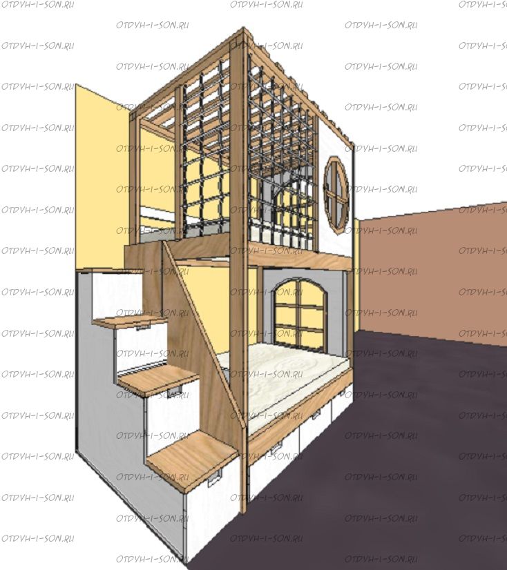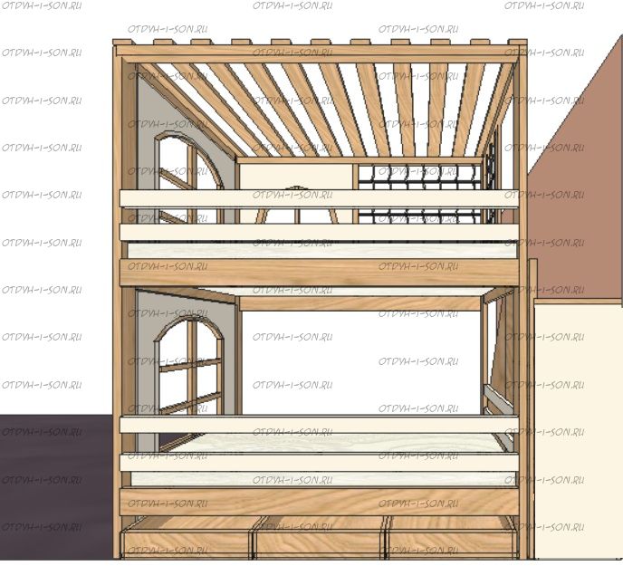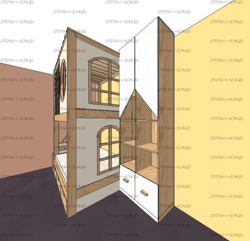 Кровать двухъярусная, Кровать-домик Santana Sky №8 может быть изготовлена с кроватью для новорожденного внизу или как трехъярусная кровать, а также в любых размерах и цветах. Характеристики: