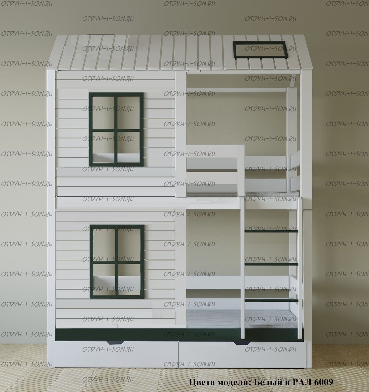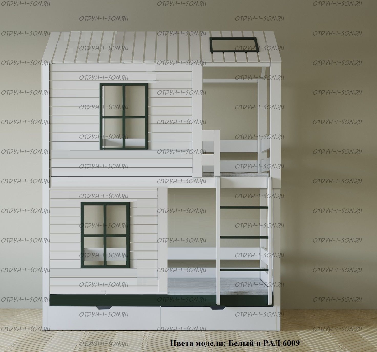 Кровать двухъярусная, Кровать-домик Felicia, два окна. Возможно изготовление кровати-домика с четырьмя окнами. Характеристики: Любые размеры и цвета. Подкатное спальное место рассчитывается дополнительно.