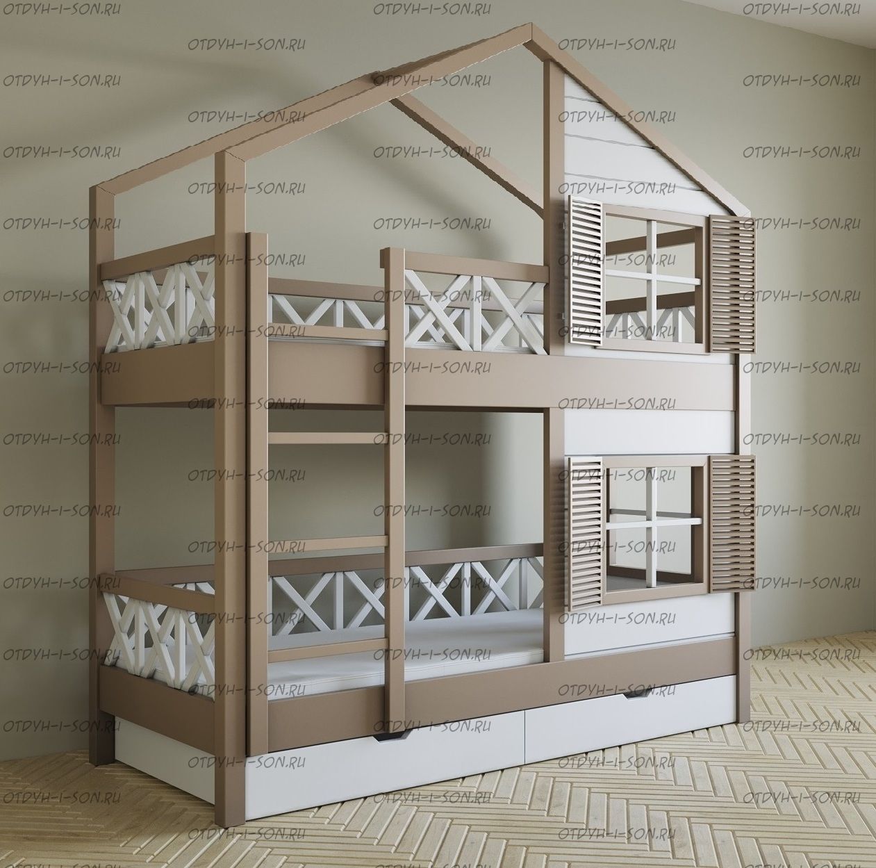 Кровать двухъярусная домик Прованс Roof №5Y3 с тремя окнами может быть изготовлена с кроватью для новорожденного внизу или как трехъярусная кровать, а также в любых размерах и цветах.