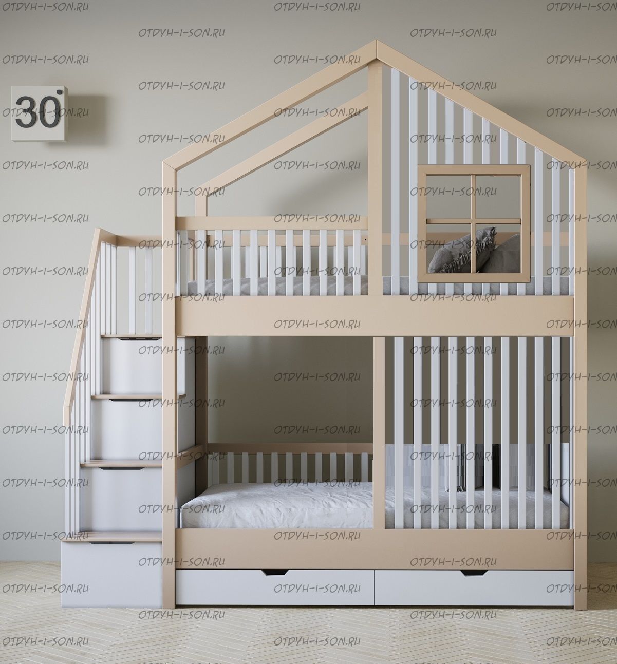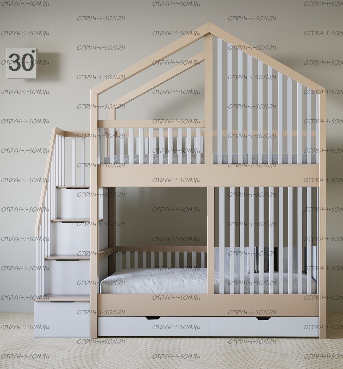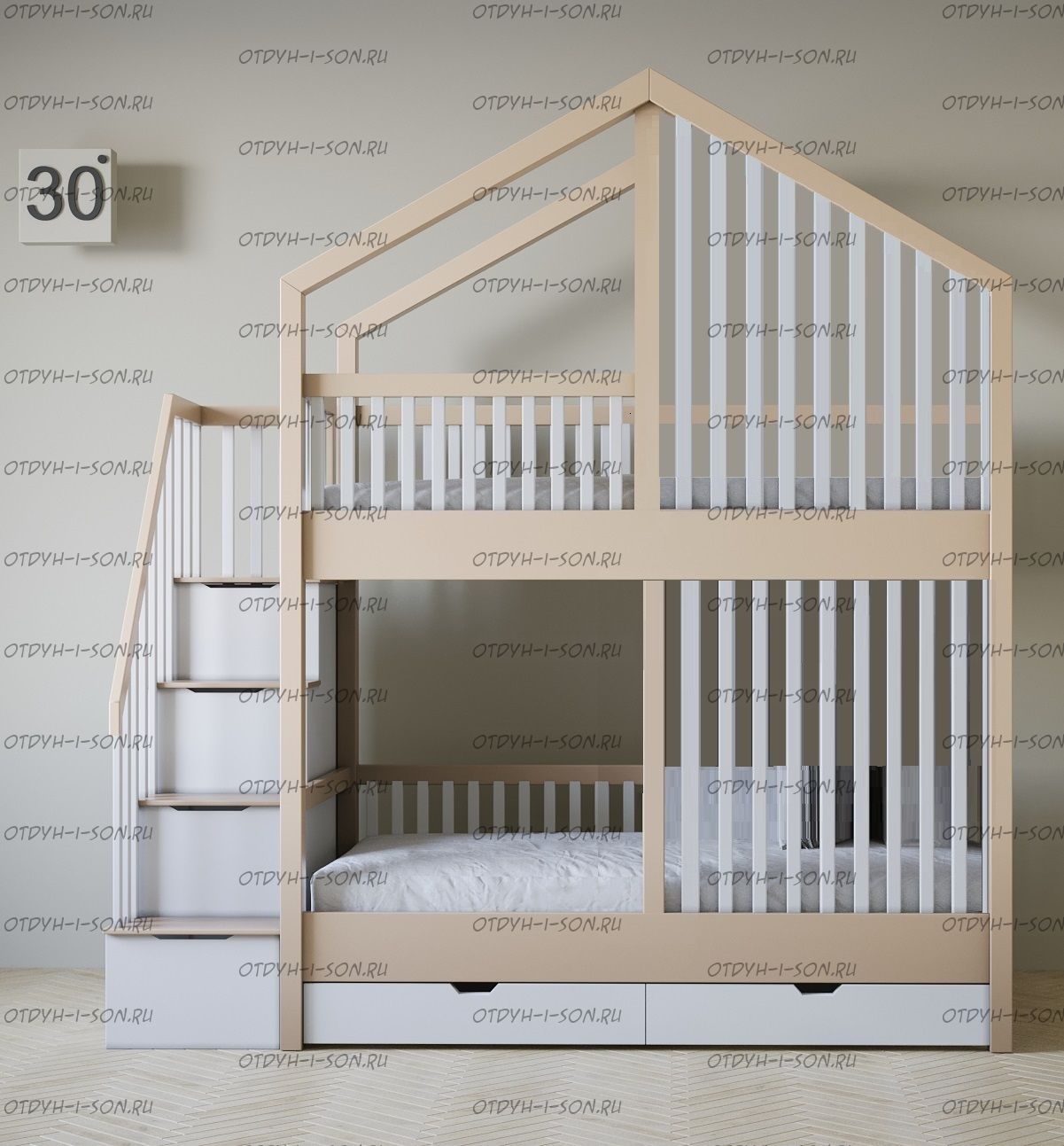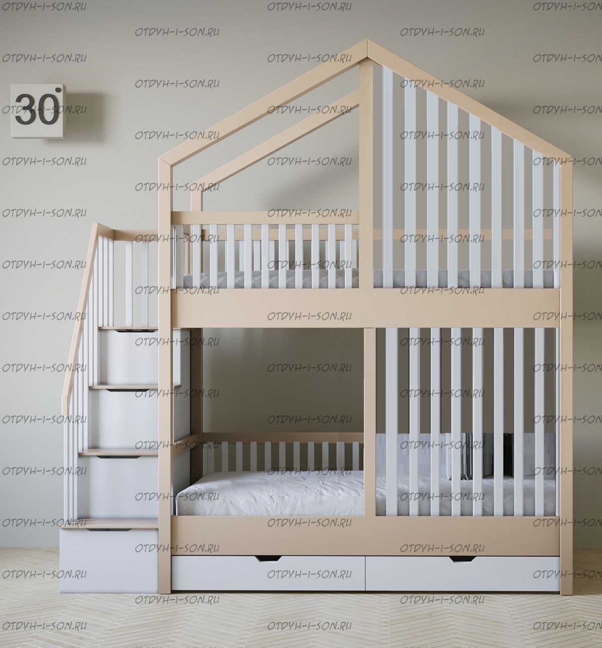 Кровать двухъярусная домик Roof №5Y2+ может быть изготовлена с кроватью для новорожденного внизу или как трехъярусная кровать, а также в любых размерах и цветах.