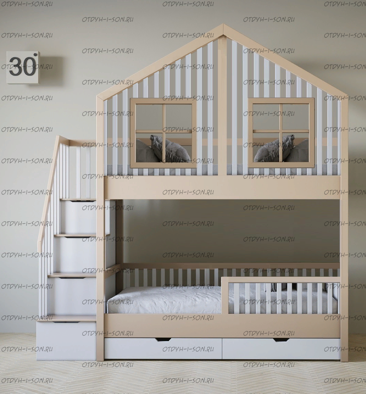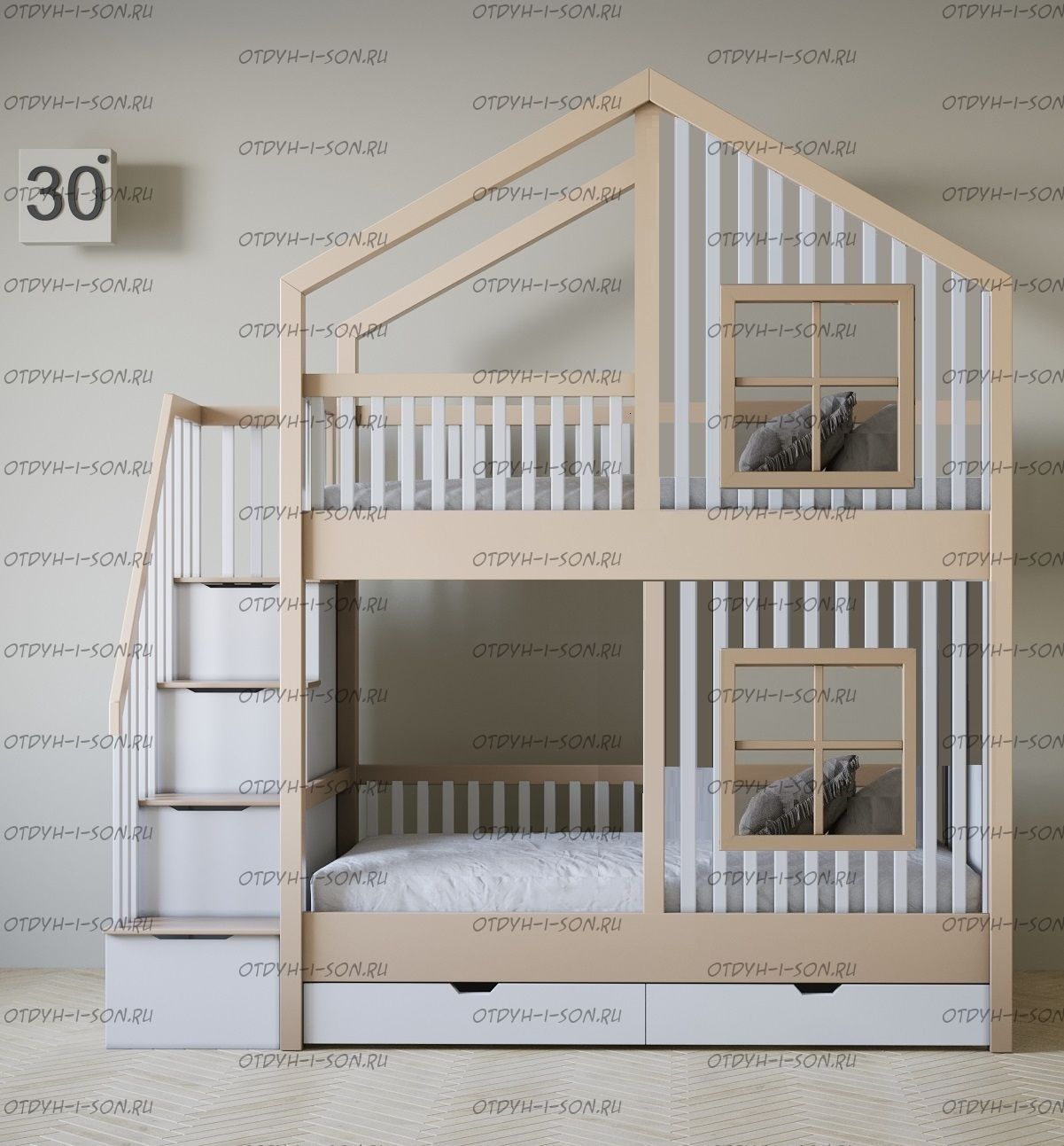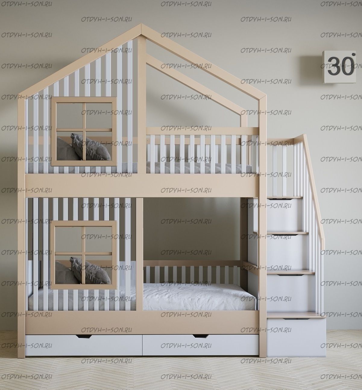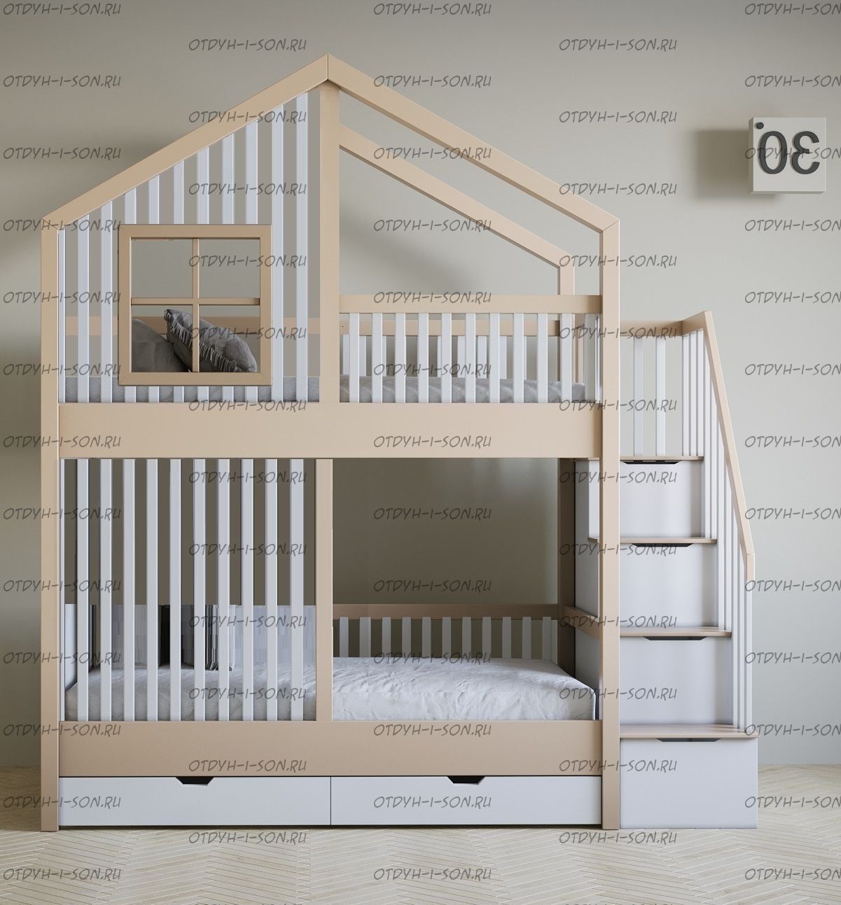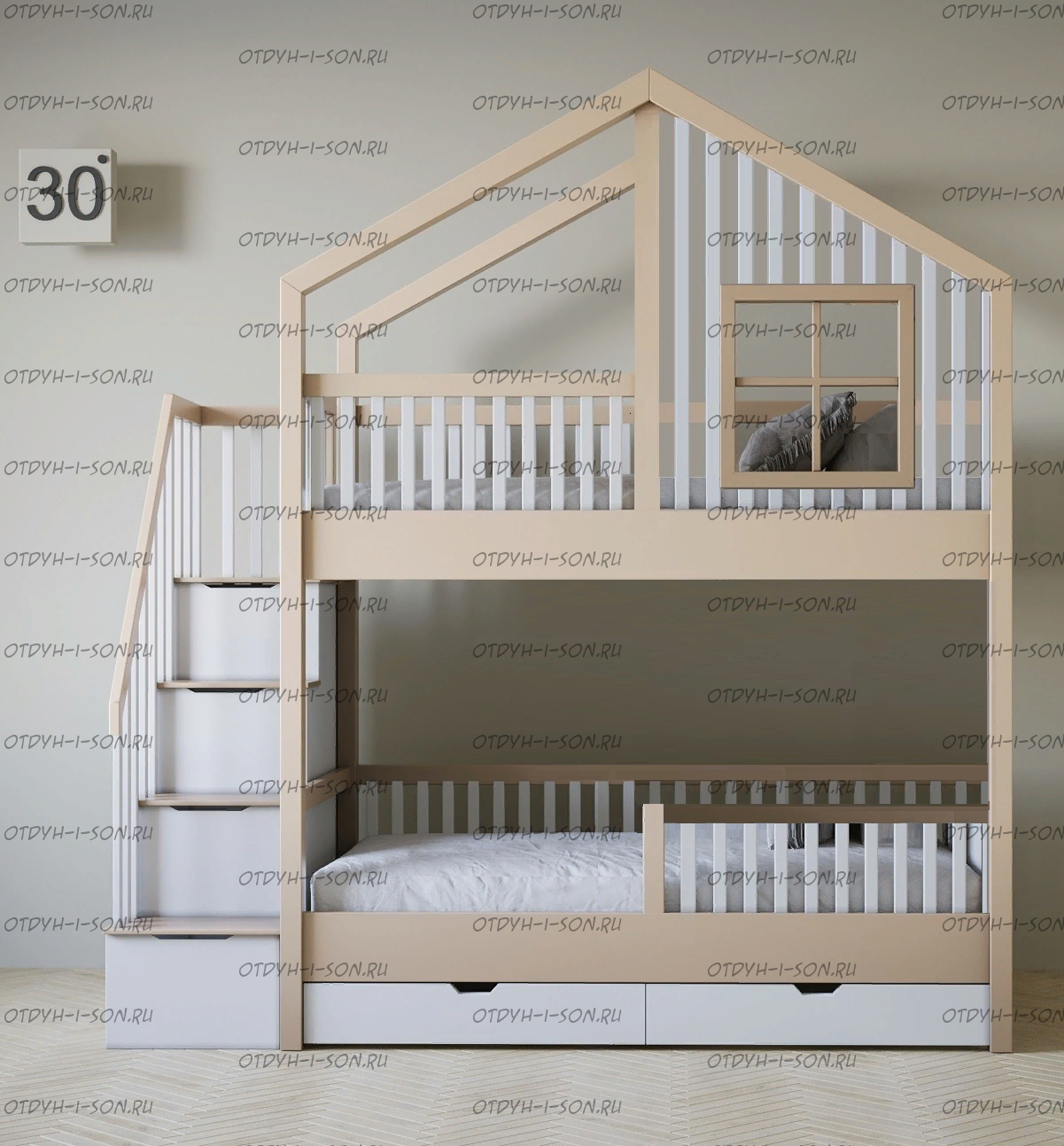 Кровать двухъярусная домик Roof №5Y2+ может быть изготовлена с кроватью для новорожденного внизу или как трехъярусная кровать, а также в любых размерах и цветах.