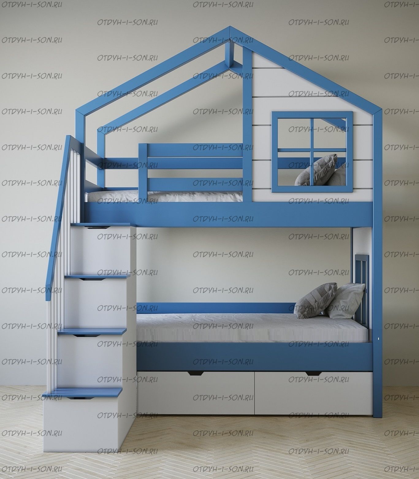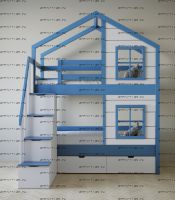 Кровать двухъярусная домик Roof Corner Style №5N3 может быть изготовлена с кроватью для новорожденного внизу или как трехъярусная кровать, а также в любых размерах и цветах.