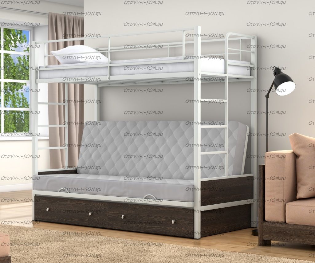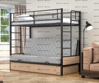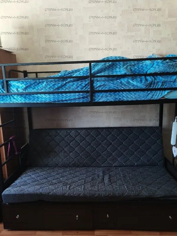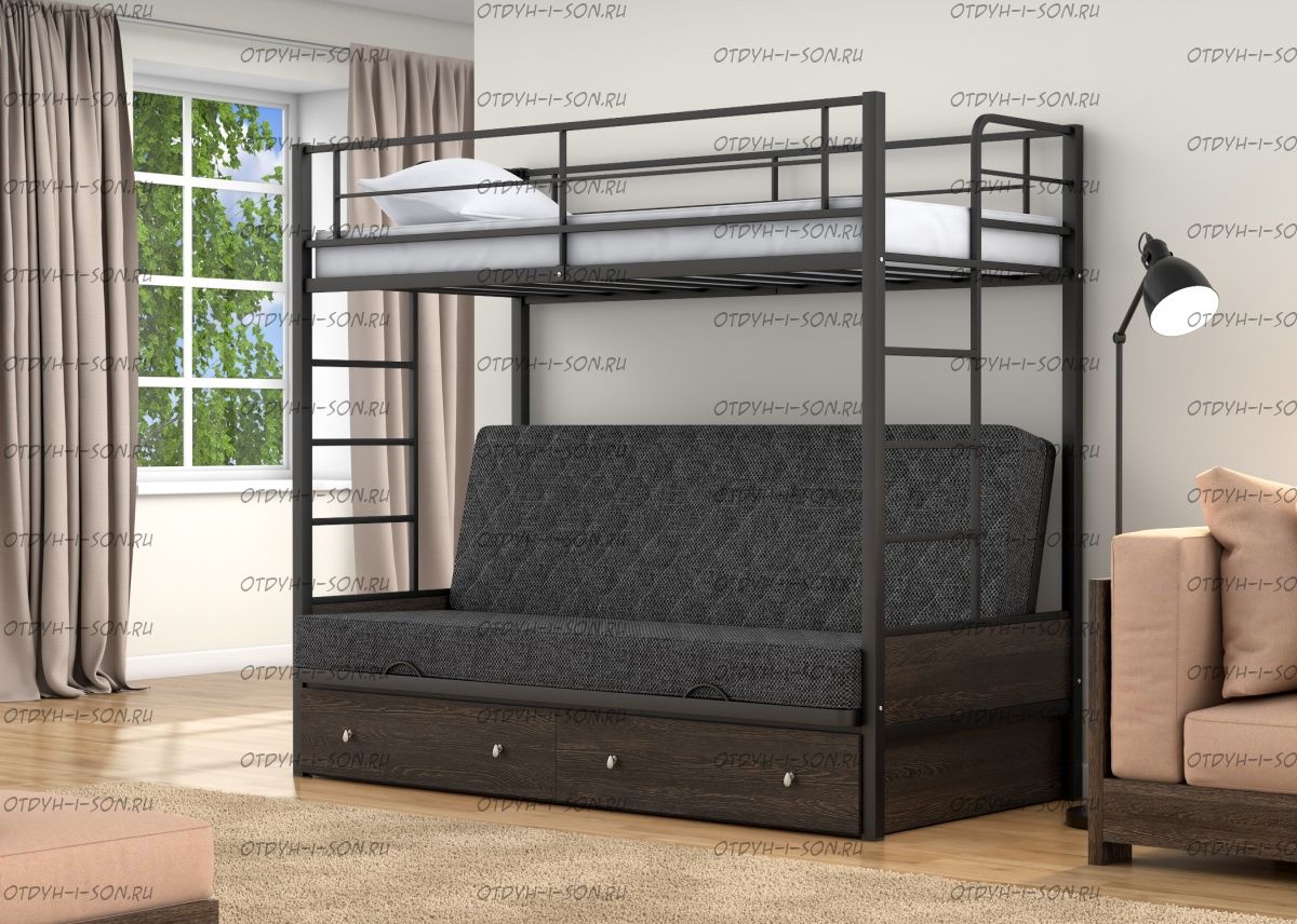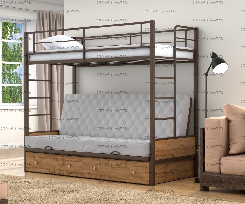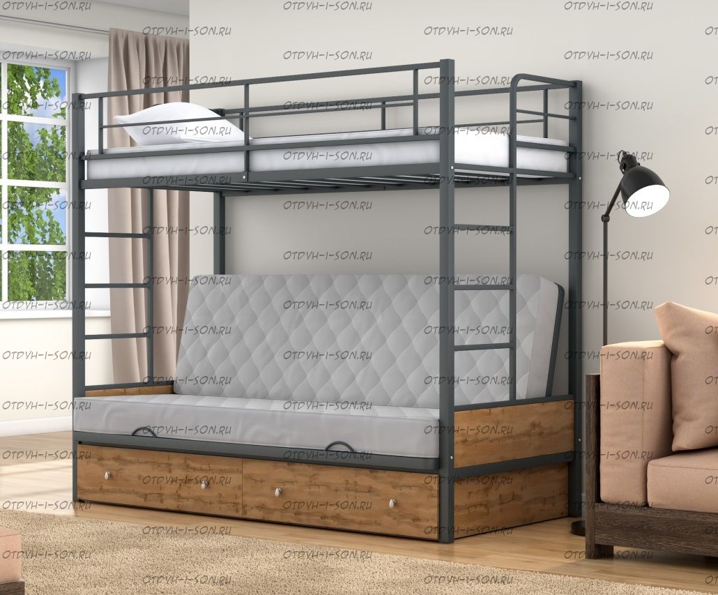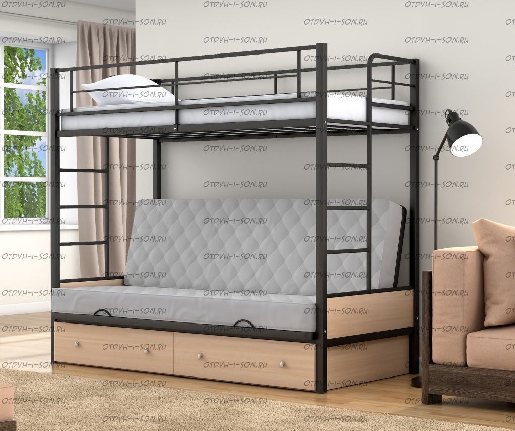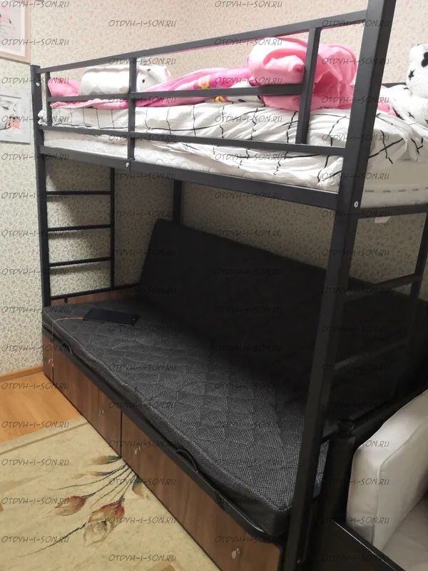 Кровать двухъярусная с диваном Дакар 1 Лофт с ящиками Характеристики: Размер спального места: 90х190 Размер спального места: 126х185 Внешние габариты в сложенном виде (ШхДхВ): 96х198х176 см. Внешние габариты в разложенном виде (ШхДхВ): 126х198х176 см. Ящики подкроватные: входят в комплект Материал каркаса: Металл (сертифицировано) Толщина профиля: 4х4 см. Нагрузка на спальное место 150 кг. Максимальная нагрузка: 300 кг. Механизм раскладки книжка. Нижний диван включен в стоимость: наполнение ППУ. Верхний матрас приобретается дополнительно. Так же за дополнительную плату можно заказать диван с блоком независимых пружин. Инструкция в комплекте Цвет кровати: Черный, Белый, Коричневый, Серый (цвет асфальта), Слоновая кость Цвет вставок: Дуб молочный, Дуб ватан или Венге, Белый Цвет наматрасника на матрасе: Рогожка: серый или бежевый