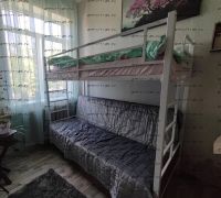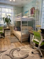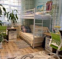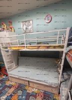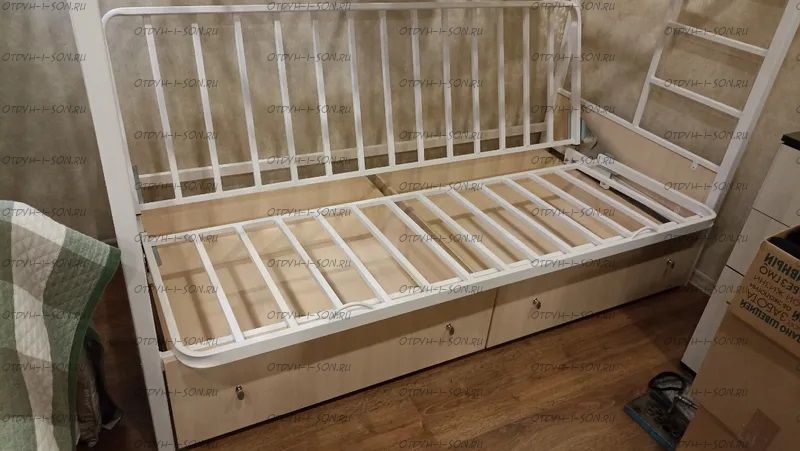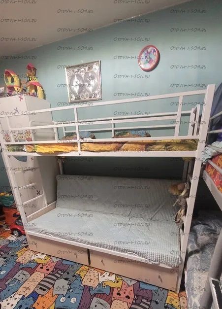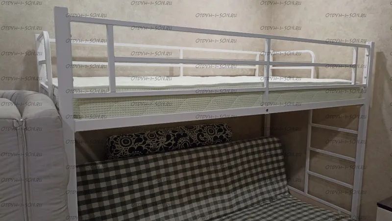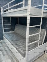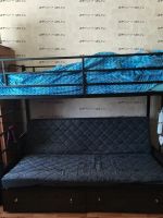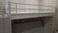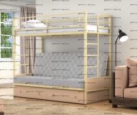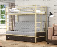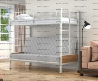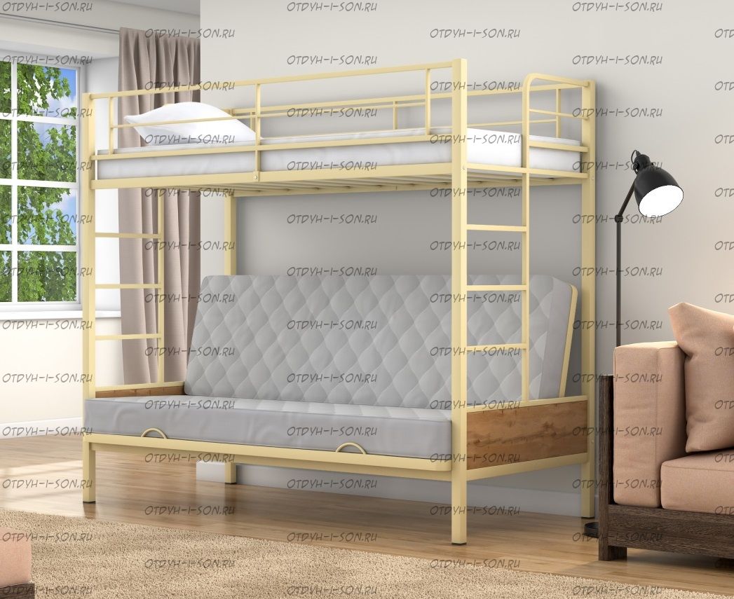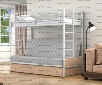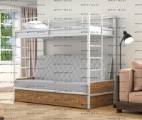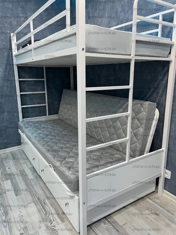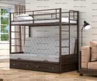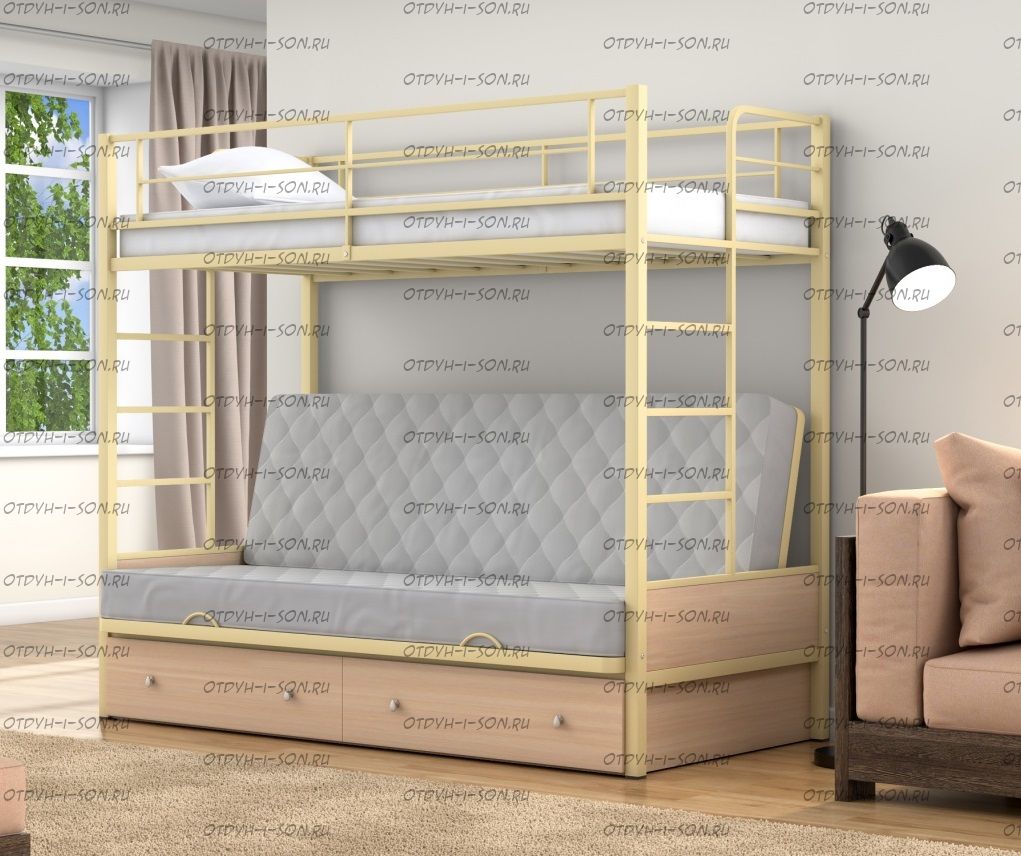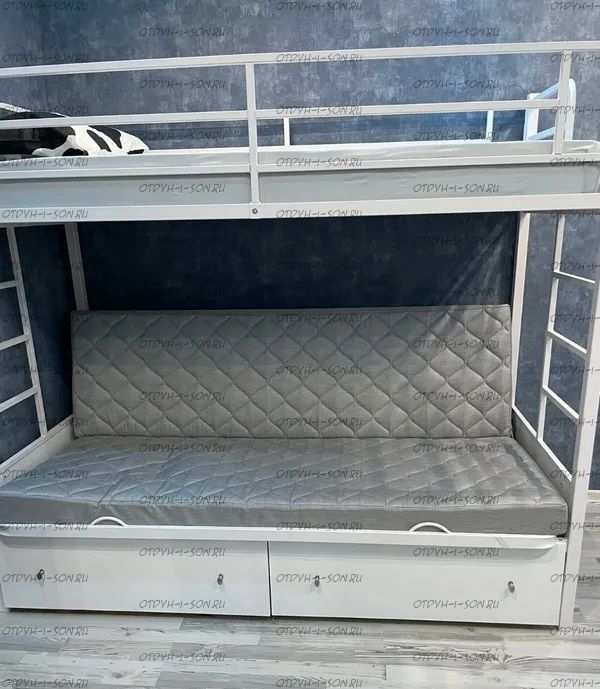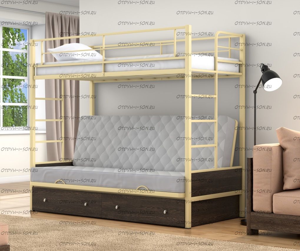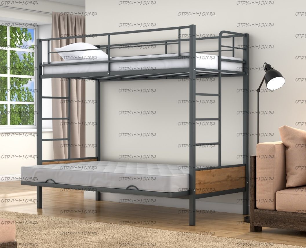 Кровать двухъярусная с диваном Дакар 1 Лофт с ящиками Характеристики: Размер спального места: 90х190 Размер спального места: 126х185 Внешние габариты в сложенном виде (ШхДхВ): 96х198х176 см. Внешние габариты в разложенном виде (ШхДхВ): 126х198х176 см. Ящики подкроватные: входят в комплект Материал каркаса: Металл (сертифицировано) Толщина профиля: 4х4 см. Нагрузка на спальное место 150 кг. Максимальная нагрузка: 300 кг. Механизм раскладки книжка. Нижний диван включен в стоимость: наполнение ППУ. Верхний матрас приобретается дополнительно. Так же за дополнительную плату можно заказать диван с блоком независимых пружин. Инструкция в комплекте Цвет кровати: Черный, Белый, Коричневый, Серый (цвет асфальта), Слоновая кость Цвет вставок: Дуб молочный, Дуб ватан или Венге, Белый Цвет наматрасника на матрасе: Рогожка: серый или бежевый