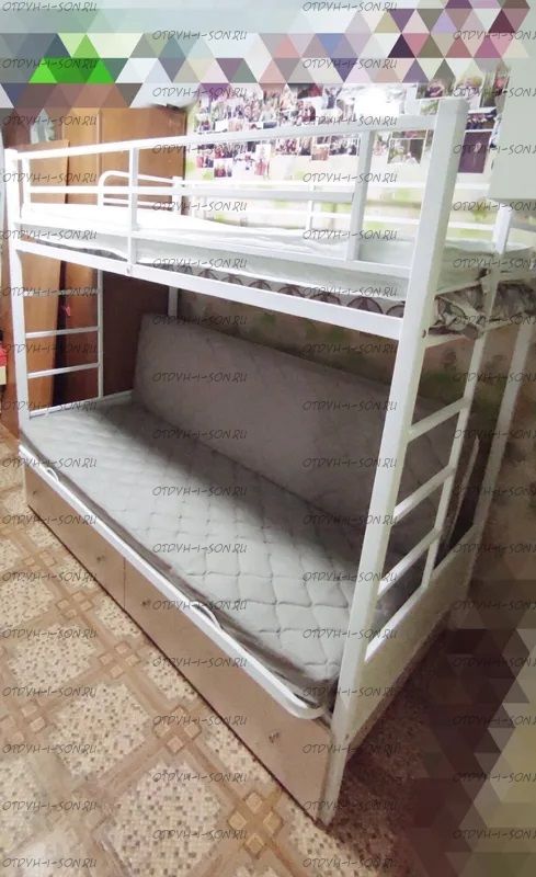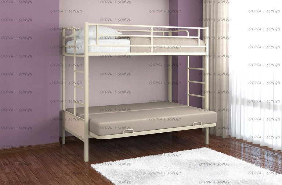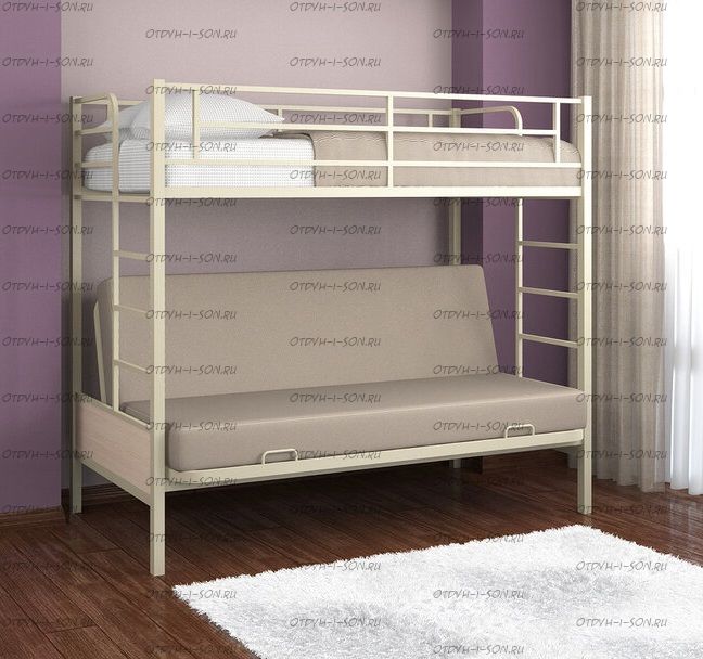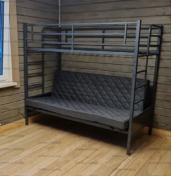 Кровать двухъярусная с диваном Дакар 1 Лофт с ящиками Характеристики: Размер спального места: 90х190 Размер спального места: 126х185 Внешние габариты в сложенном виде (ШхДхВ): 96х198х176 см. Внешние габариты в разложенном виде (ШхДхВ): 126х198х176 см. Ящики подкроватные: входят в комплект Материал каркаса: Металл (сертифицировано) Толщина профиля: 4х4 см. Нагрузка на спальное место 150 кг. Максимальная нагрузка: 300 кг. Механизм раскладки книжка. Нижний диван включен в стоимость: наполнение ППУ. Верхний матрас приобретается дополнительно. Так же за дополнительную плату можно заказать диван с блоком независимых пружин. Инструкция в комплекте Цвет кровати: Черный, Белый, Коричневый, Серый (цвет асфальта), Слоновая кость Цвет вставок: Дуб молочный, Дуб ватан или Венге, Белый Цвет наматрасника на матрасе: Рогожка: серый или бежевый