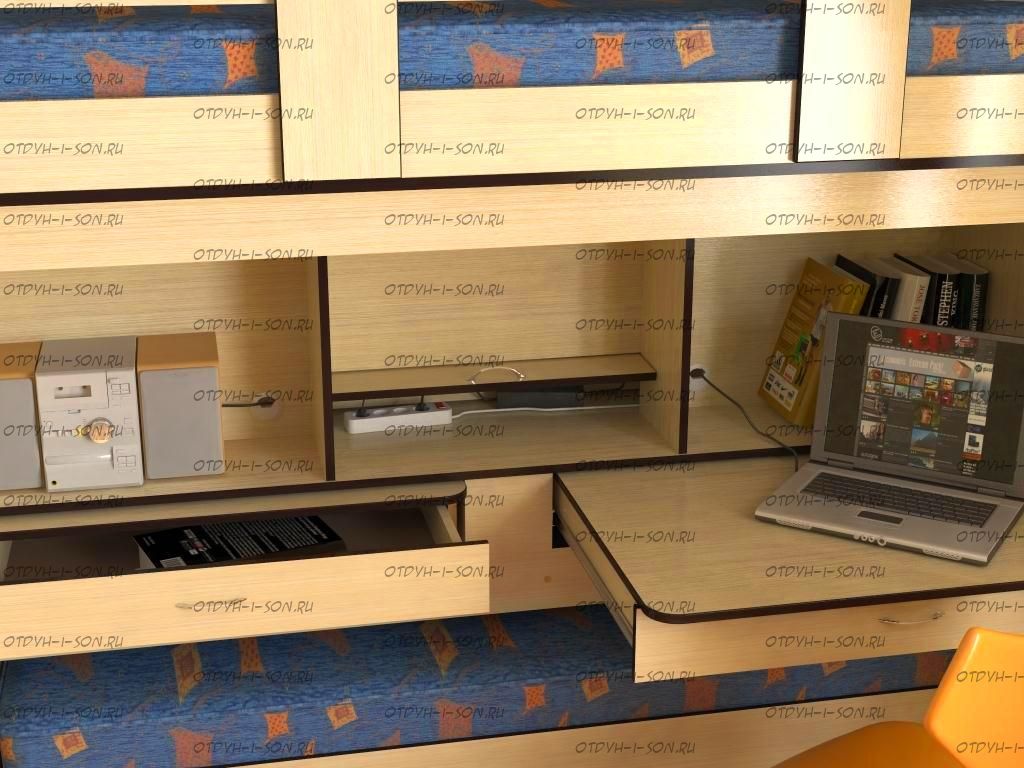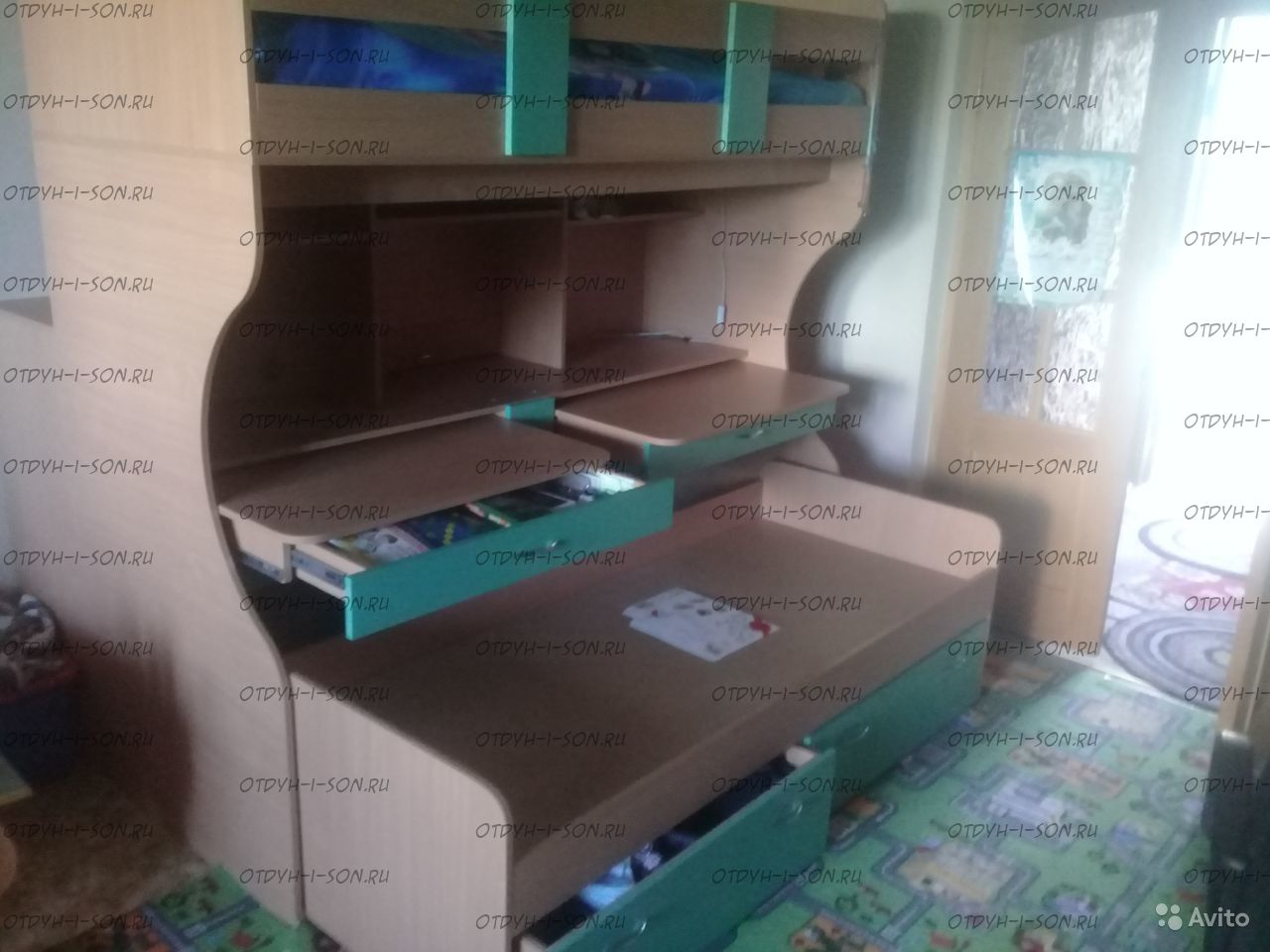 Кровать двухъярусная трансформер Дуэт-4 Характеристики: Размер верхнего спального места: 80х190 Размер нижнего спального места: 75х185 Внешние габариты (ДхШхВ): 234 х 125 х 193 Высота верхнего спального места без матраса-1520мм. Высота нижнего спального места без матраса-355мм. Высота ящика нижней кровати-150мм.,глубина 600мм. Подиум глубиной 400мм.,высотой 1100мм. Гарантия, год 2 Материал ЛДСП Высота борта: Ширина лестницы: Складская программа глубина ящиков (высота полезного места) - 13 см длина ящиков при выдвижении: верхний - 35см, остальных - 50см ширина полок под столом - 62,3см глубина полок под столом - 24.4см столешница ширина - 86,2см столешница длина - 69см деталь под столами не выдвигается и не поднимается. На фотографии видны места, где вкручиваются саморезы. Вес кровати двухъярусной «Дуэт-4» 275 кг. Объем: 1 кубический метр Возможные варианты расцветок: Любой цвет корпуса Вы можете скомбинировать с любым цветом фасада. К нижней кровати вы можете приобрести дополнительный съемный бортик, который убережет ребенка от падения.