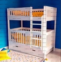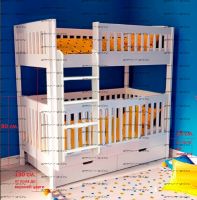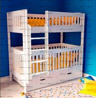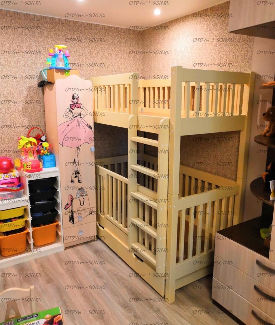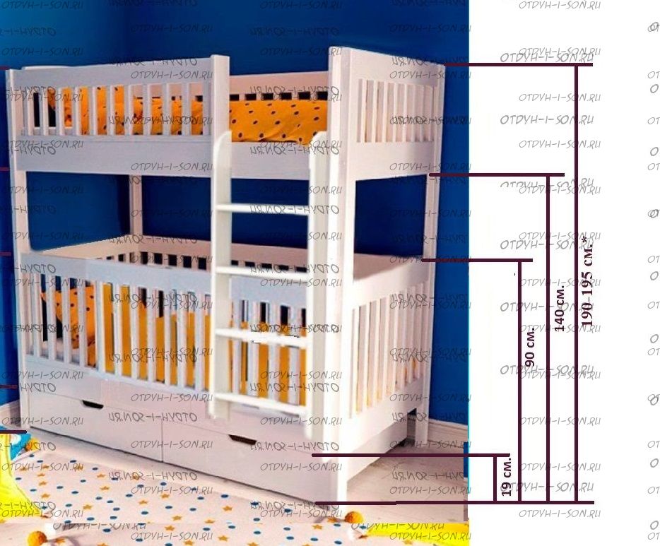 Кровать двухъярусная Малинка №7 Характеристики: Размер спального места: спальные места одинаковые по размеру Длина спального места: 160 см., 170 см., 180 см., 190 см., 200 см. или любой другой на Ваш выбор Ширина спального места: 70 см., 80 см., 90 см. или любой другой на Ваш выбор Возможно добавление калитки Материал: сосна Высота бортика нижнего яруса кровати от пола: 90 см. Высота до начала нижней царги (боковины): 19 см. Матрас первого яруса кладется на уровне 26,5 см. от пола Высота от пола до верхней царги: 140 см. Матрас второго яруса кладется на уровне 146,5 см. от пола Высота полностью всей кровати от пола примерно 200-205 см. (Данные размеры можно немного менять вверх и вниз). Ящики на колесиках , их можно полностью выдвигать и мыть полы Основание: поперечные брусья массив, ДВП 4-5 мм. Ящики каркас: березовая фанера 12 мм, дно ДВП 4-5 мм, выкатная система (4 колесика) - к кровати не фиксируется Ящики фасад: березовая мебельная фанера 12-16 мм, массив сосны Покрытие: Sayerlack (Италия), Renner (Италия) Внимание: возможно увеличение высоты бортиков кровати! Цвет: орех, бук, венге, груша, дуб, каштан, клен, красное дерево, махагон, ольха, сосна, белый (эмаль), слоновая кость (эмаль)